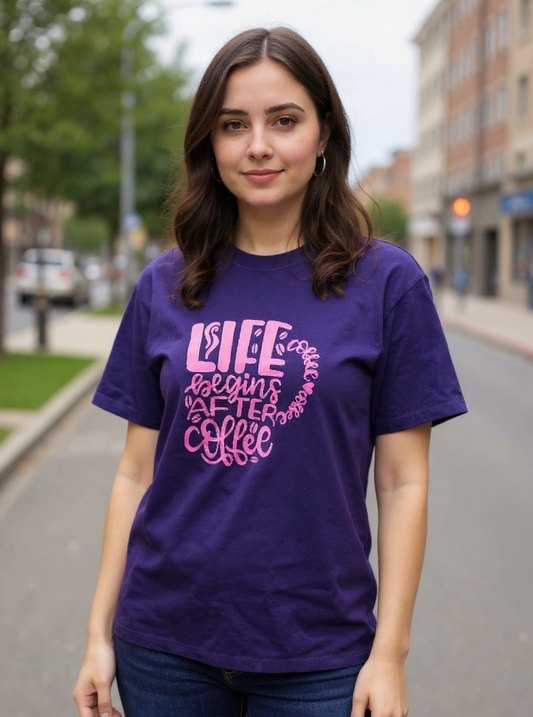 Size XL 100% cotton Purple Life begins after coffee Tshirt