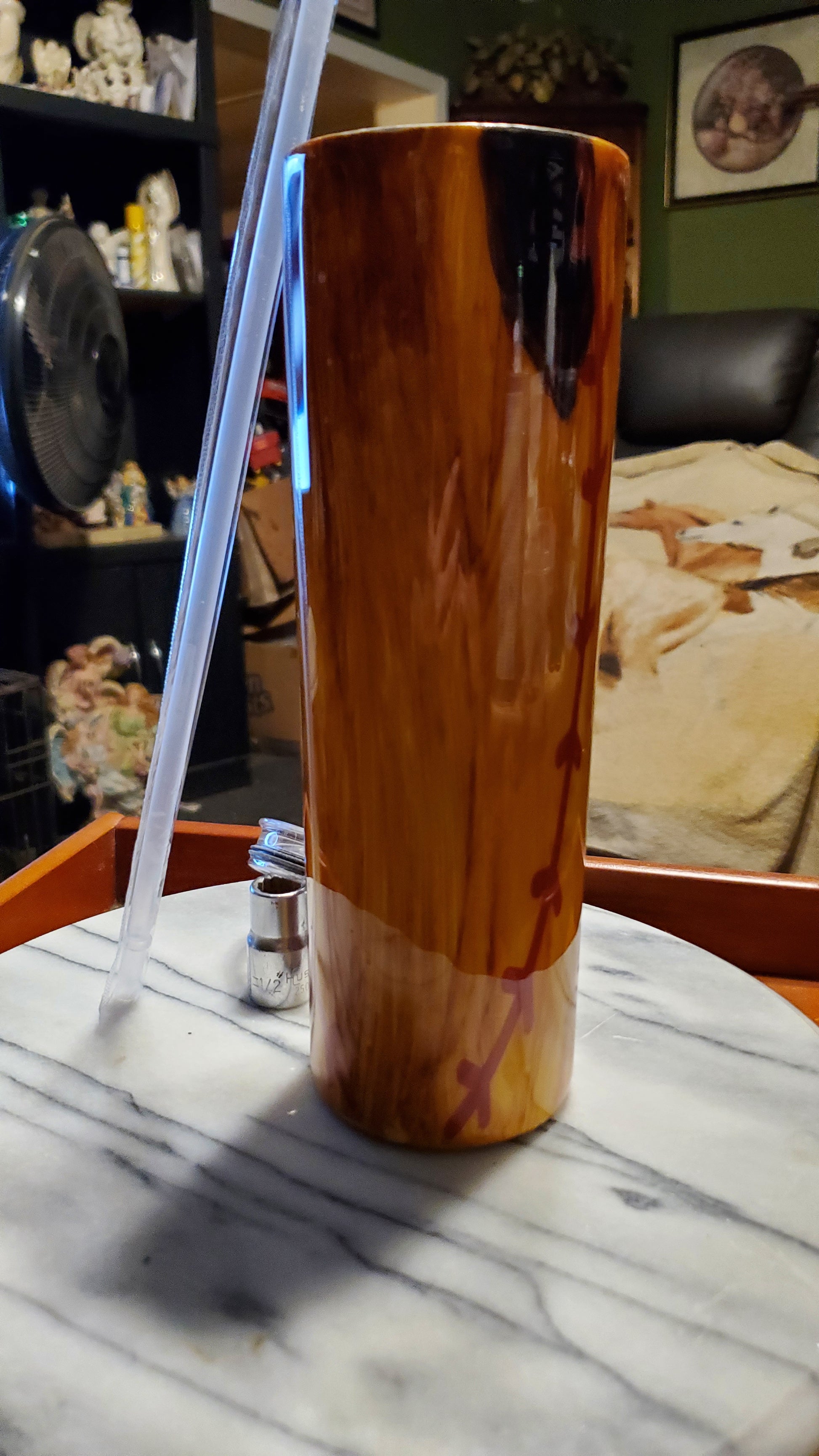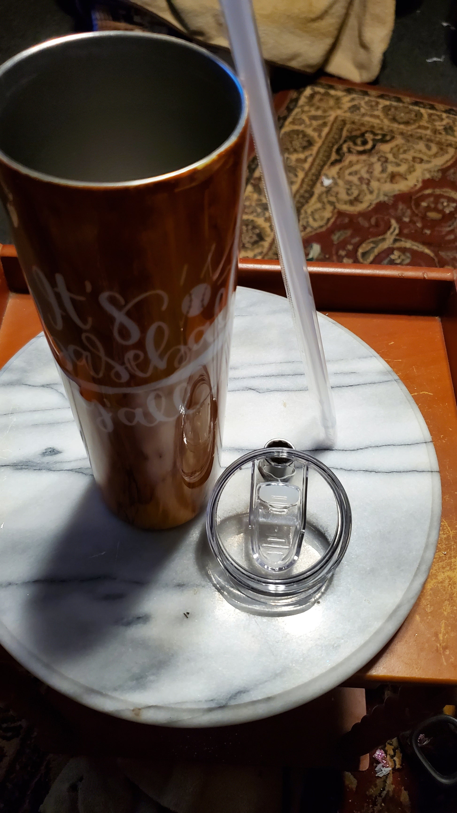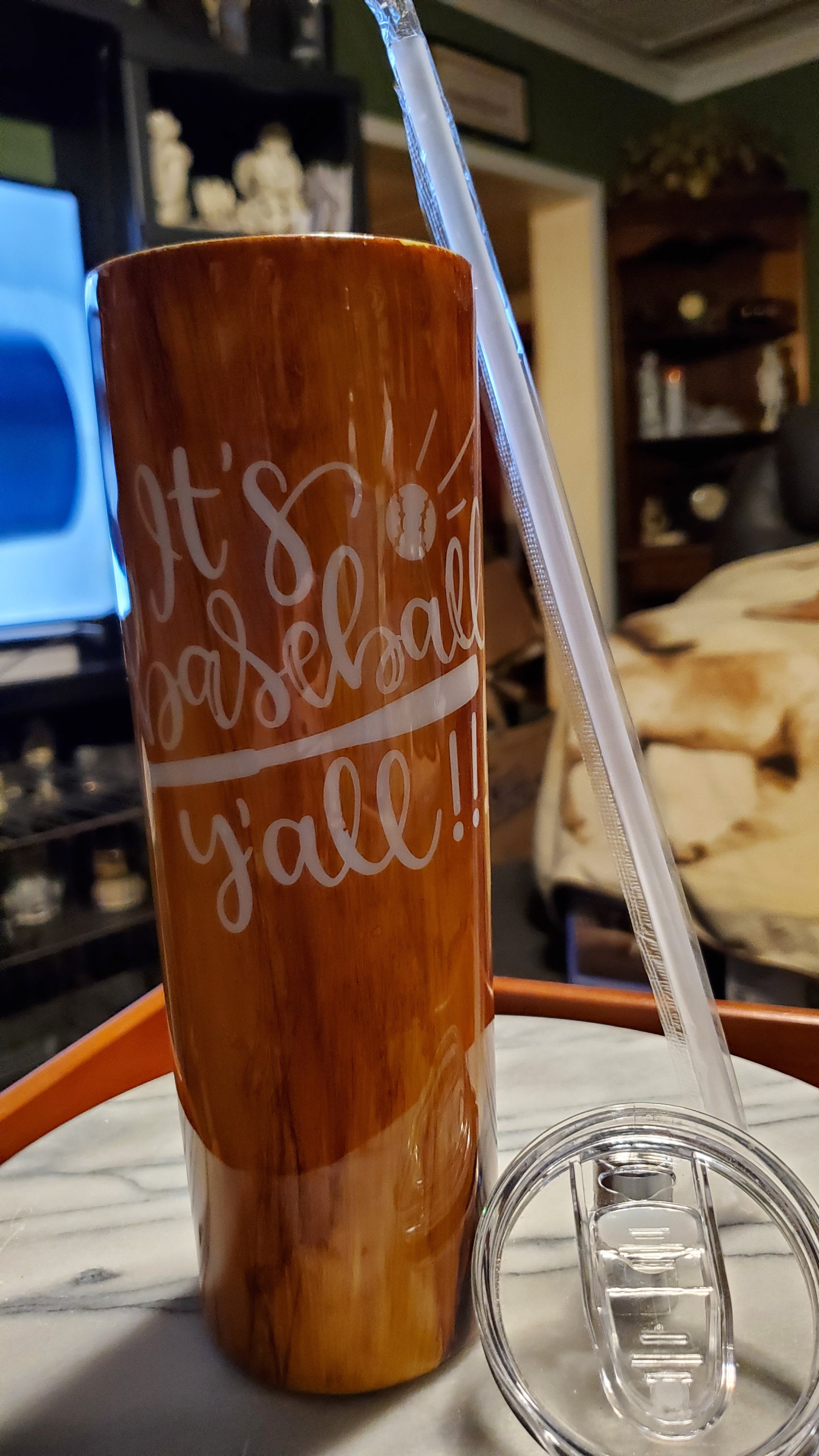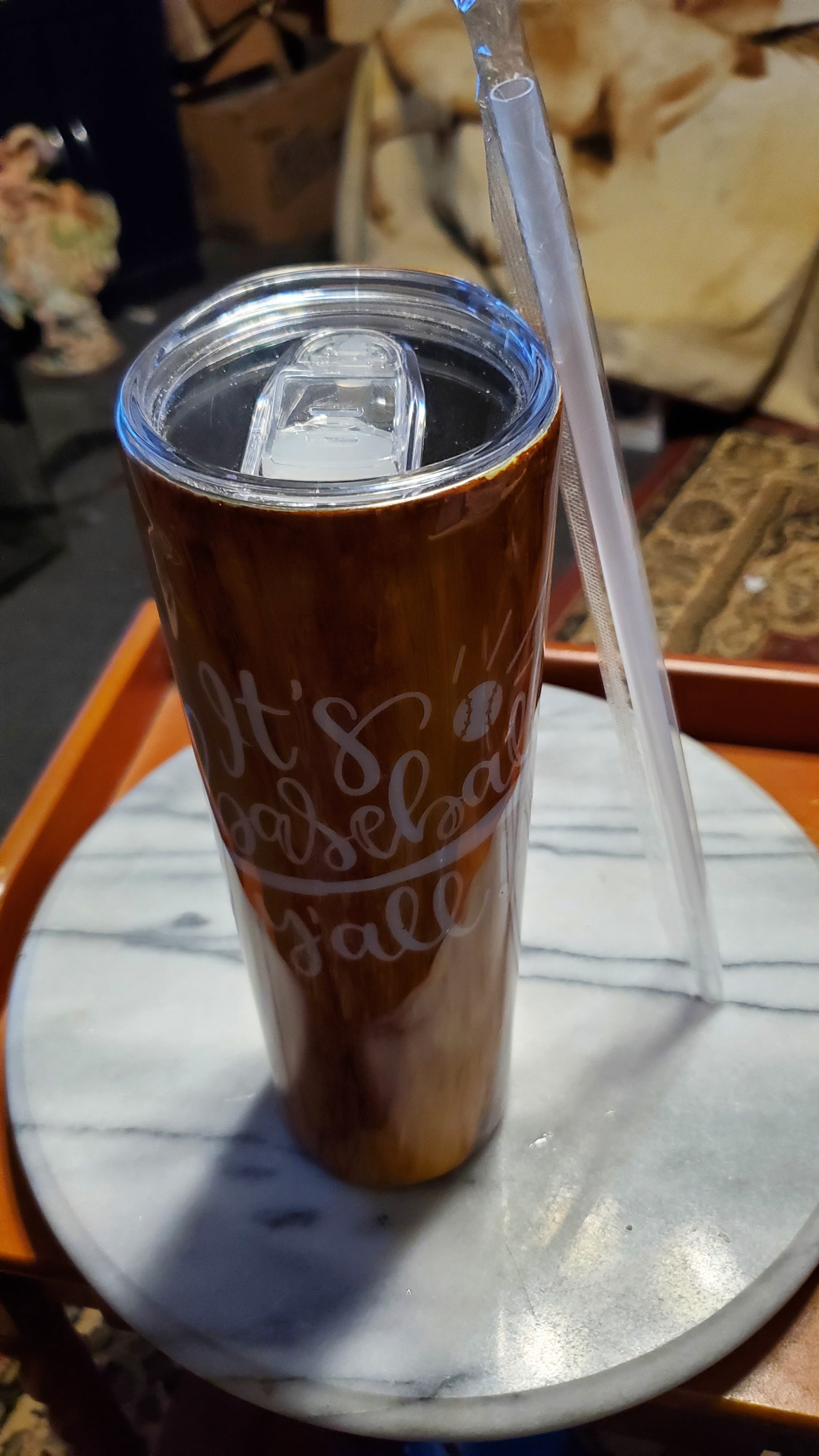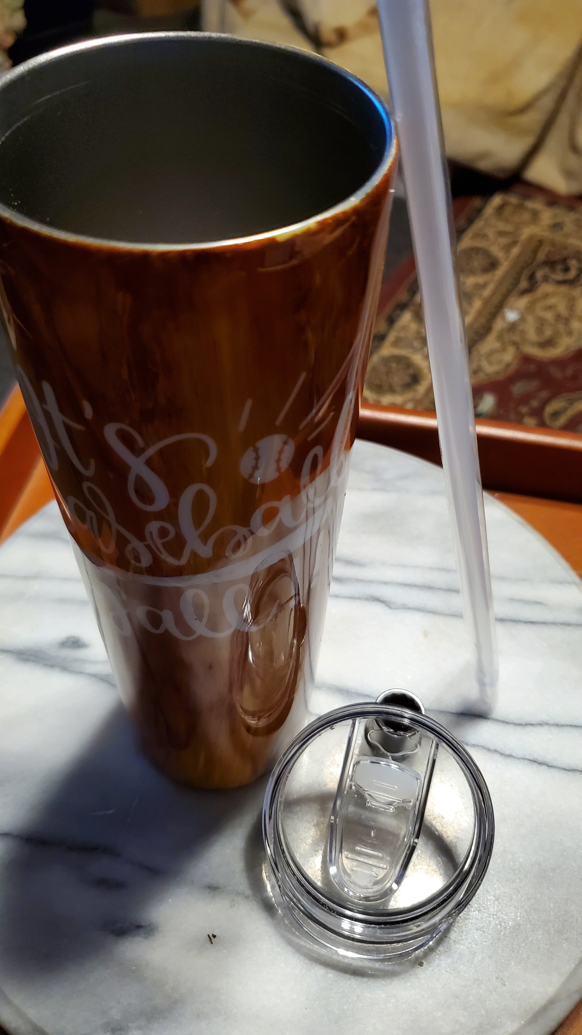 30 0z It's baseball you'll hogg Stainless steel tumbler cup.Keeps drinks cold or hot for hours. Don't put it in the dishwasher, microwave, freezer or direct sunlight. Hand wash only in warm water.