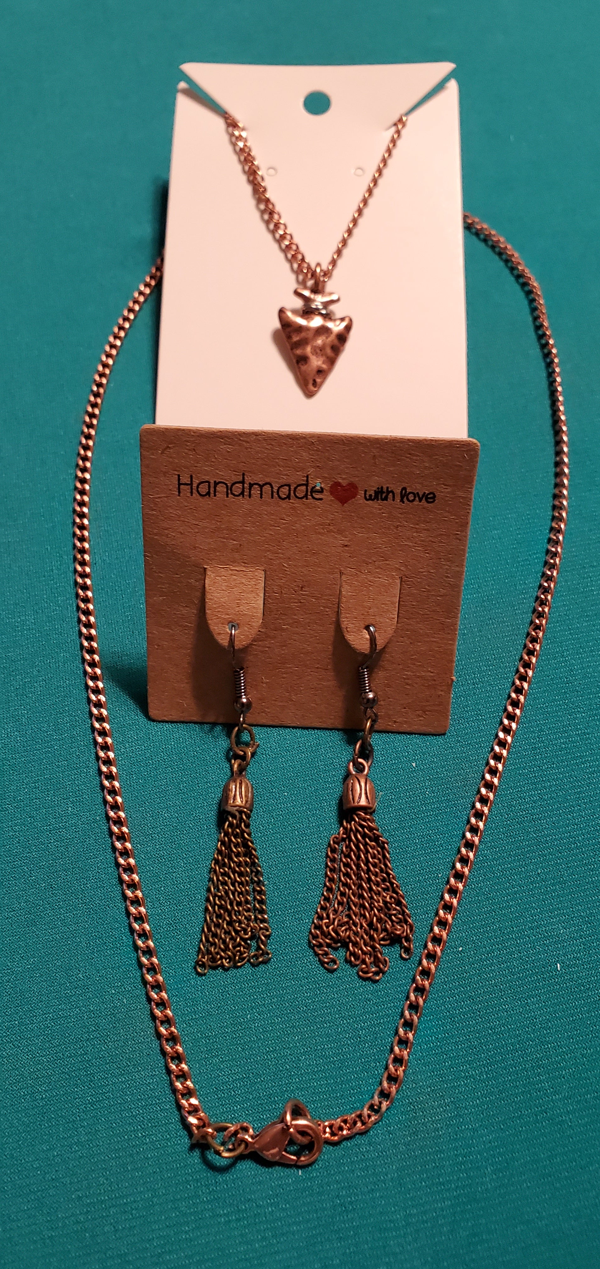 Bronze plated arrowhead necklace and earrings. You can get the set for $10.00 or the necklace for $5.00 and the earrings for $5.00.