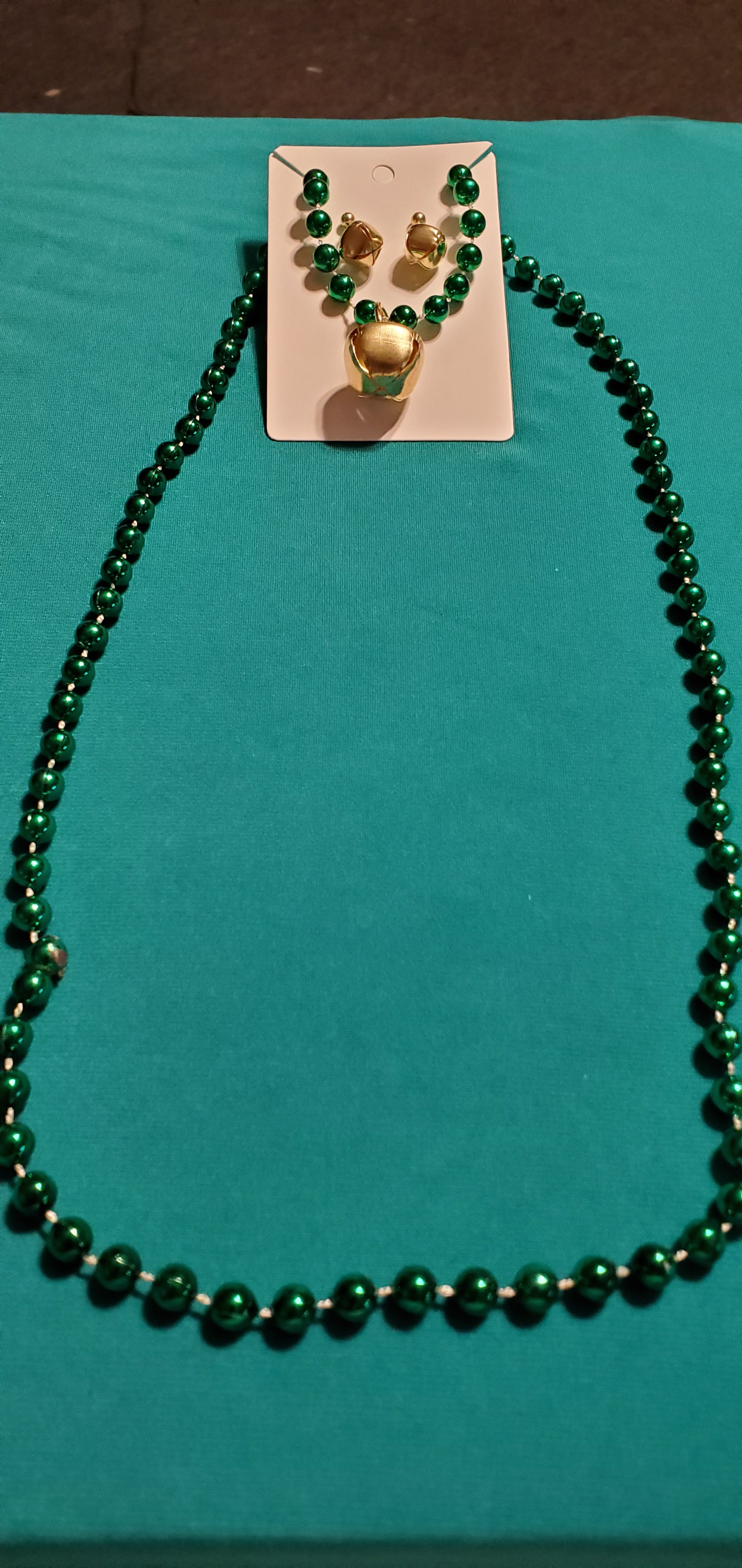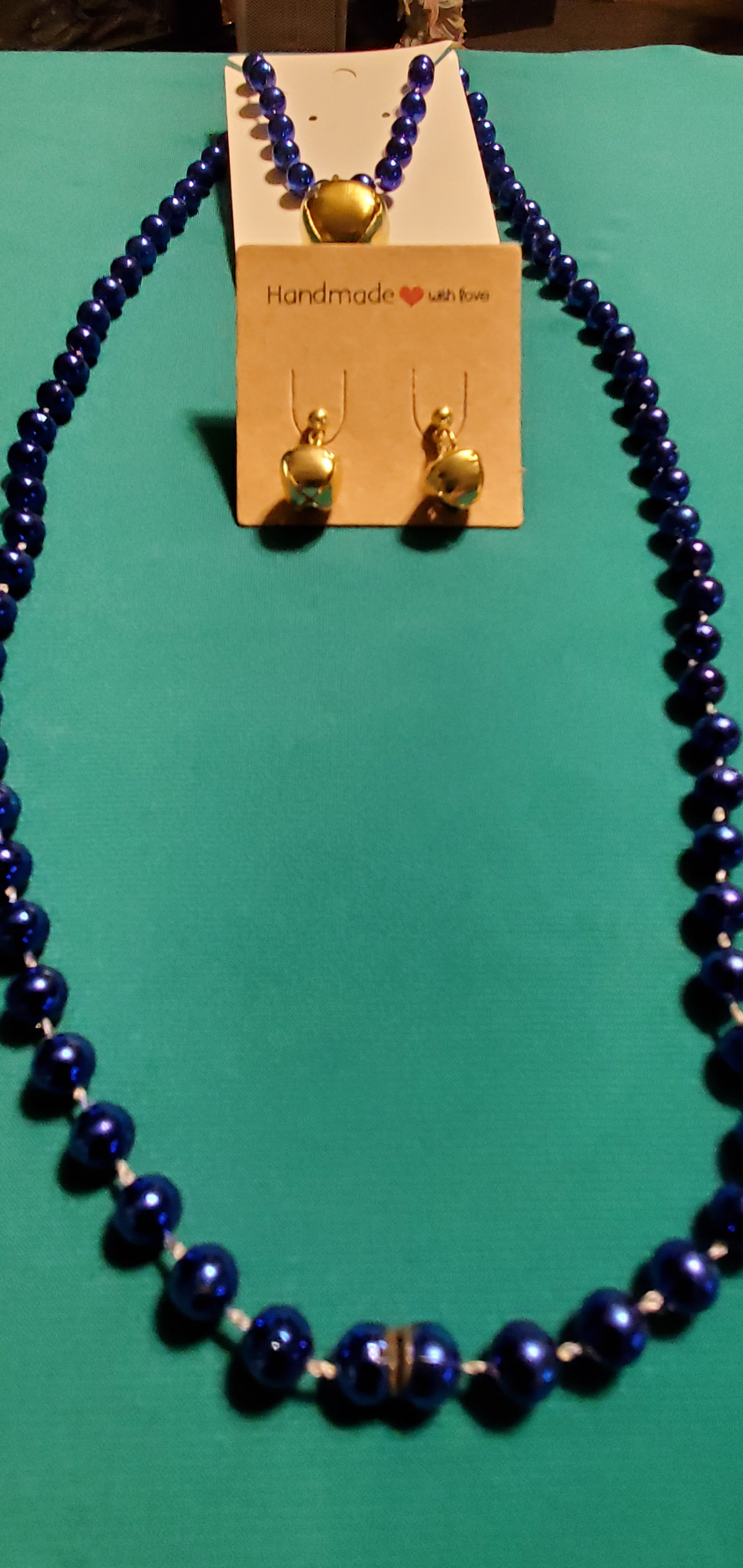 Christmas bells on blue beaded necklace and earrings. You can get the set for $10.00 or the necklace for $5.00 and also the earrings for $5.00.