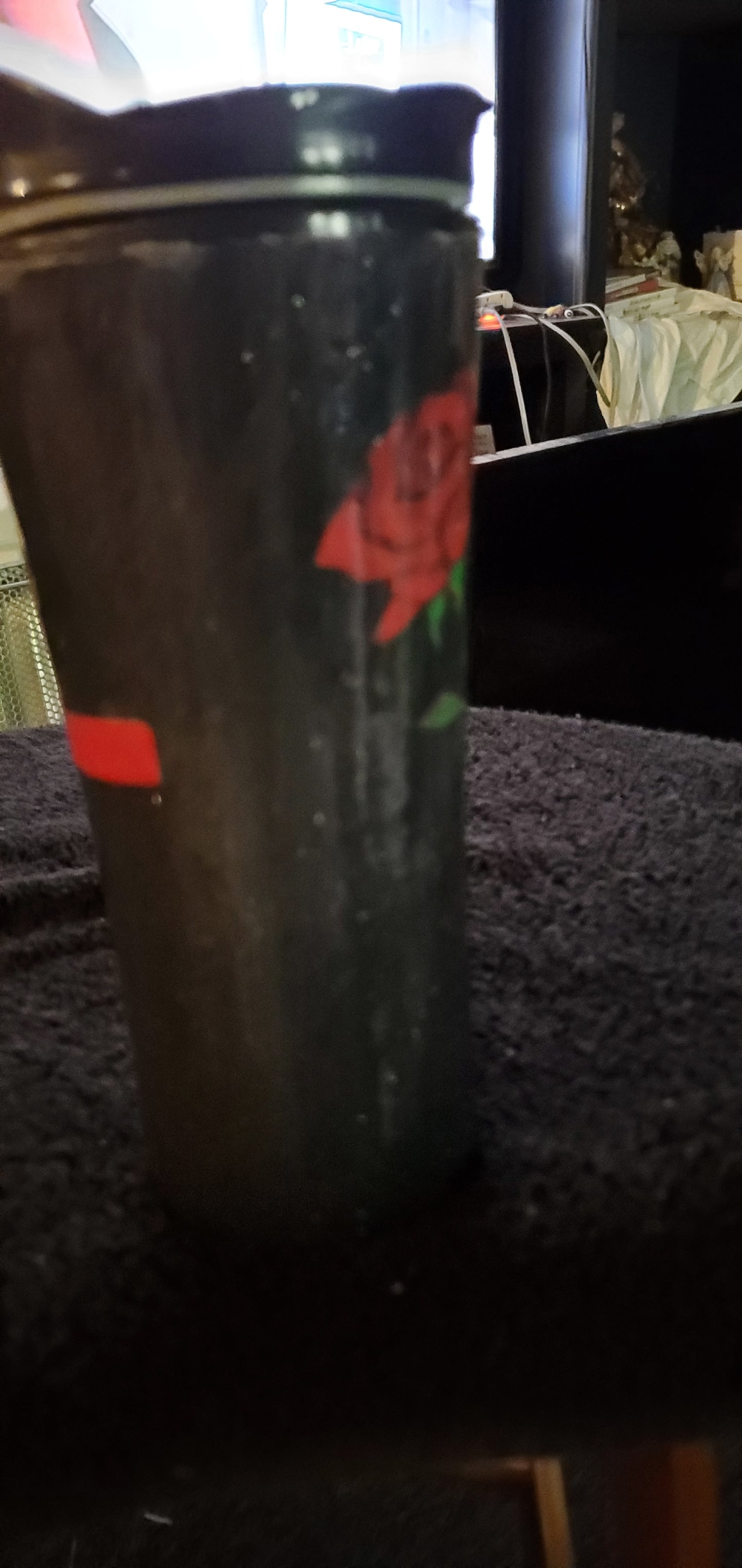 Black personalized 20 oz travel cup with flowers on one side and the letter D on the other.I can put a name with the letter D on this cup.I can make all letters and names on these cups.Do not put in dishwasher. Hand wash only.I make personalized cups,different colors, sizes and designs.