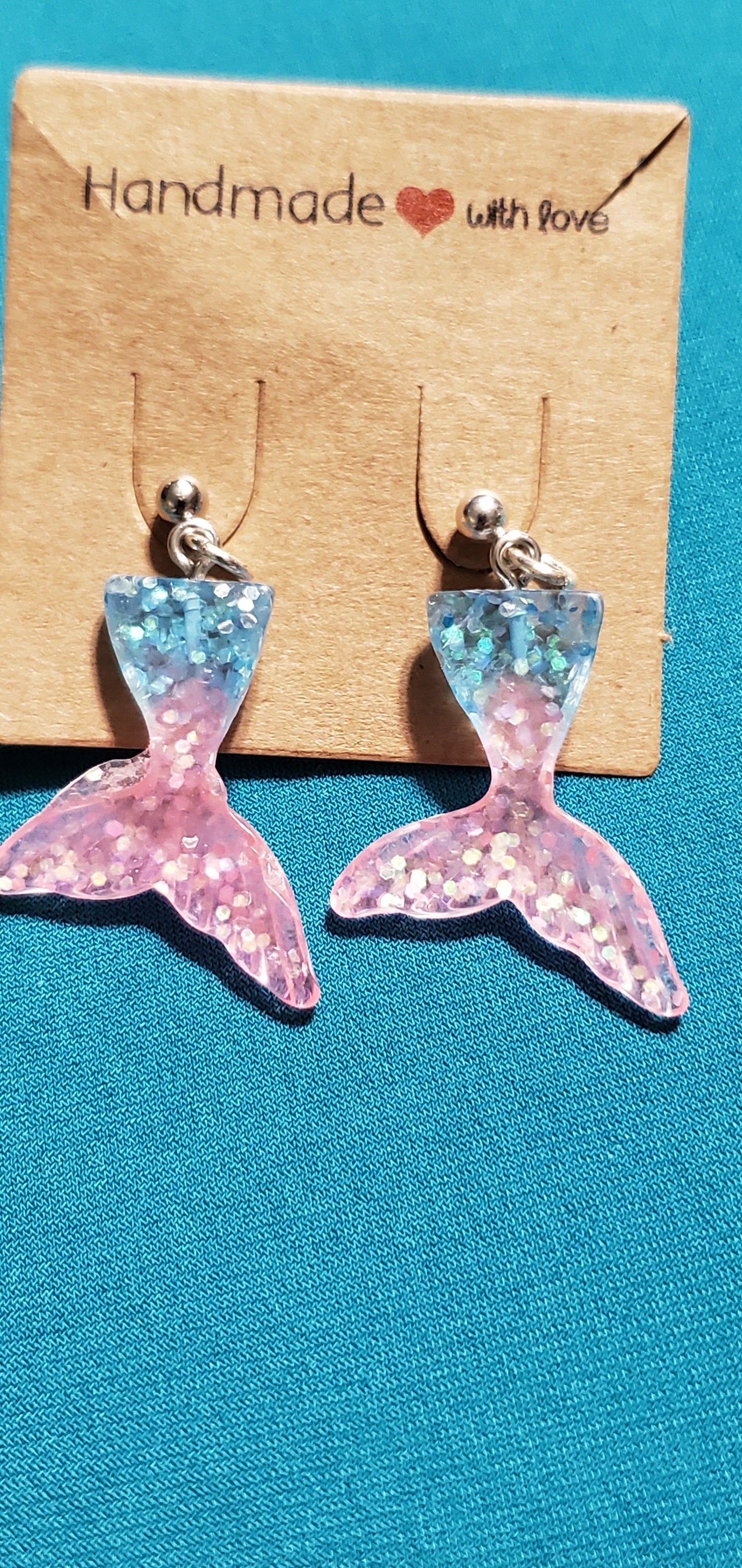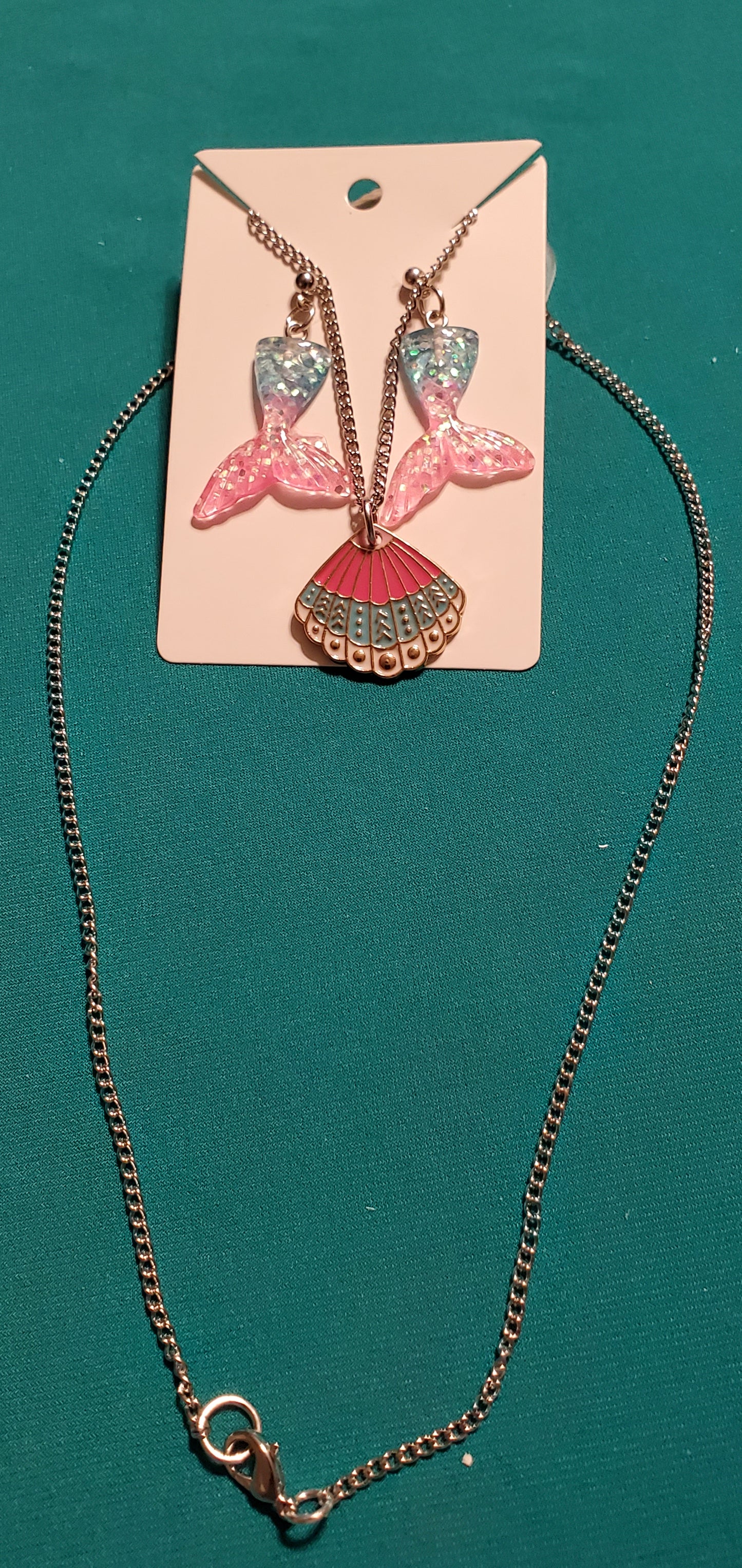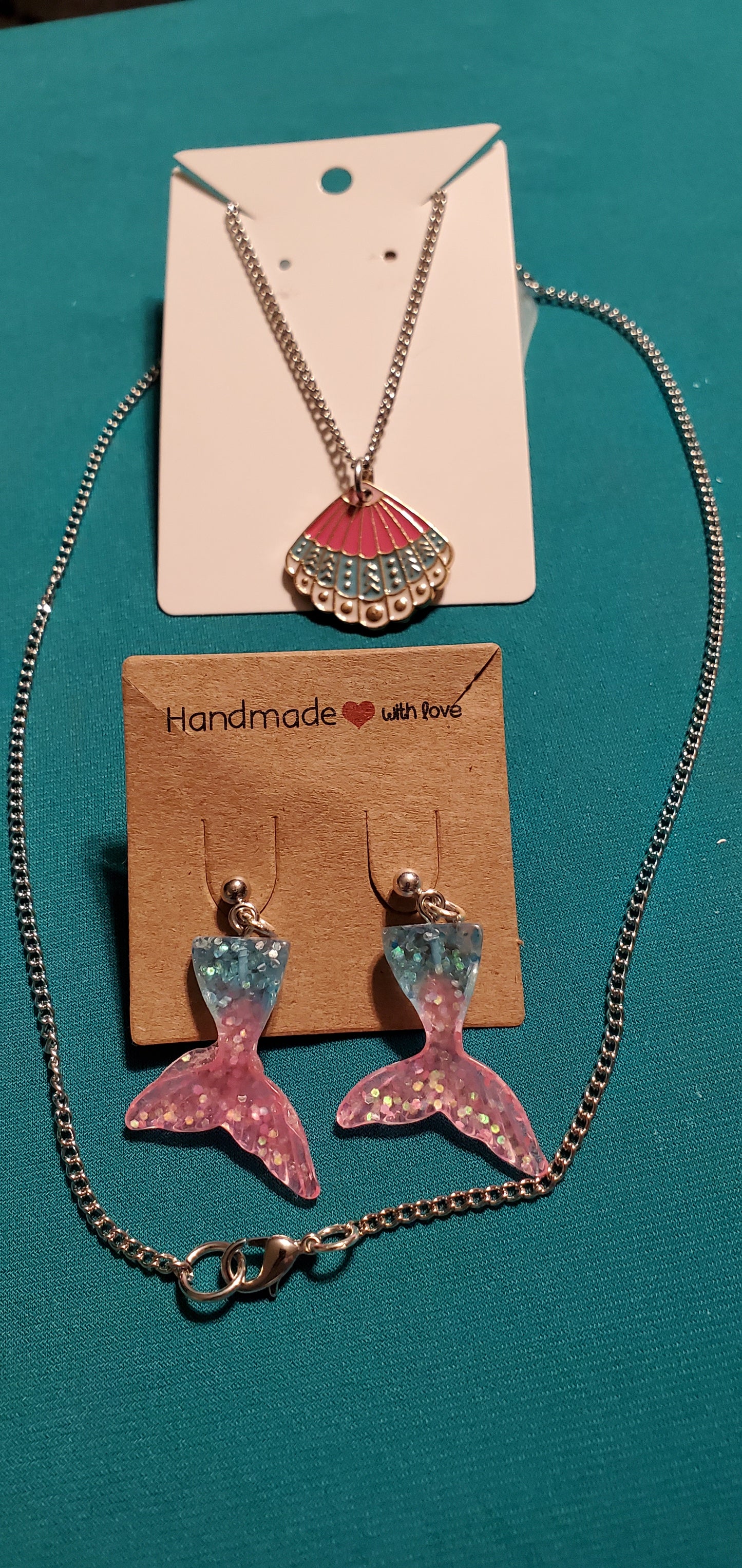Silver plated sea shell necklace and mermaid tail earrings. You can get the set for $5.00 or the necklace for $5.00 and also the earrings for $10.00.