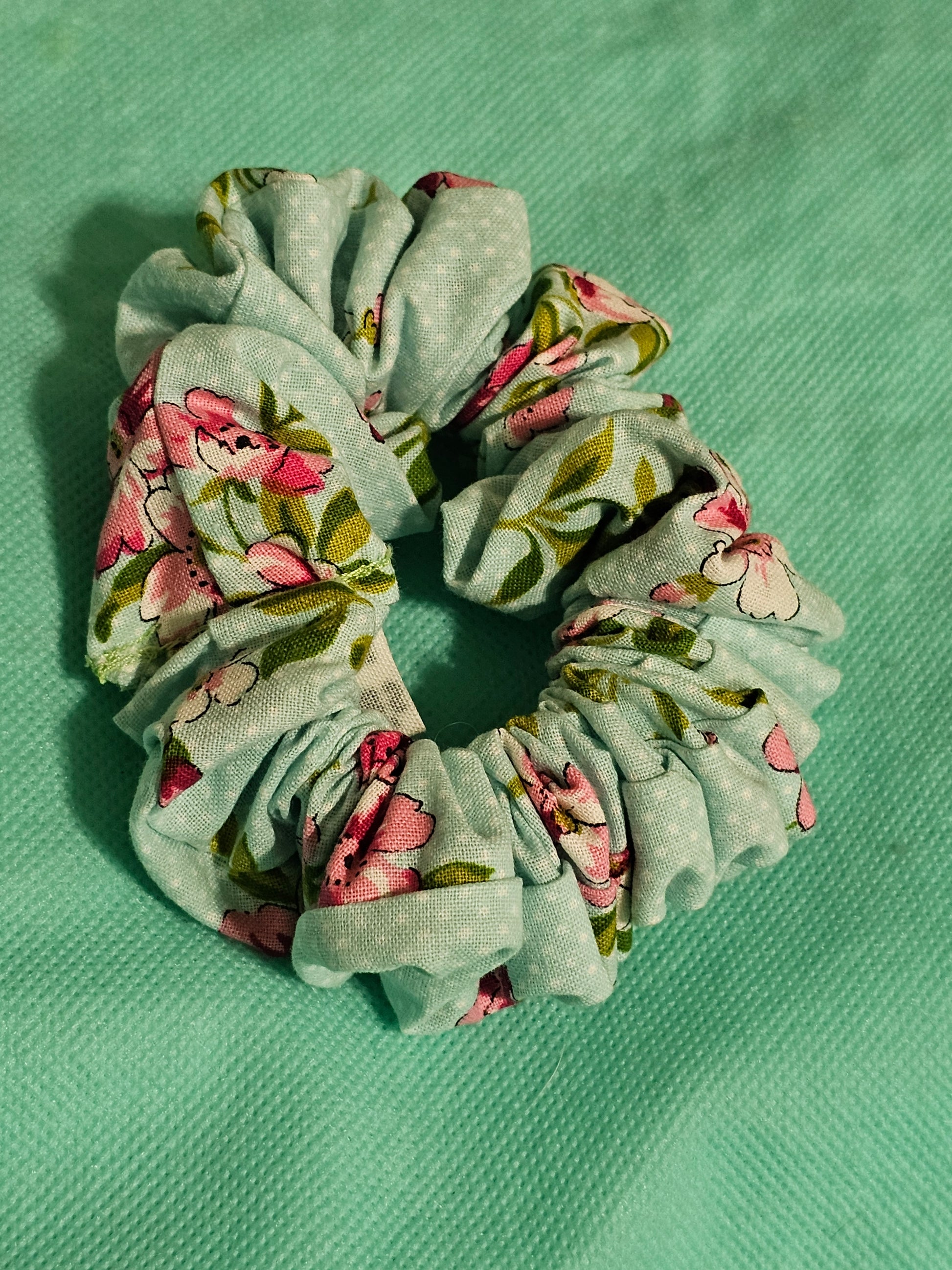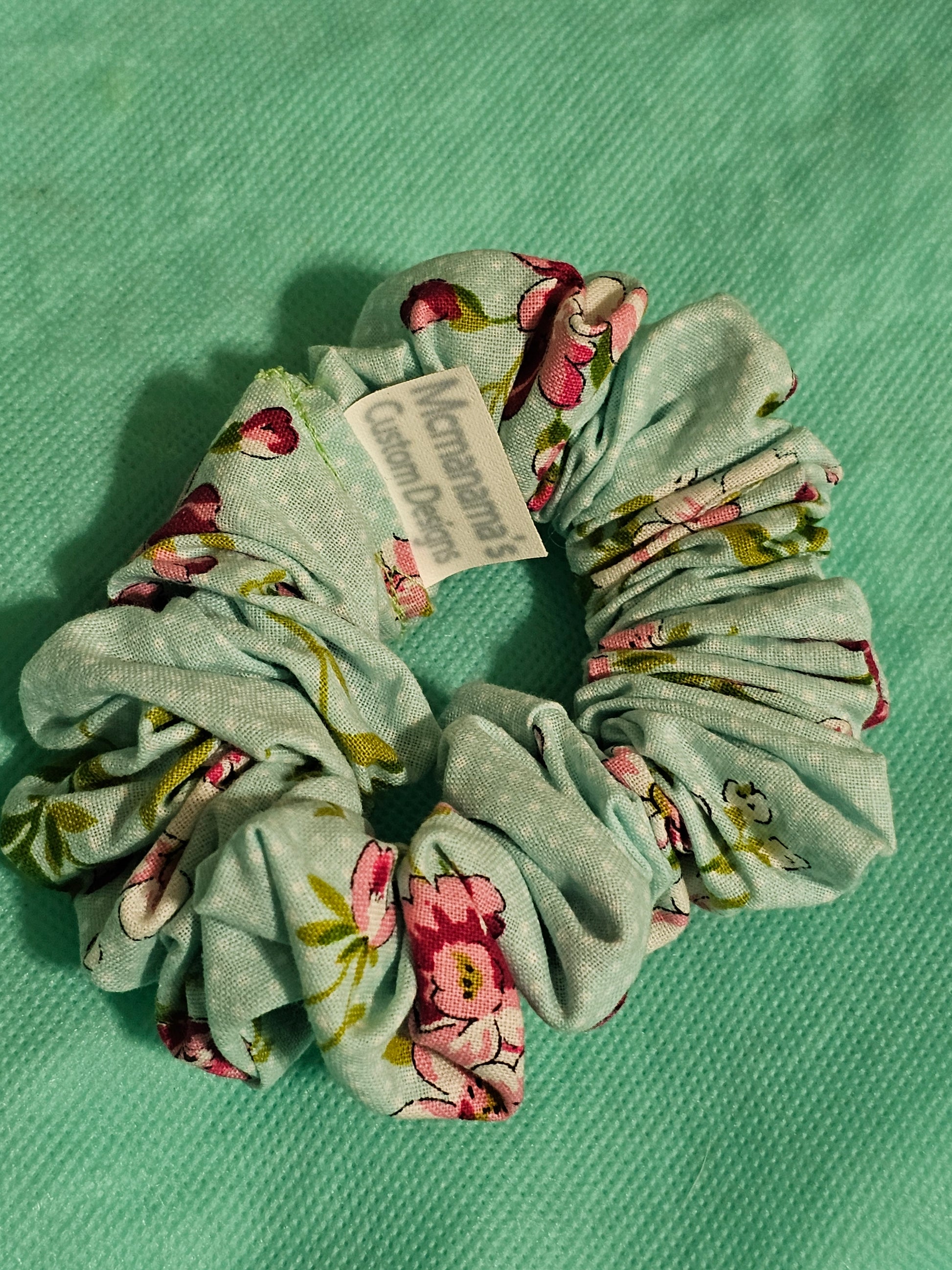 This scrunche is expertly crafted with a standard light green fabric and adorned with delicate flower designs. Its standard size makes it suitable for all hair types, providing a versatile accessory for any hairstyle. Add a touch of elegance and style to your look with this beautiful scrunche.