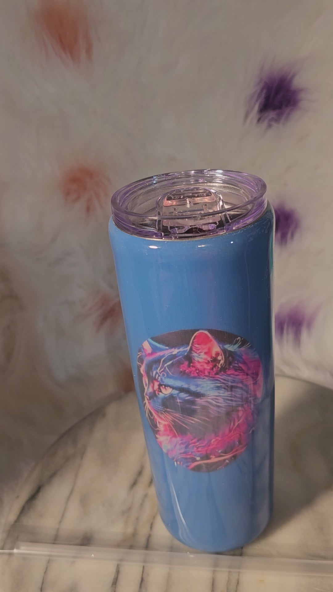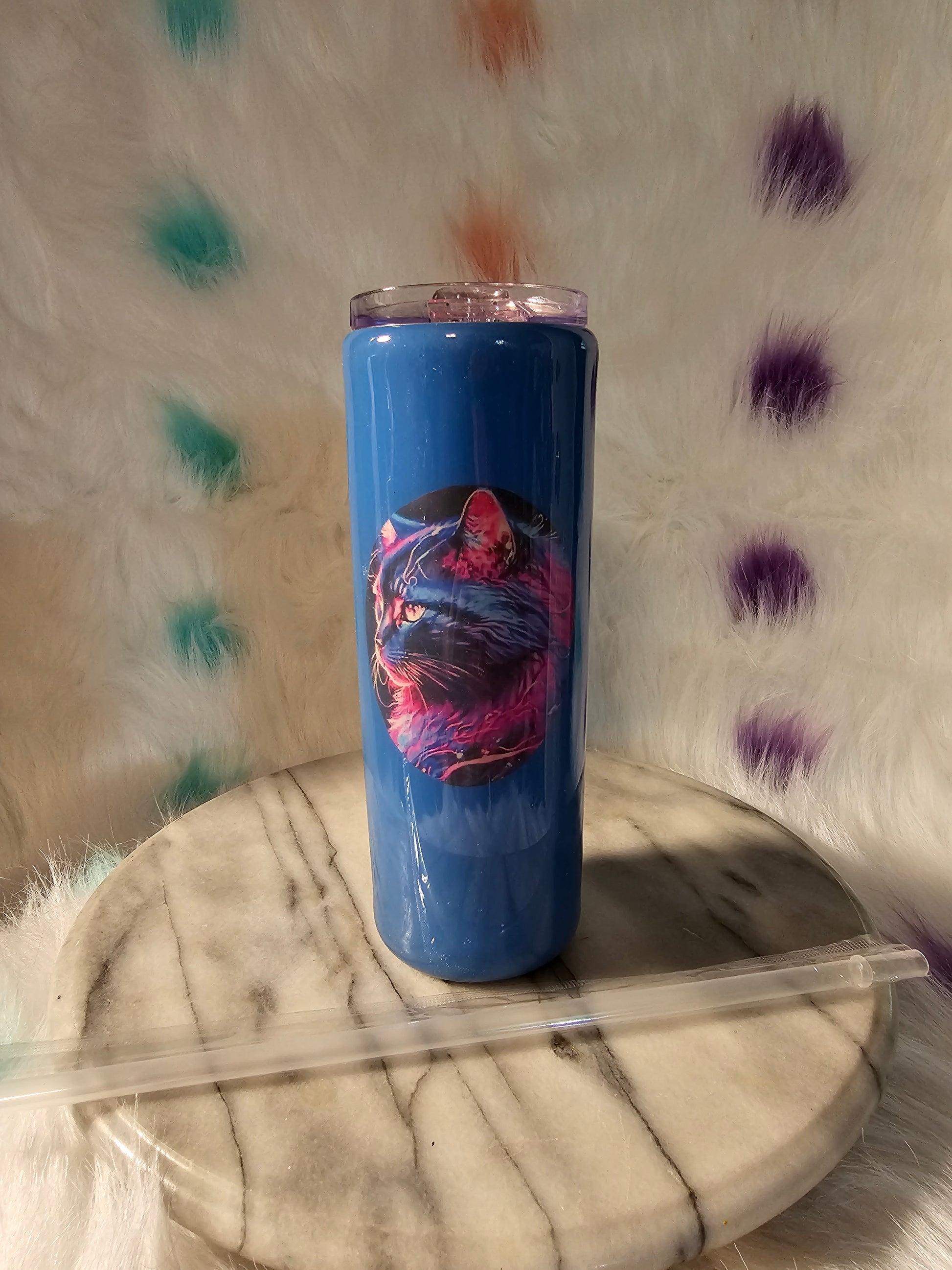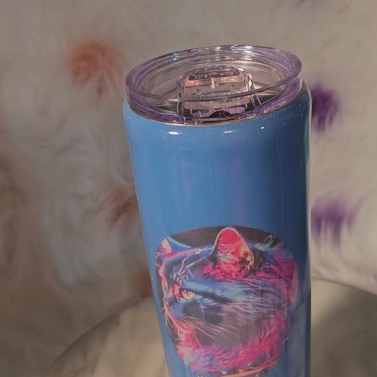 20 Oz Cat double wall stainless steel tumbler cup.Keeps drinks cold or hot for hours. Don't put it in the dishwasher, microwave, freezer or direct sunlight. Hand wash only in warm water. Ready to go cup.I can also put your name on it.