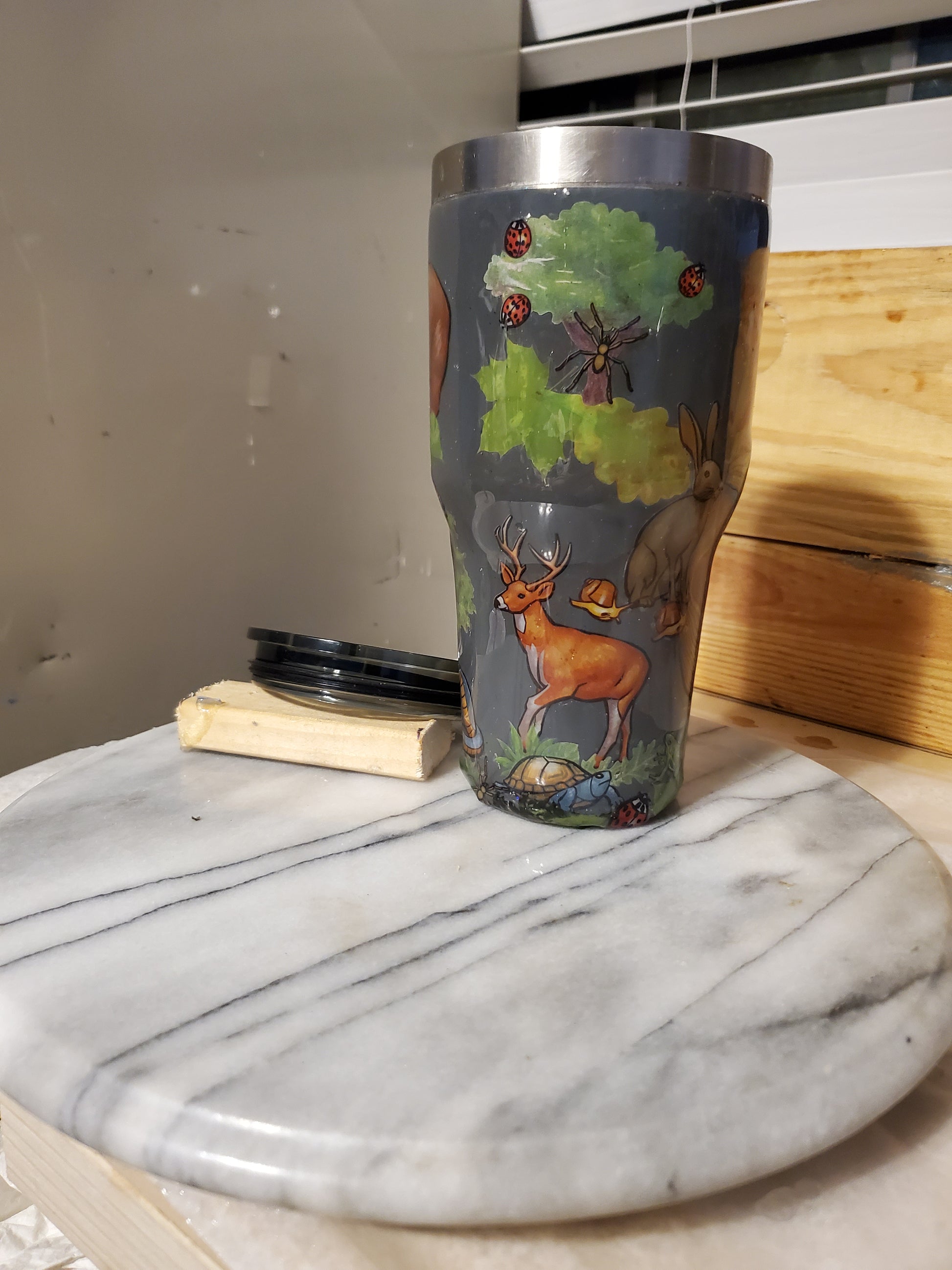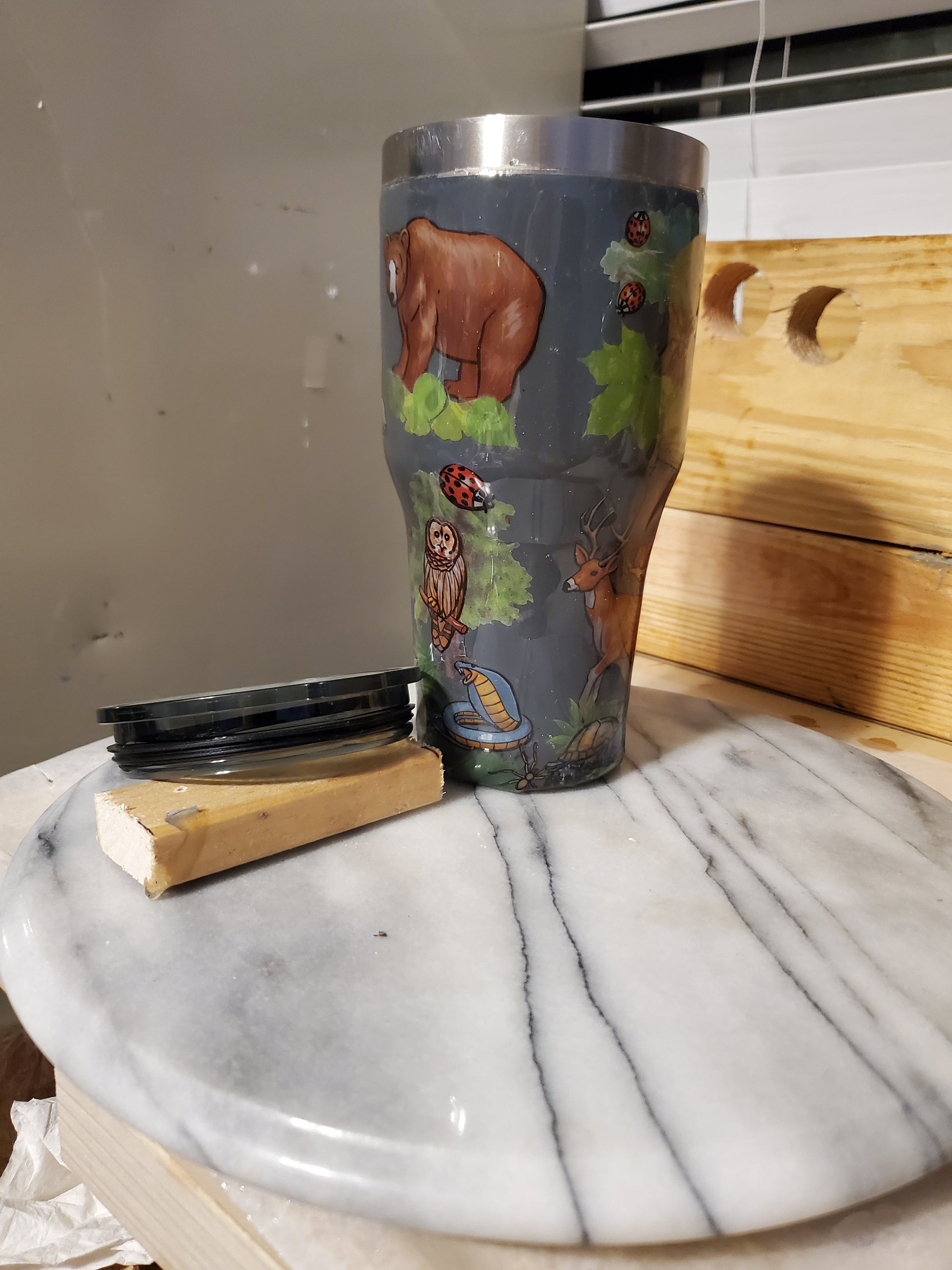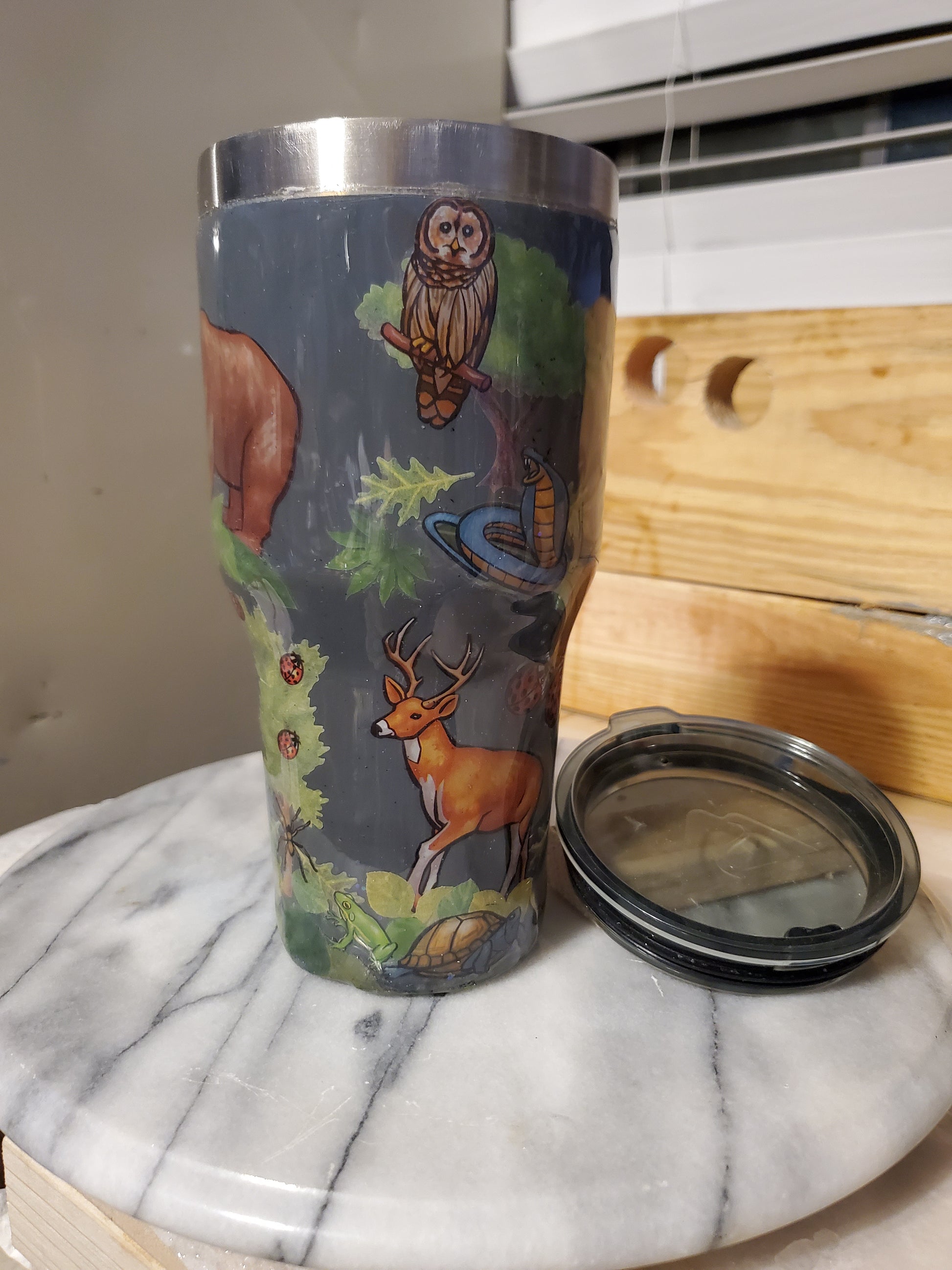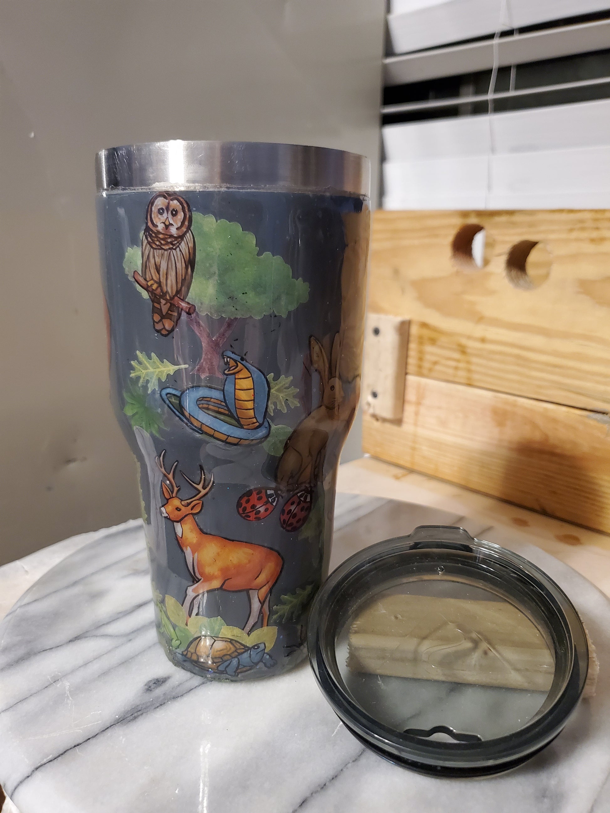 30 0z My zoo Double walled insulated Stainless steel tumbler cup.Keeps drìnks cold for 24 hours and drinks hot for 6 hours. Don't put it in the dishwasher. Hand wash only.I can put your name on it or a personal designs.