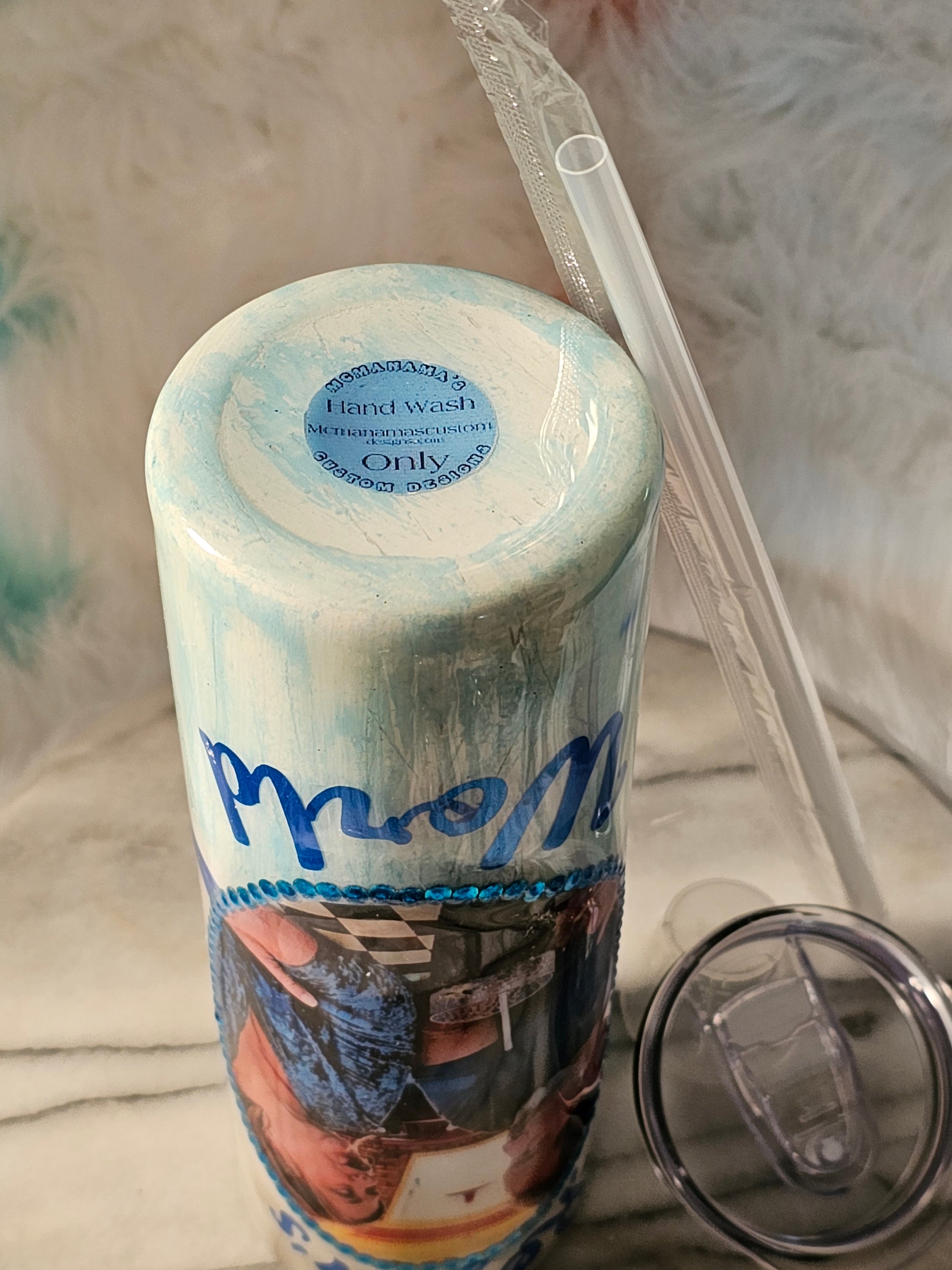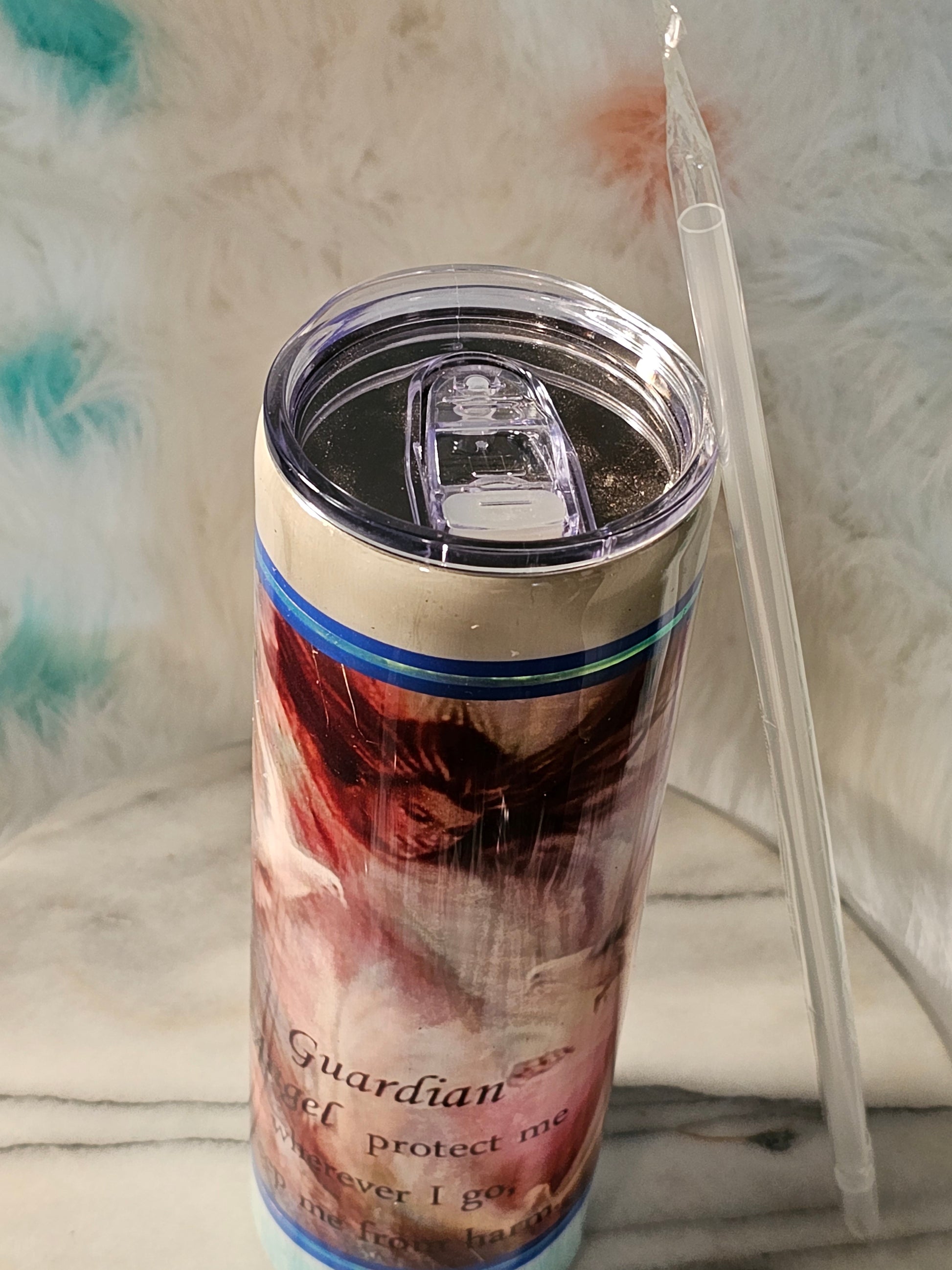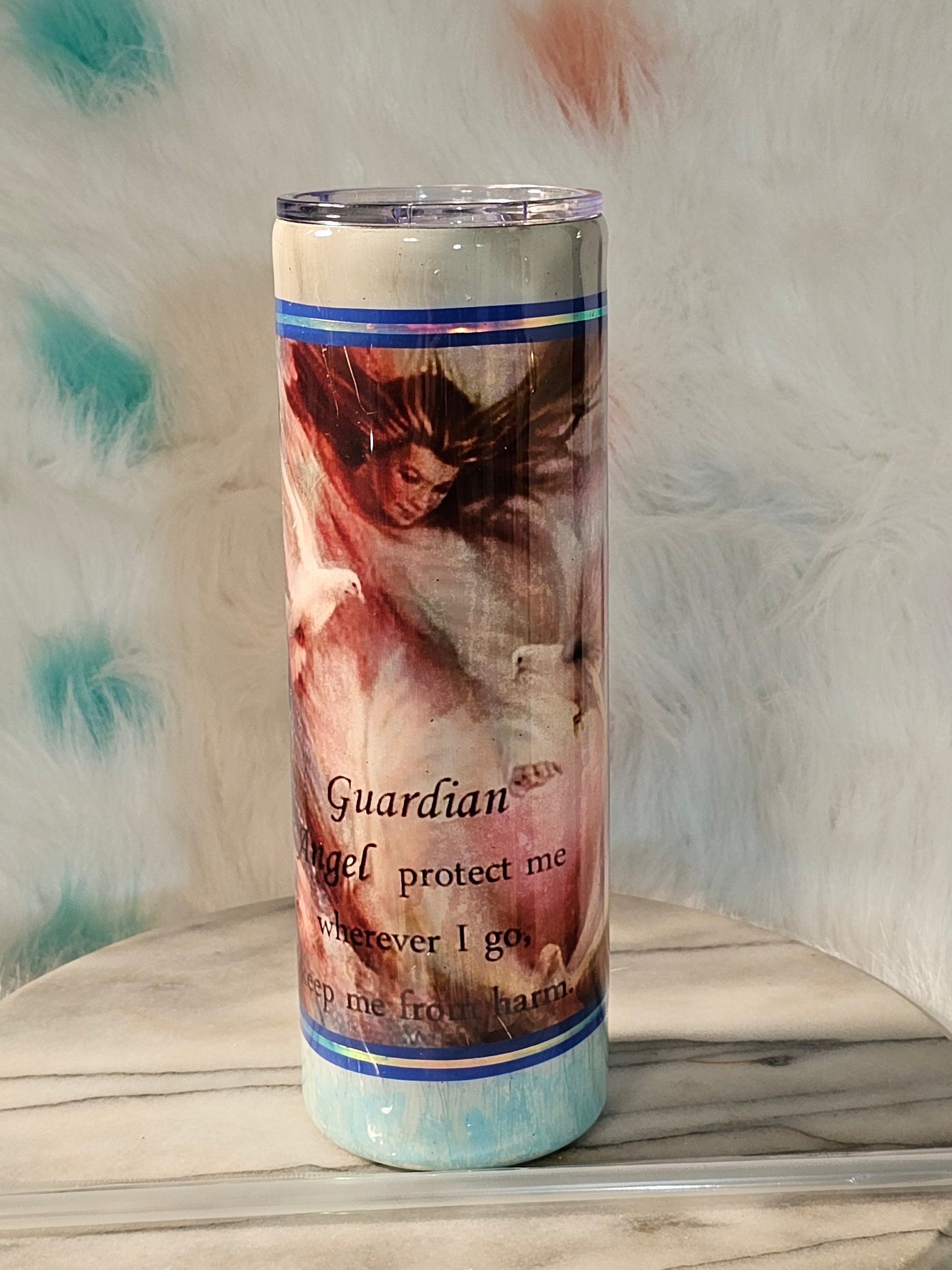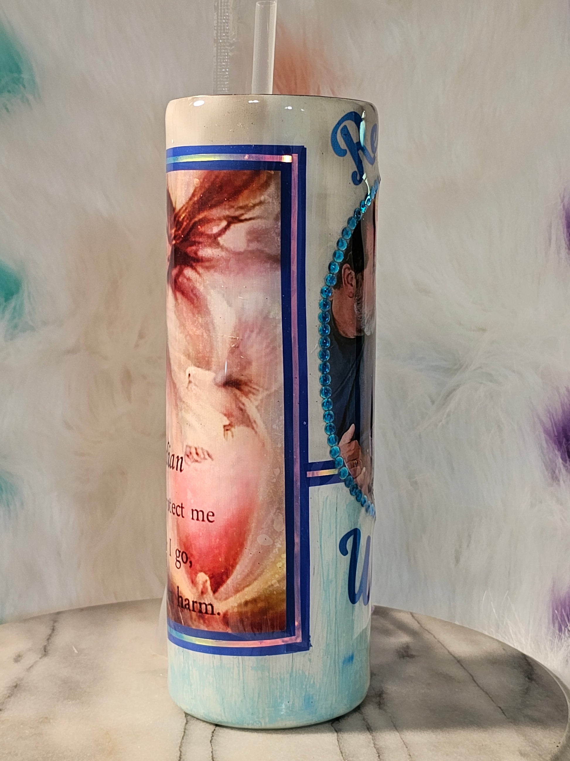 30oz Angle watching over you double wall stainless steel tumbler cup.Keeps drinks cold or hot for hours. Don't put it in the dishwasher, microwave, freezer or direct sunlight. Hand wash only in warm water. I couldn't post the back side of the cup because it has a personal picture on it.I can make you a personal picture on it.