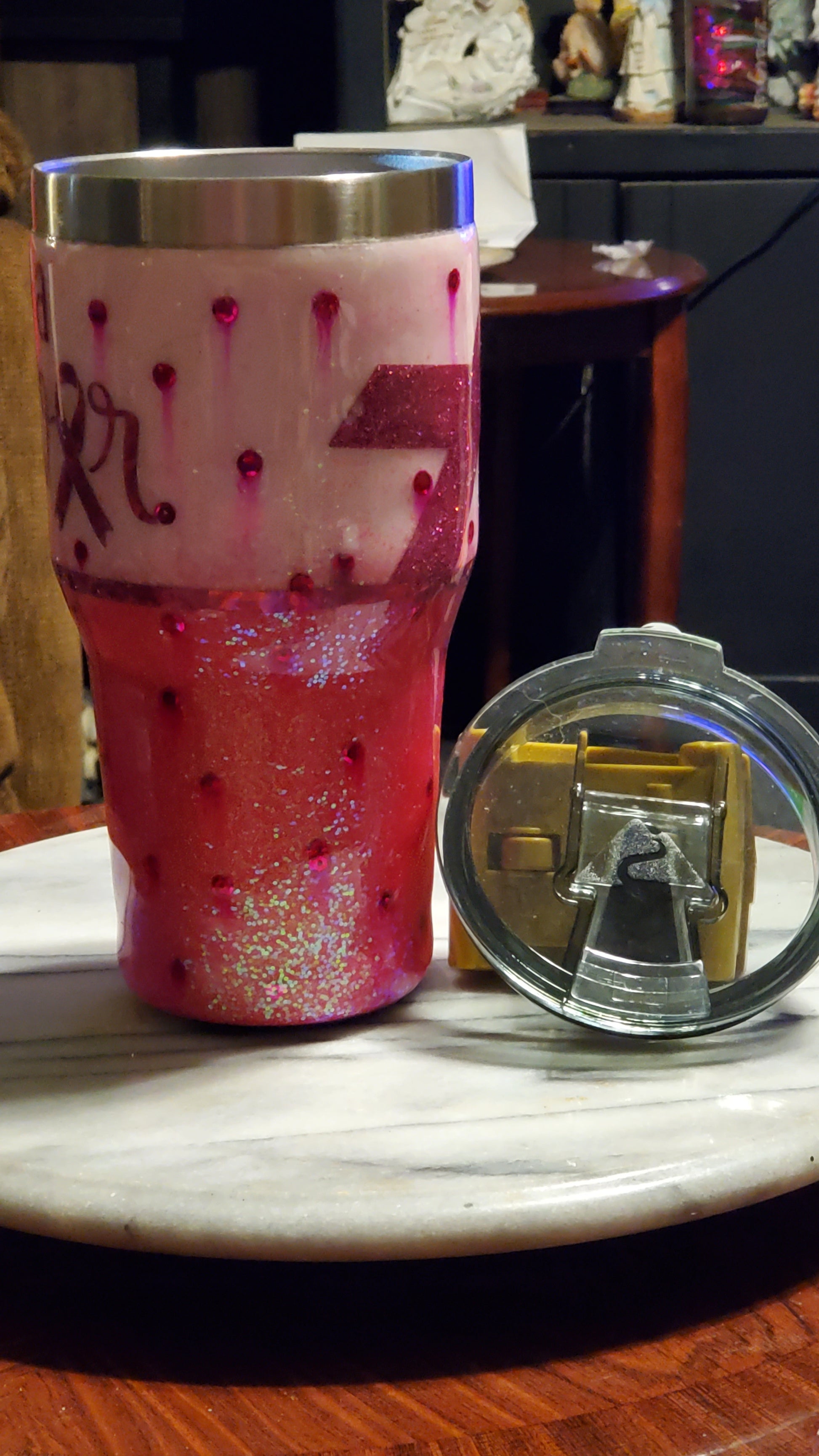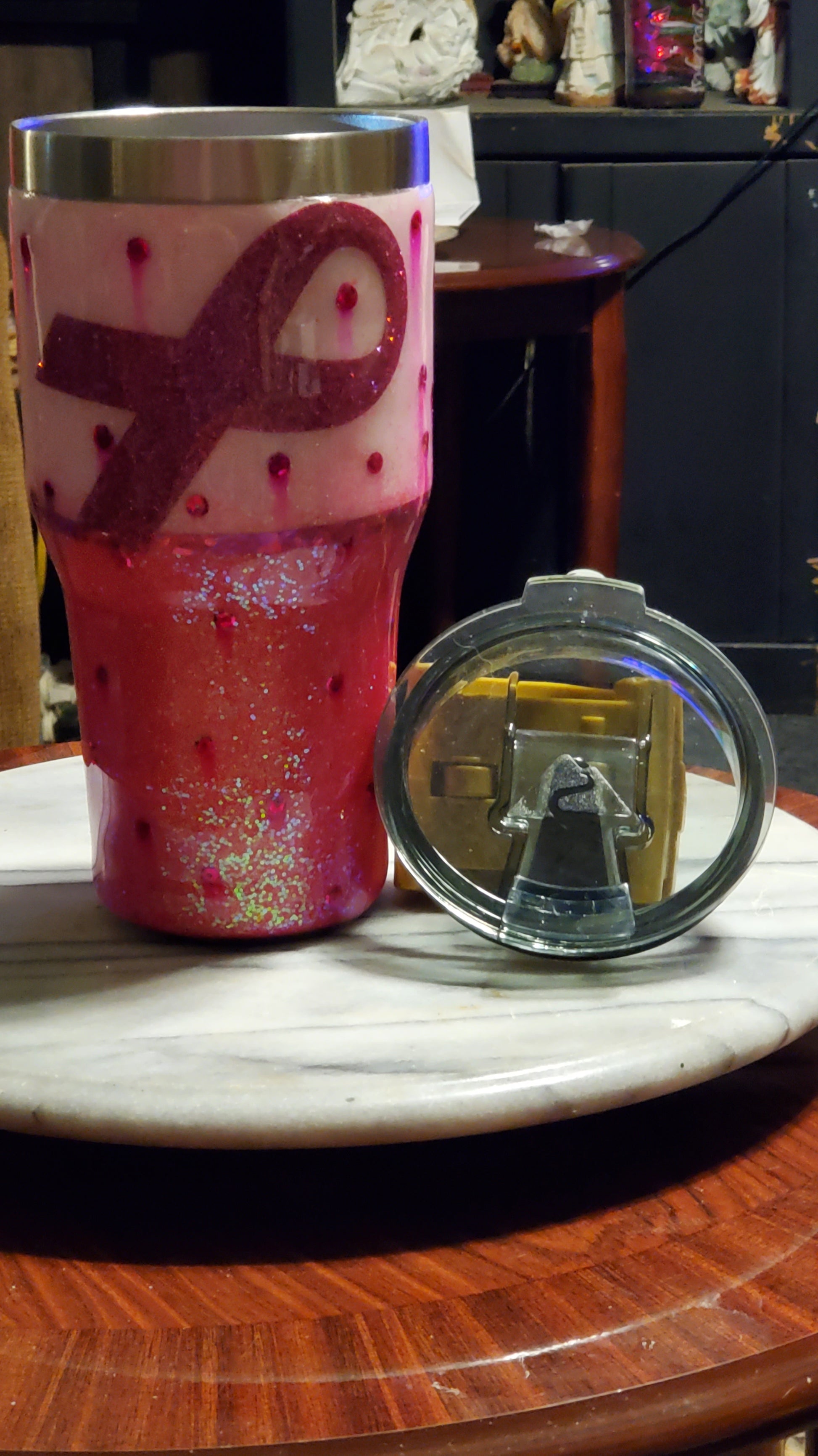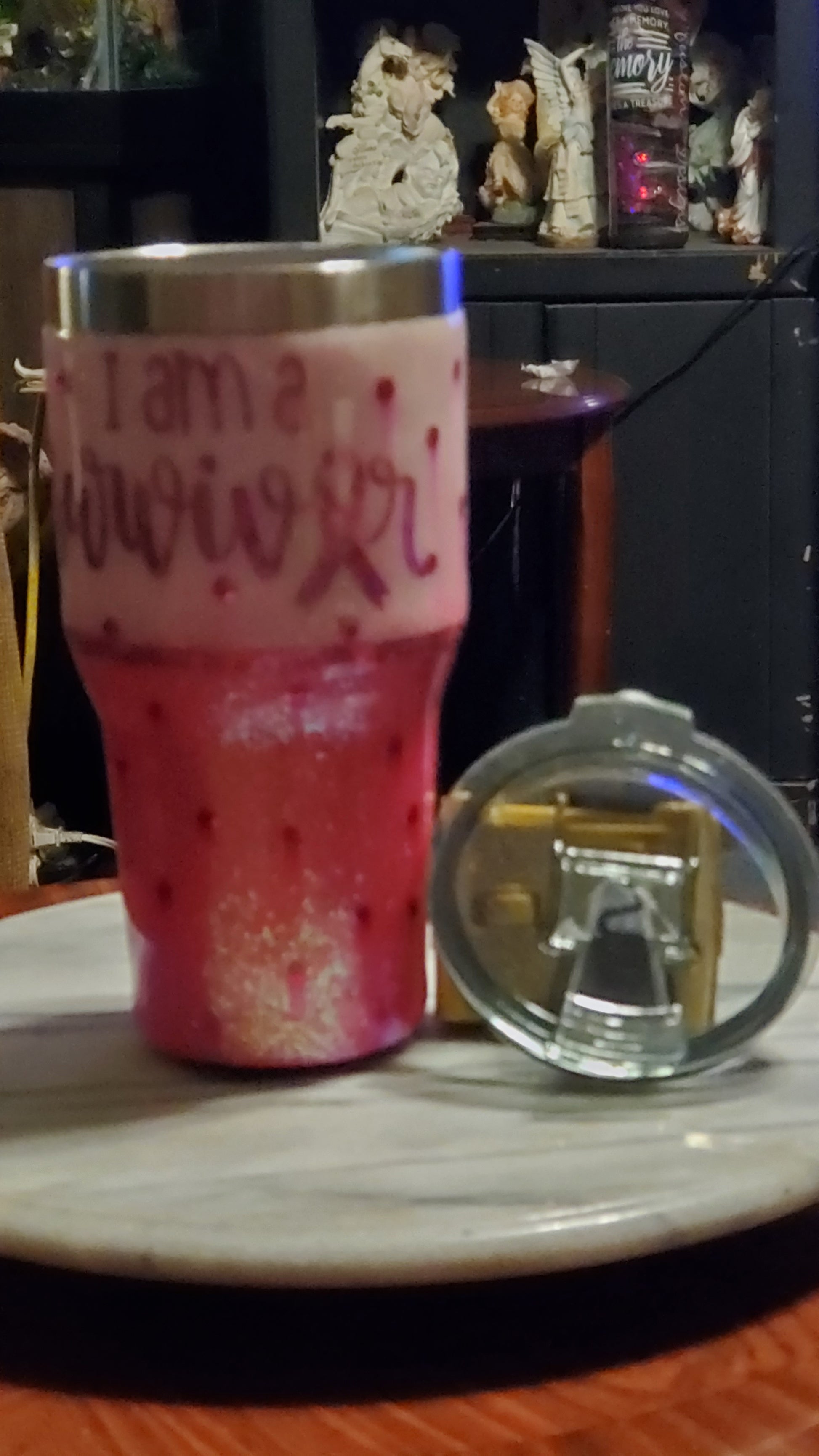 30 0z Cancer survivor Stainless steel tumbler cup. Keeps drinks cold or hot for hours. Don't put it in the dishwasher, microwave, freezer or direct sunlight. Hand wash only in warm water.