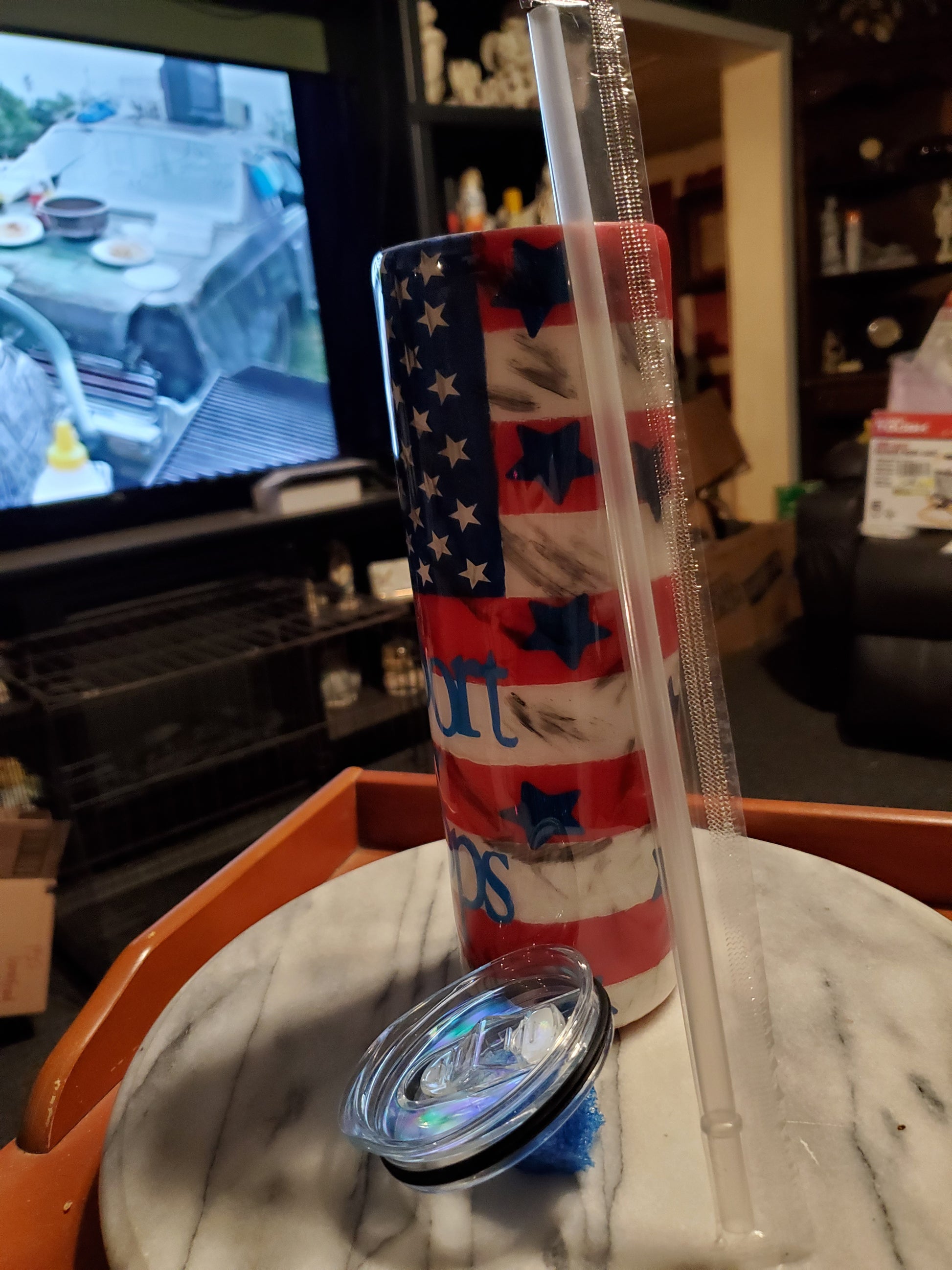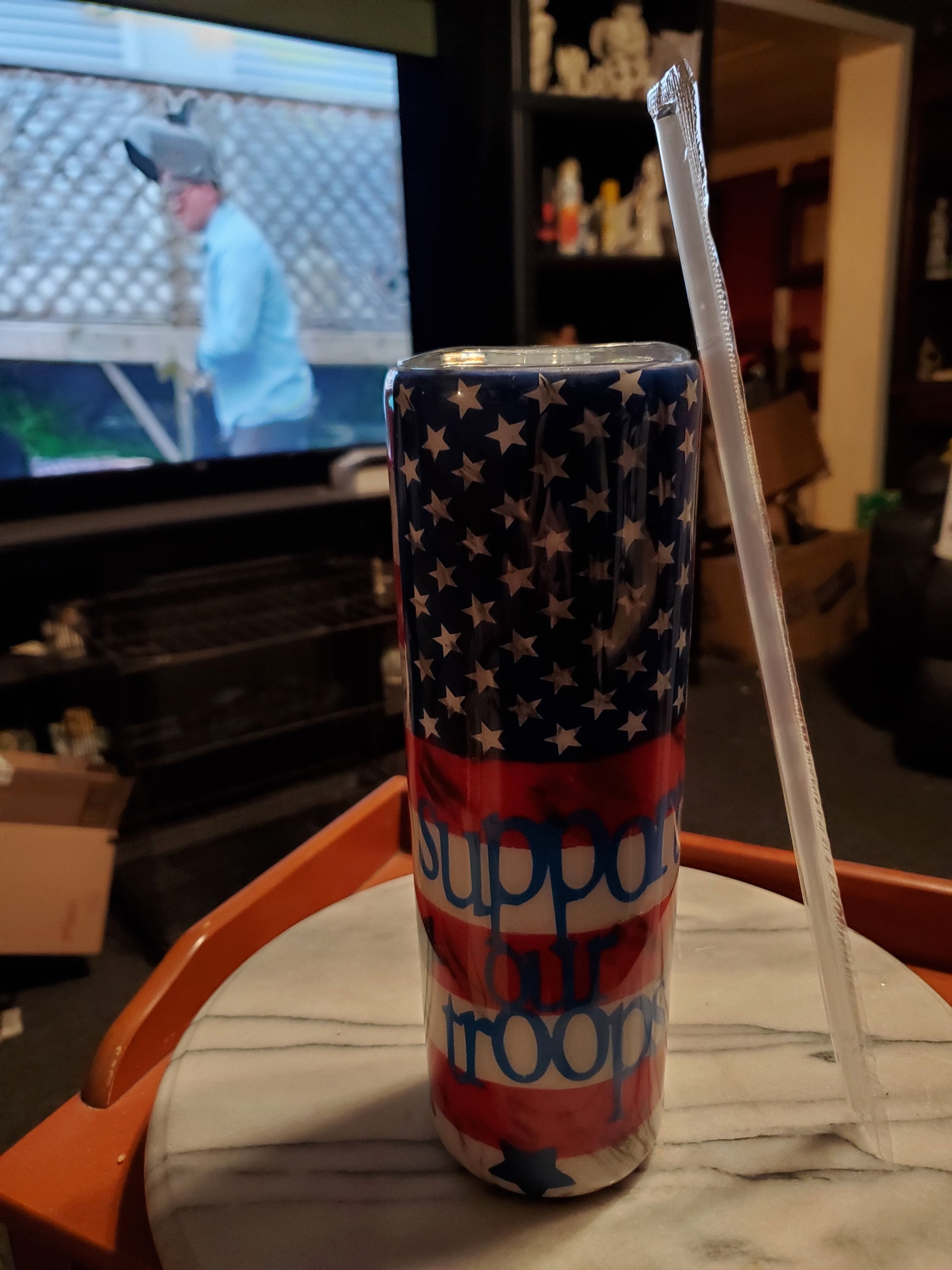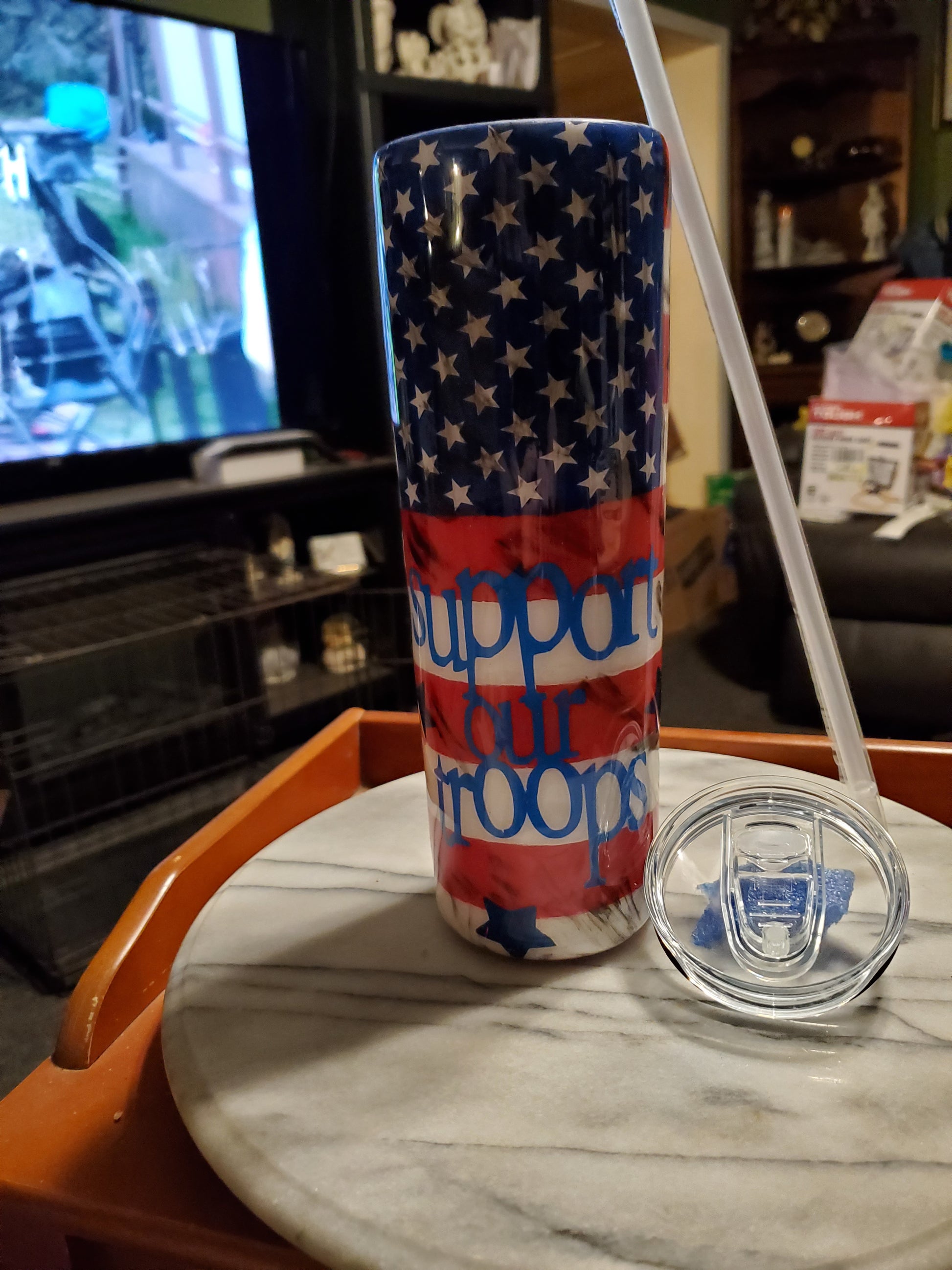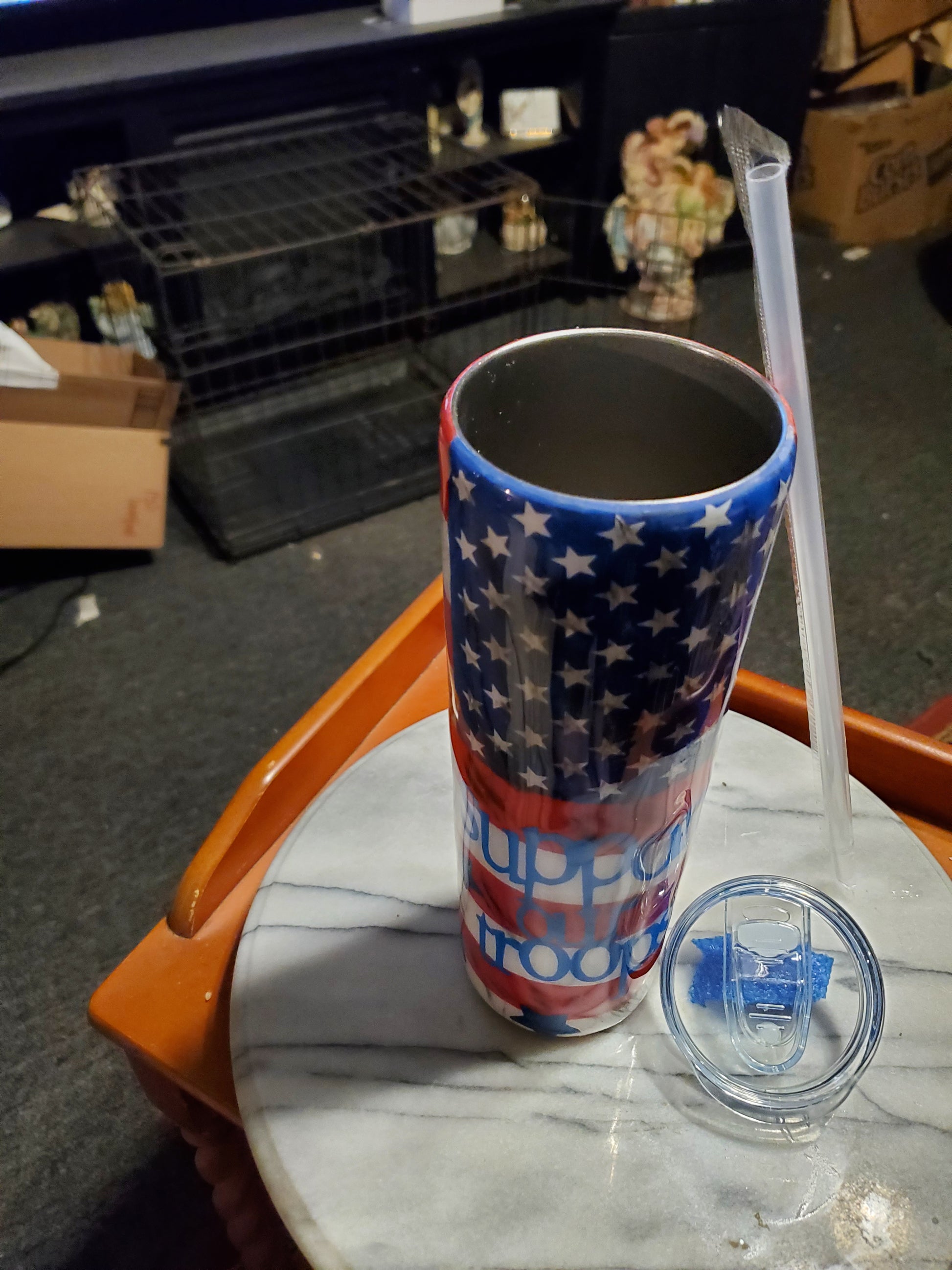 30 0z Destressed Support our troops Stainless steel tumbler cup.Keeps drinks cold or hot for hours. Don't put it in the dishwasher, microwave, freezer or direct sunlight. Hand wash only in warm water.