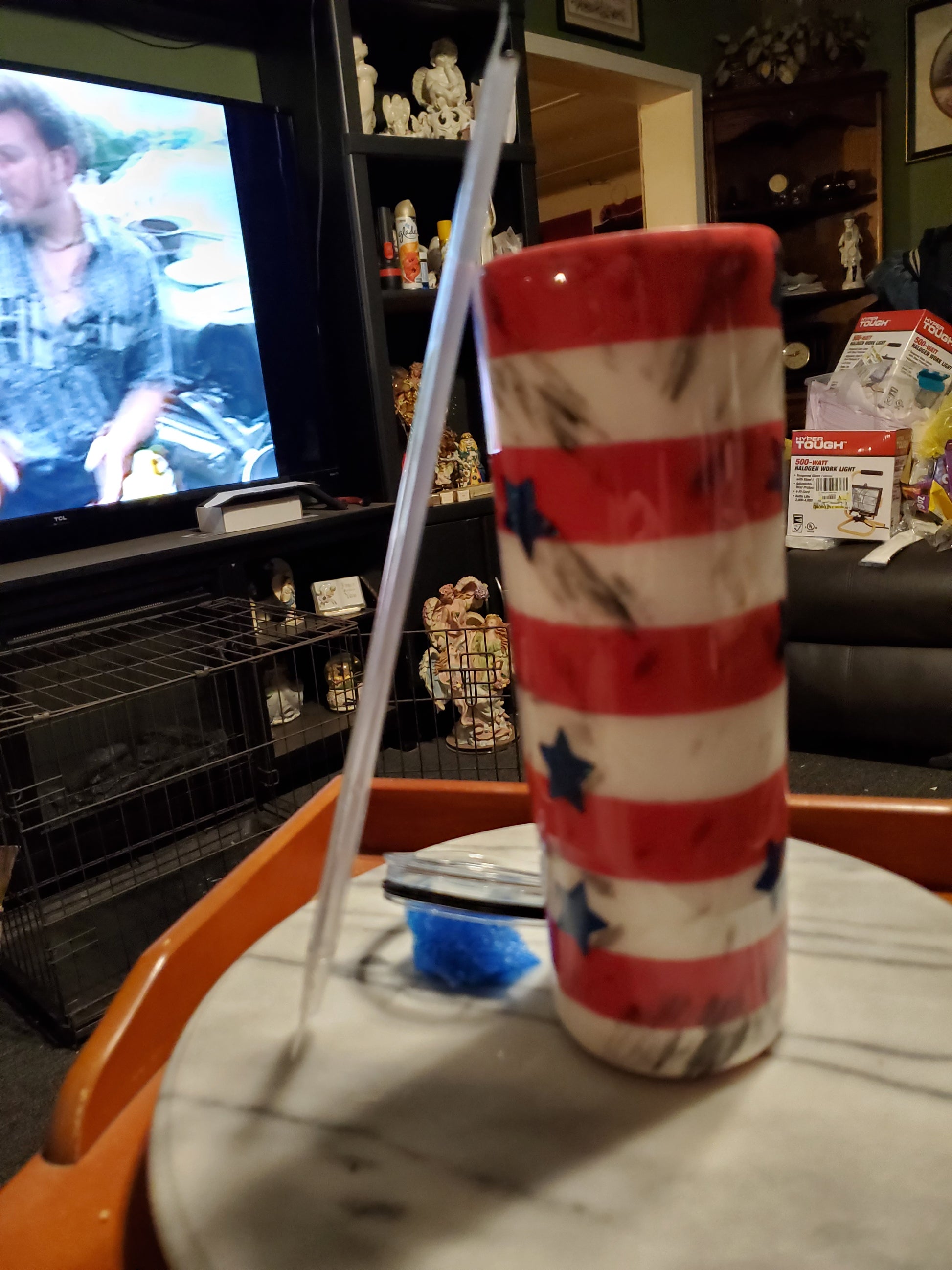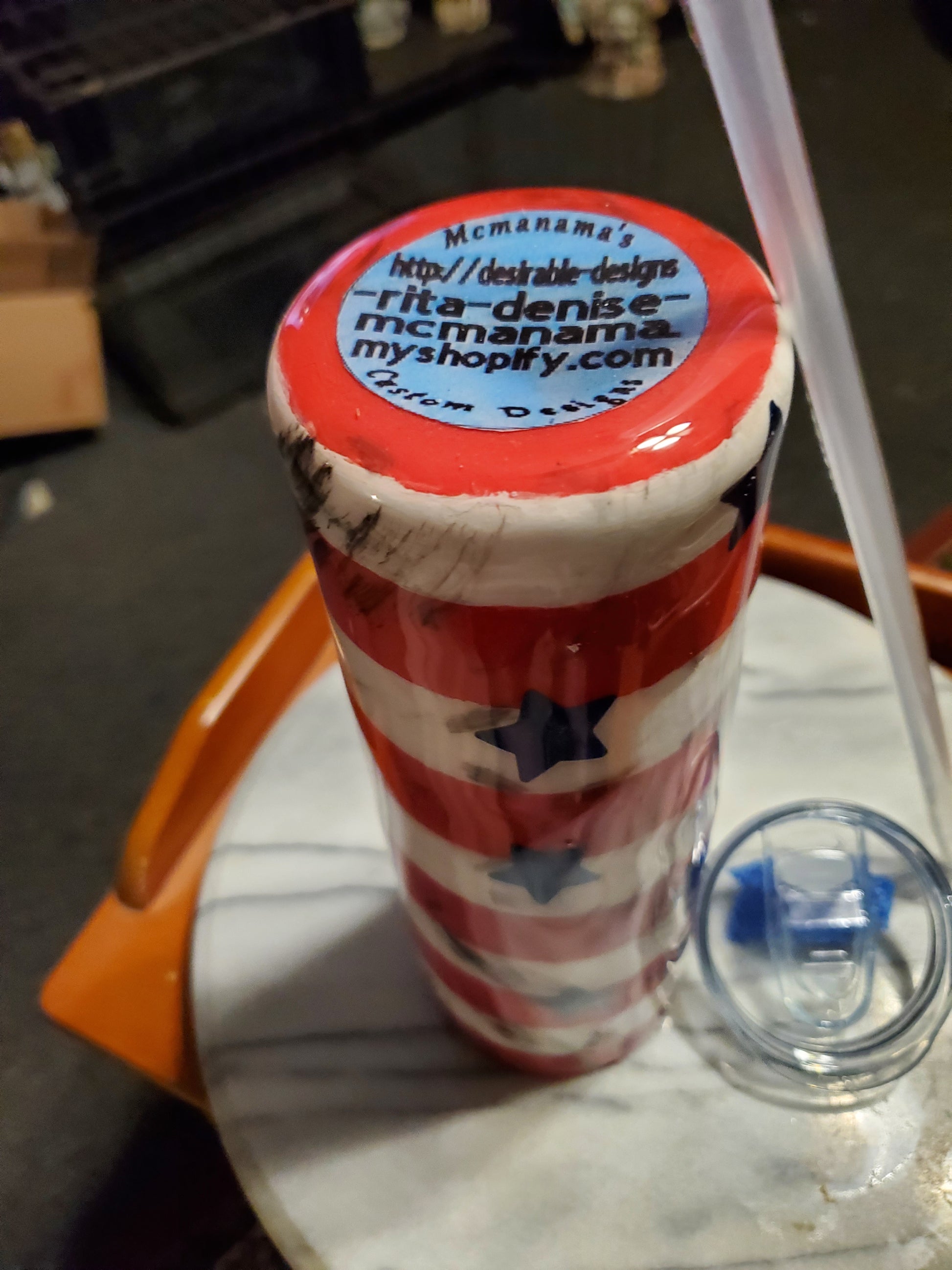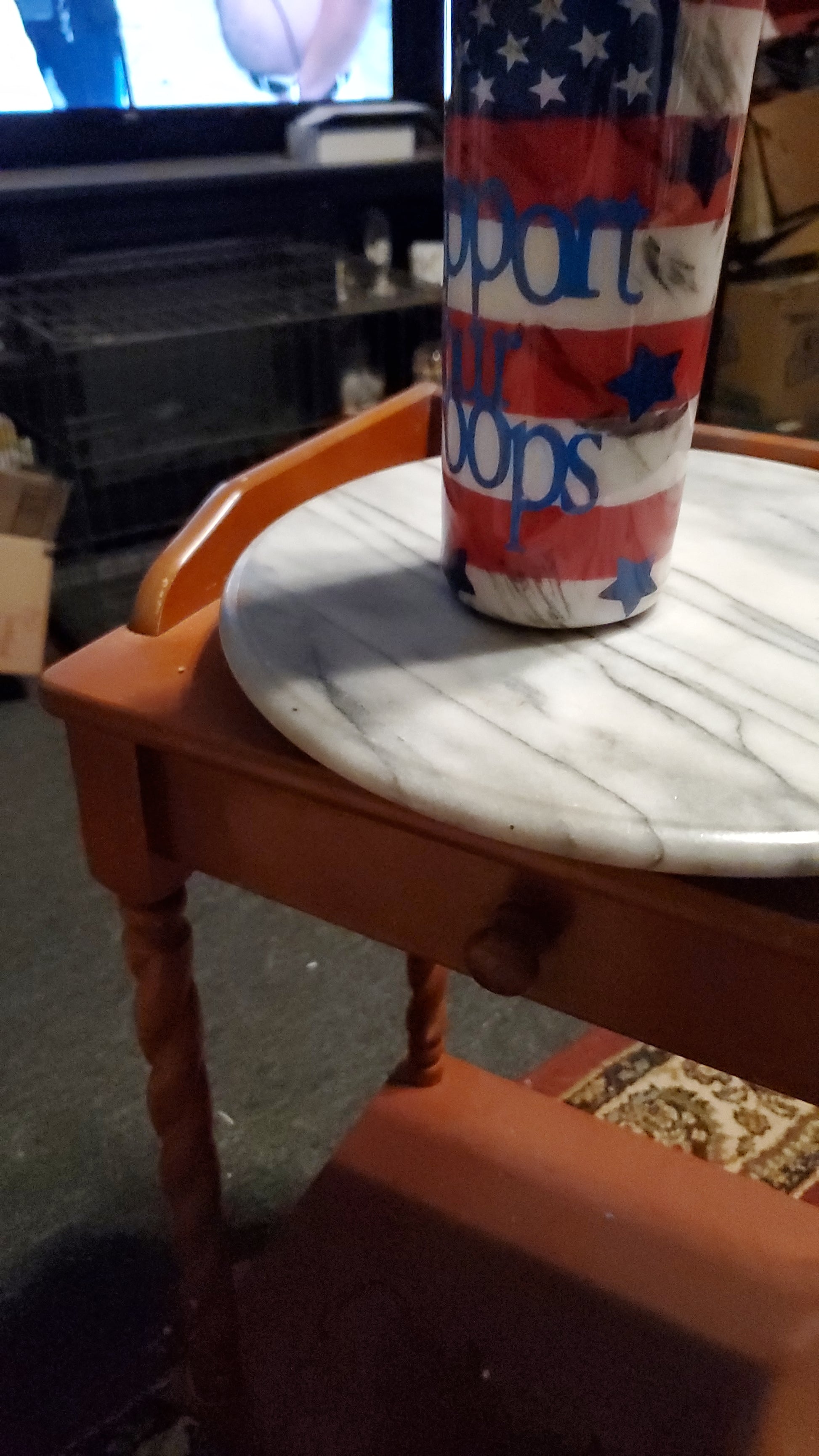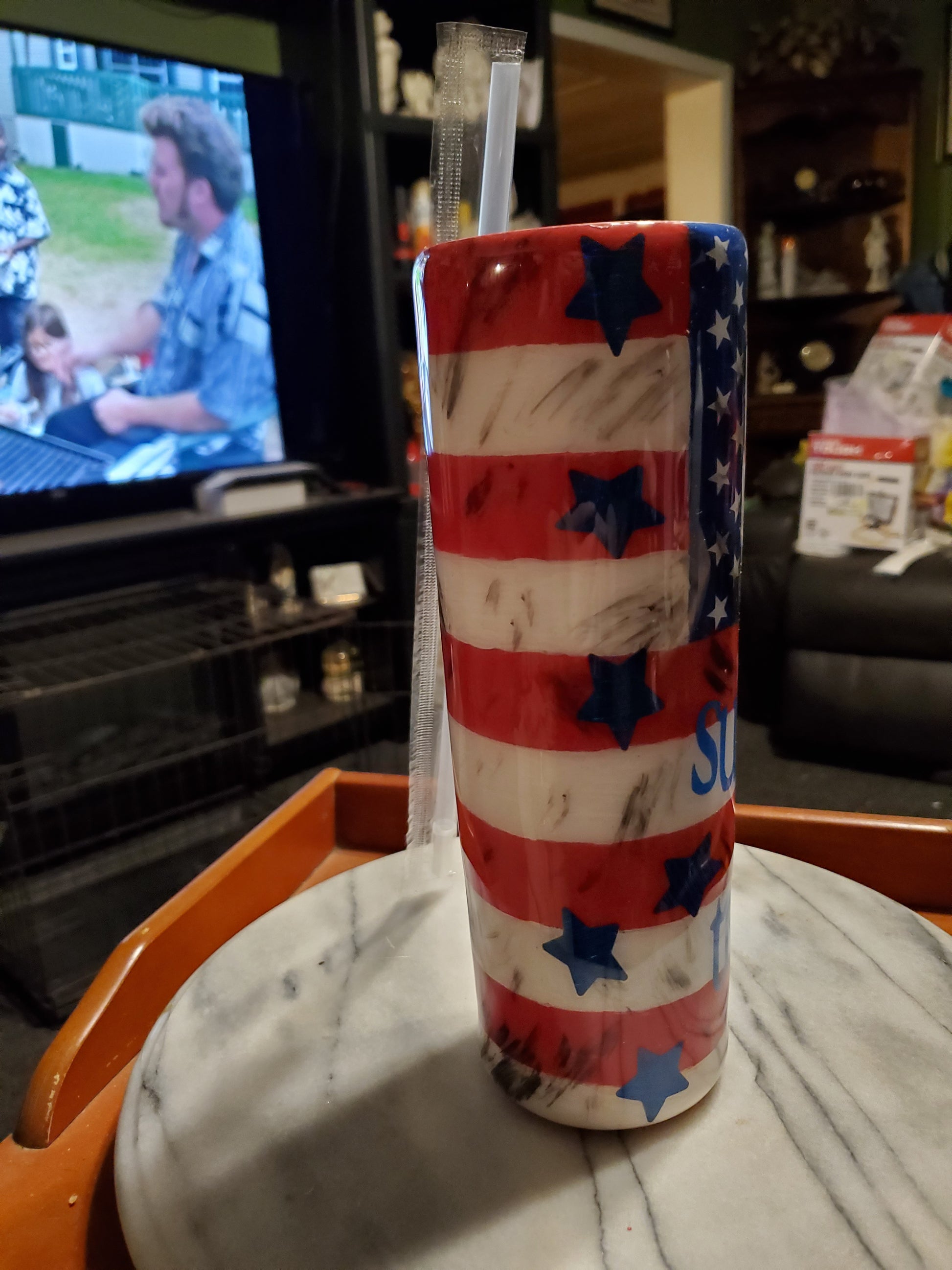 30 0z Destressed Support our troops Stainless steel tumbler cup.Keeps drinks cold or hot for hours. Don't put it in the dishwasher, microwave, freezer or direct sunlight. Hand wash only in warm water.
