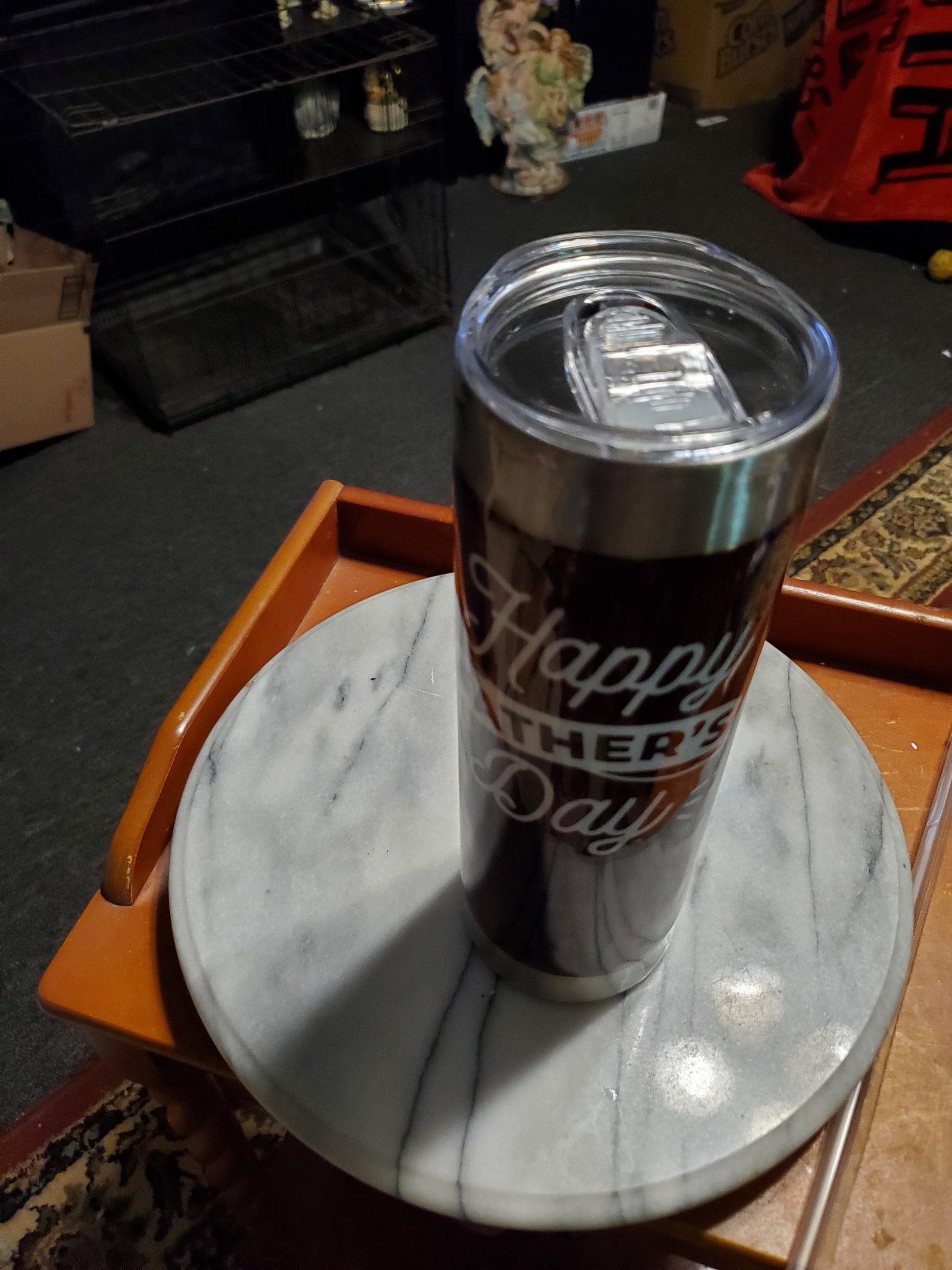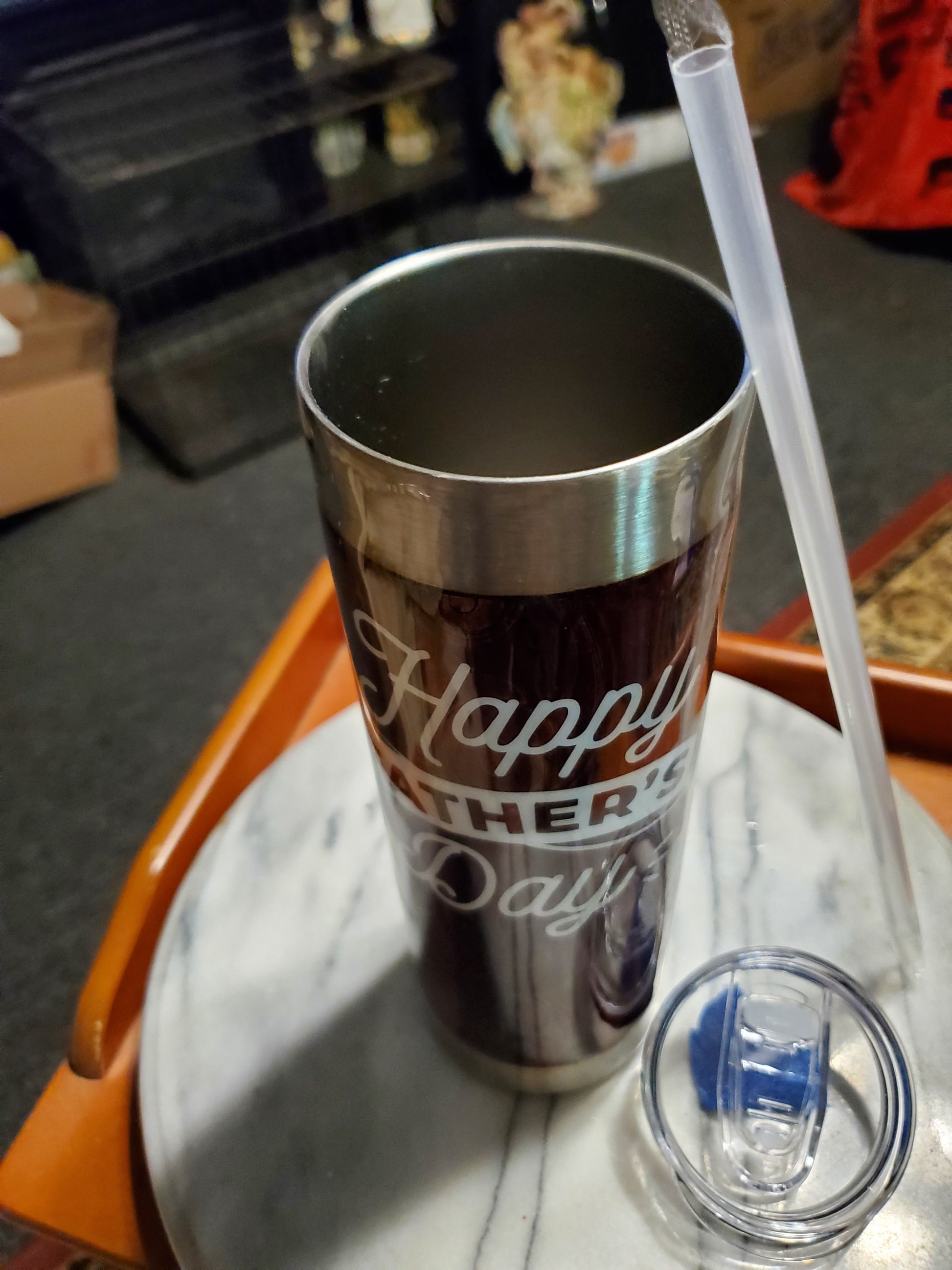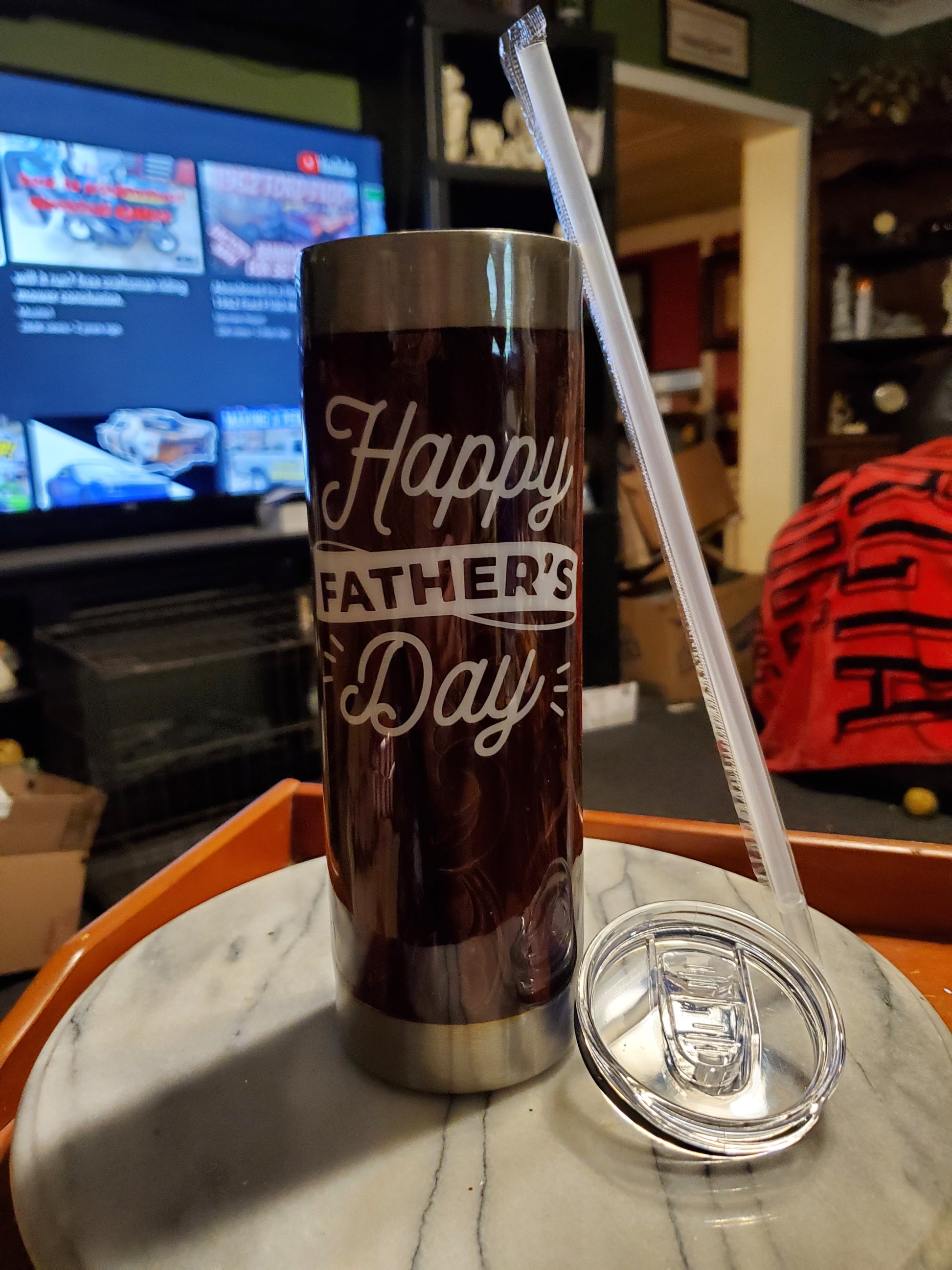 30 0z Happy Father's day Stainless steel hogg tumbler cup. Keeps drinks cold or hot for hours. Don't put it in the dishwasher, microwave, freezer or direct sunlight. Hand wash only in warm water.