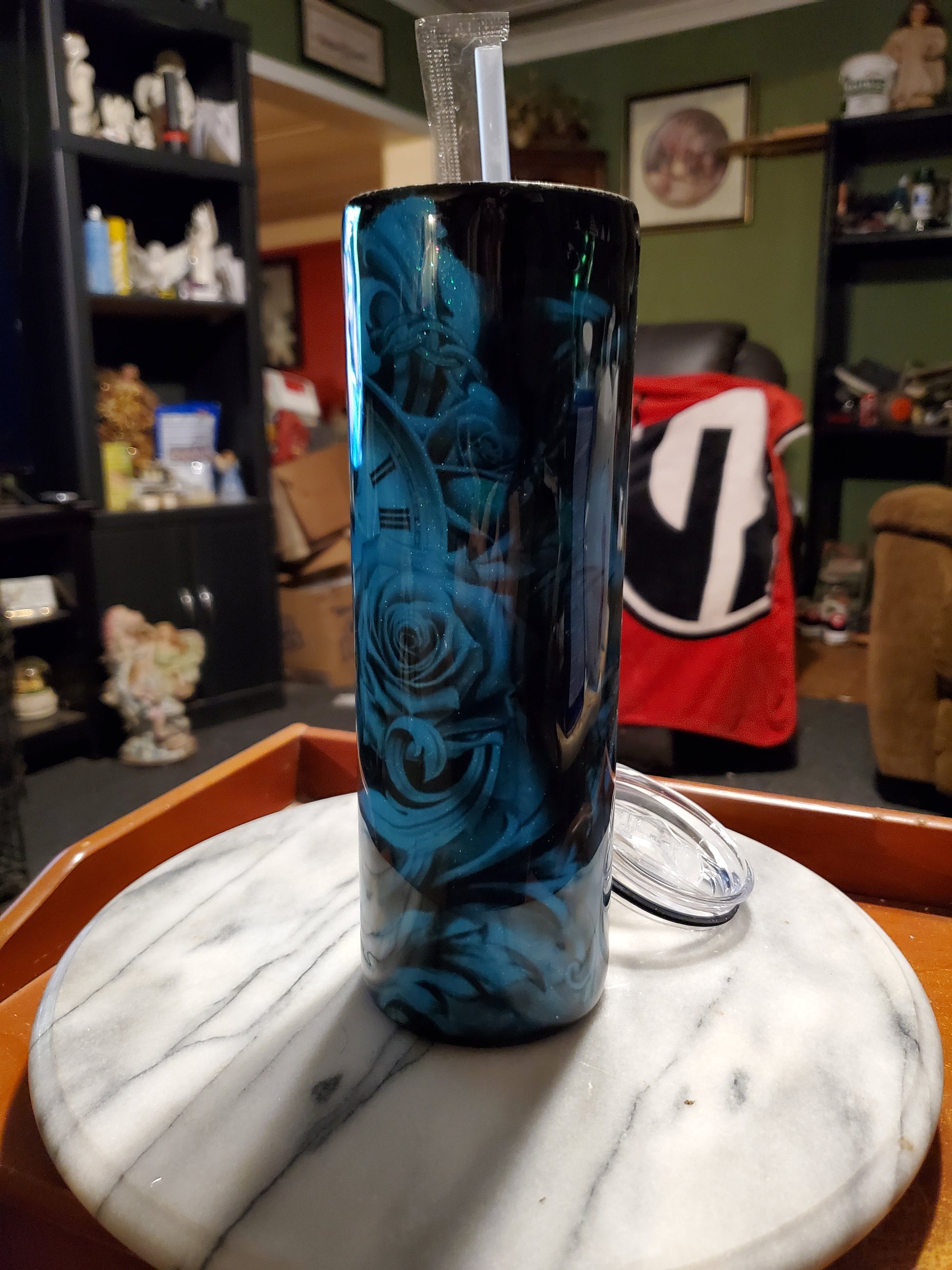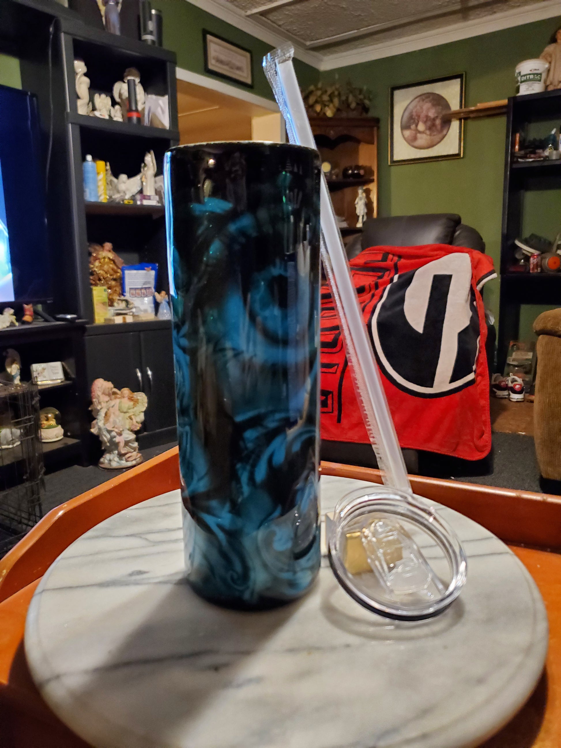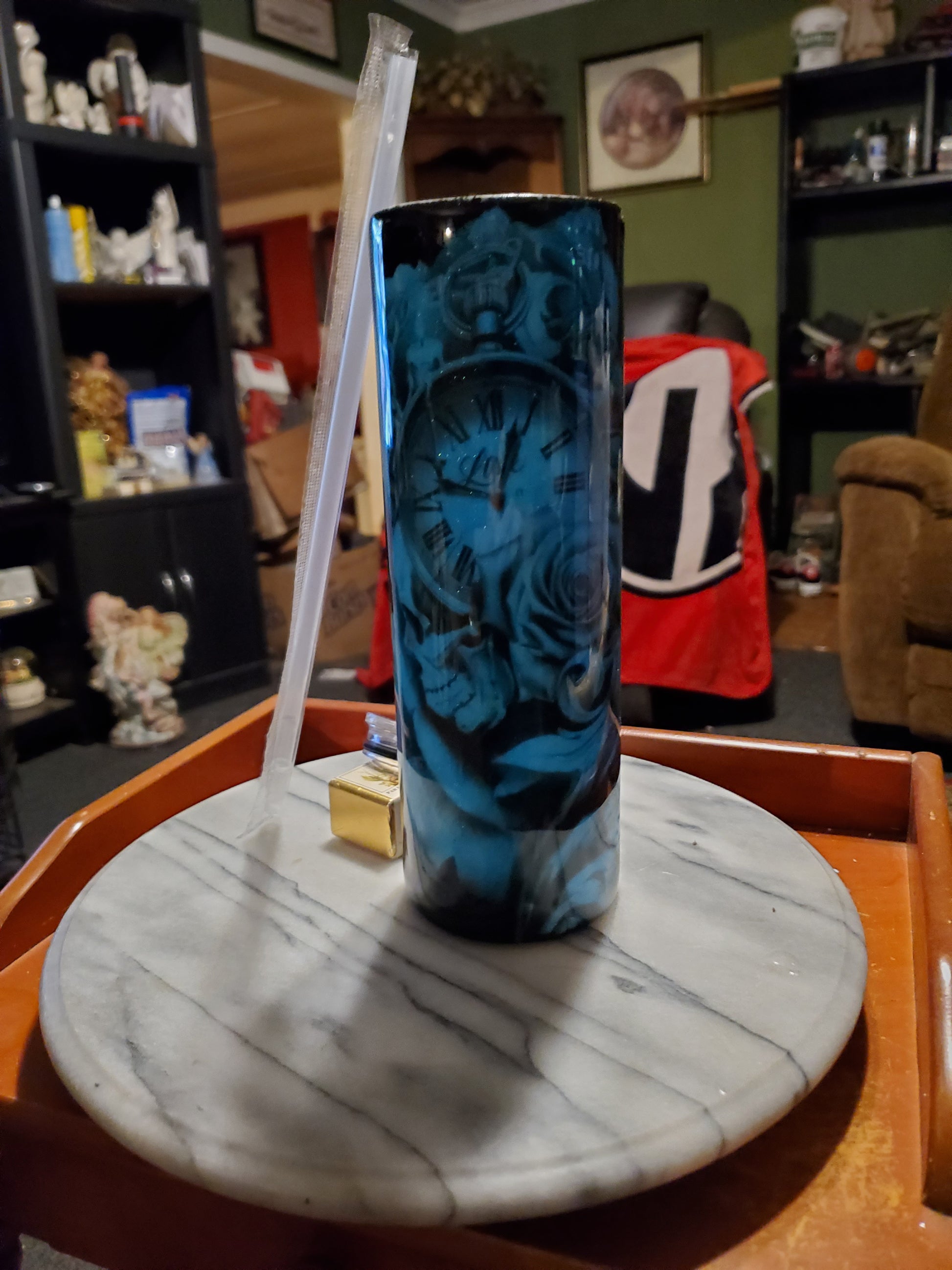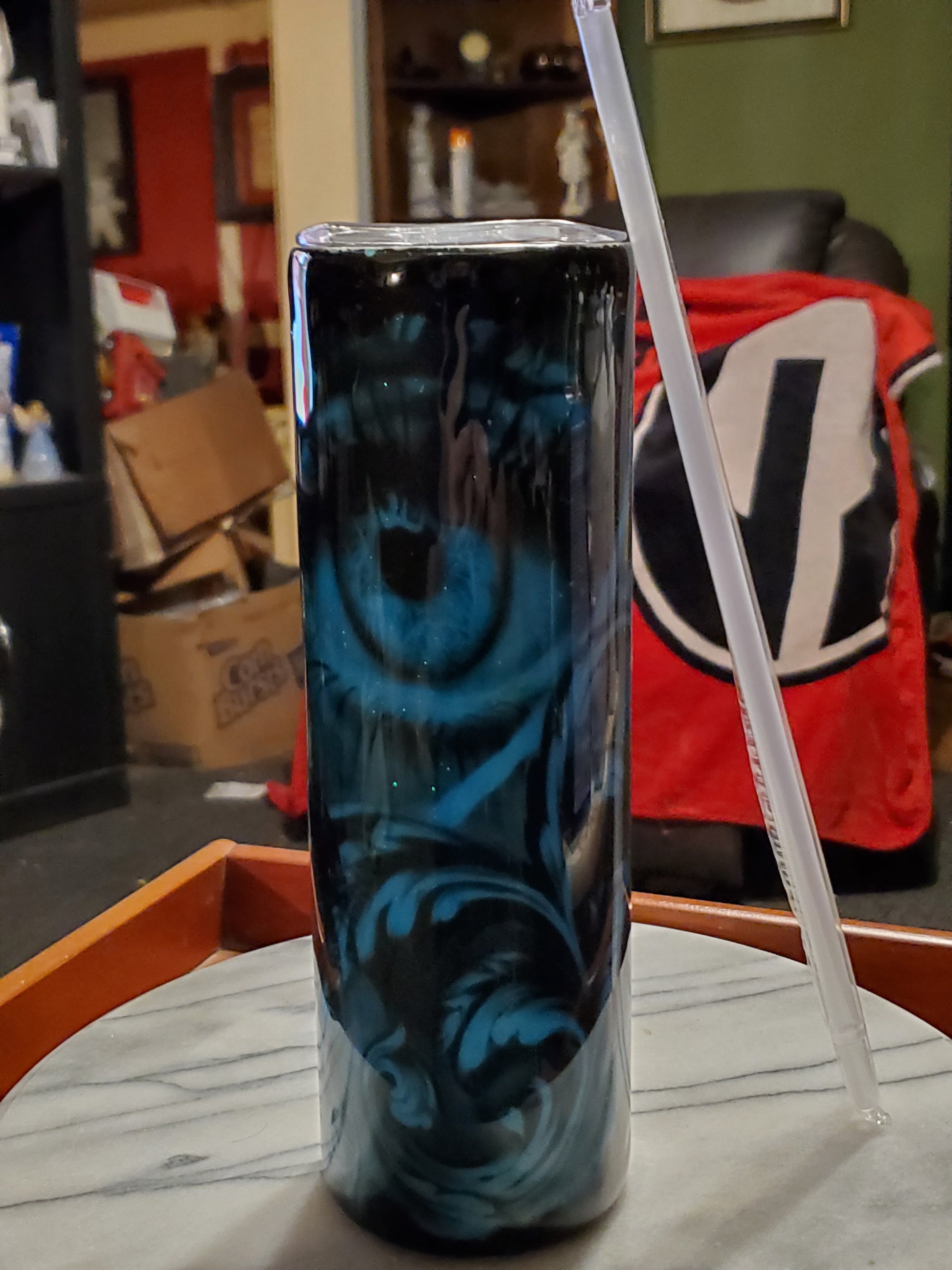 30 0z I got my eye on you hogg tumbler .Keeps drinks cold or hot for hours. Don't put it in the dishwasher, microwave, freezer or direct sunlight. Hand wash only in warm water.