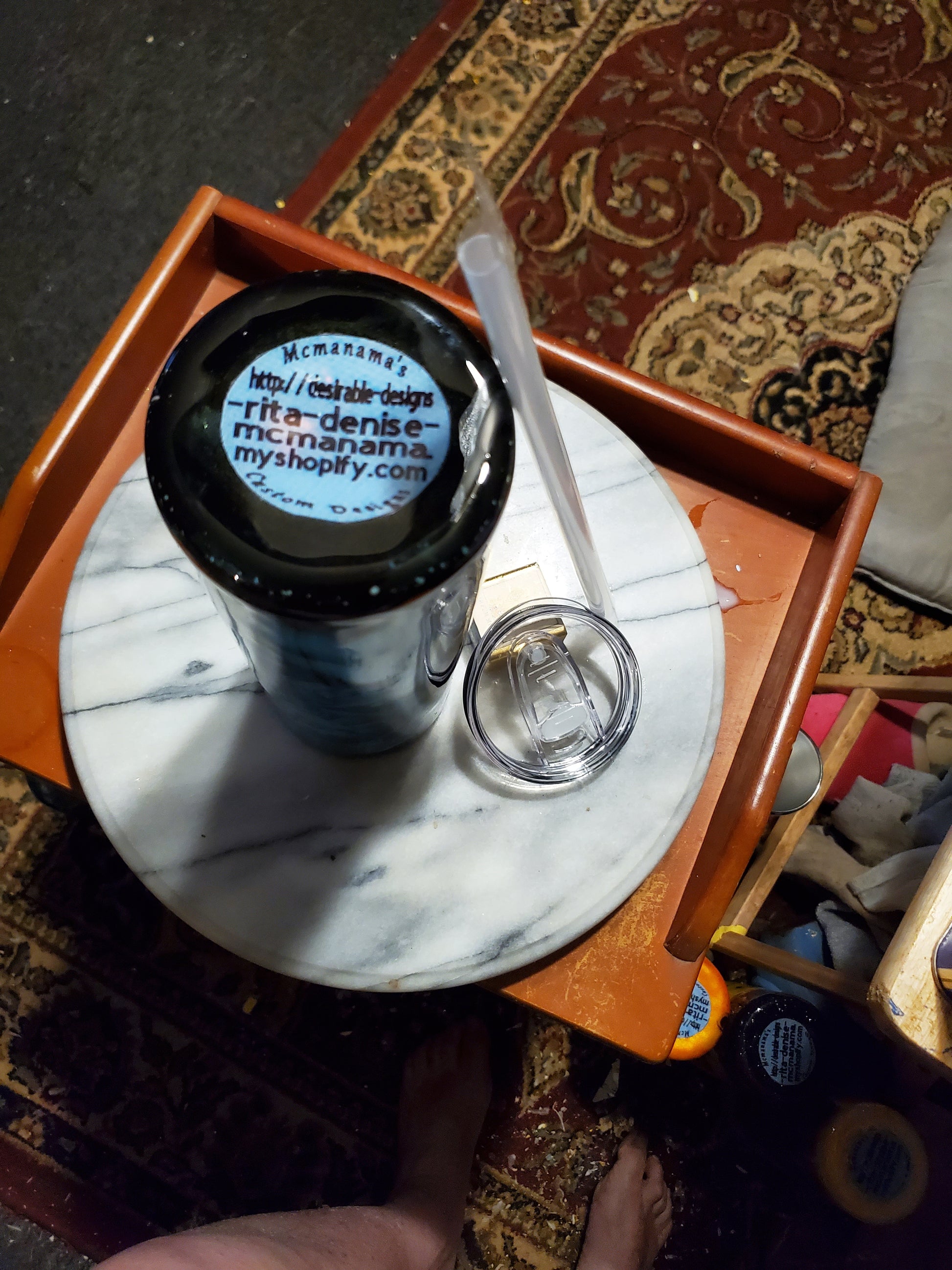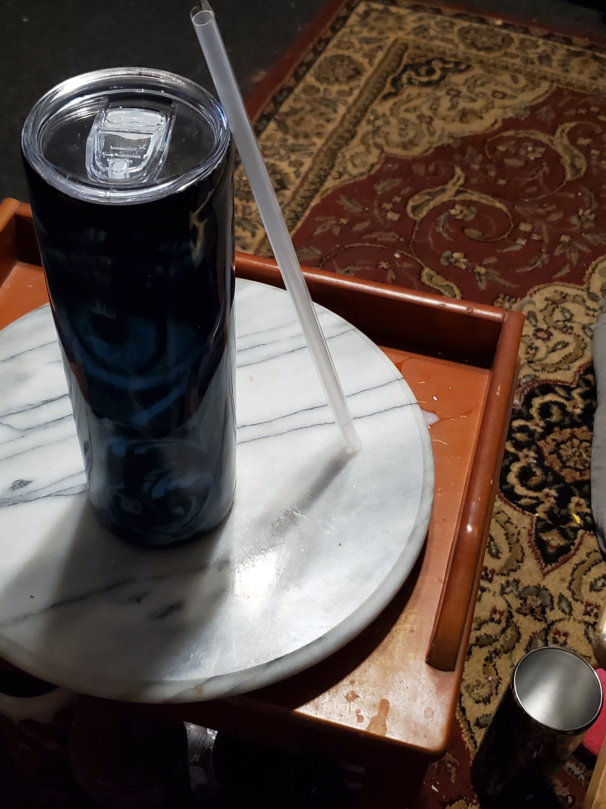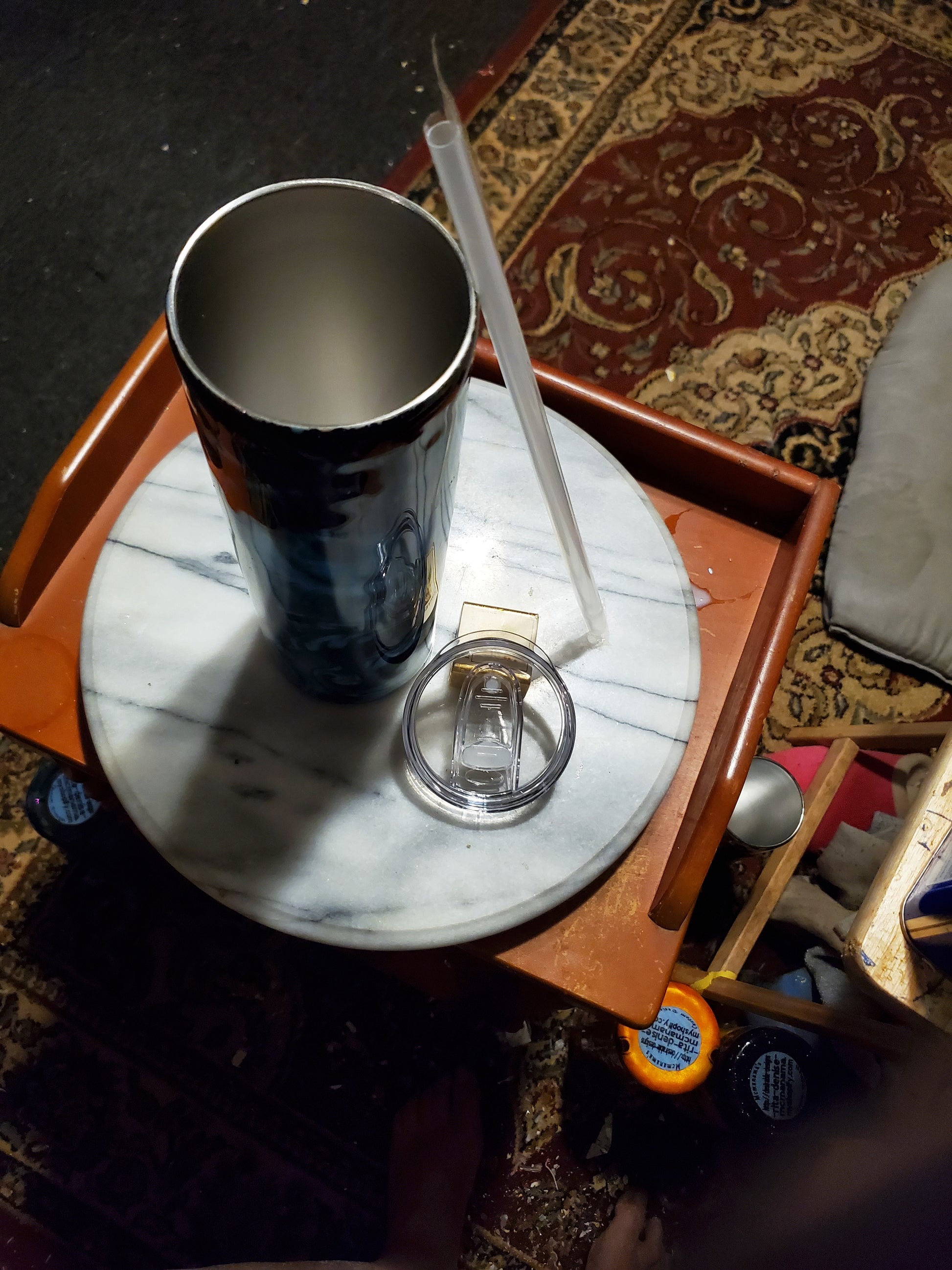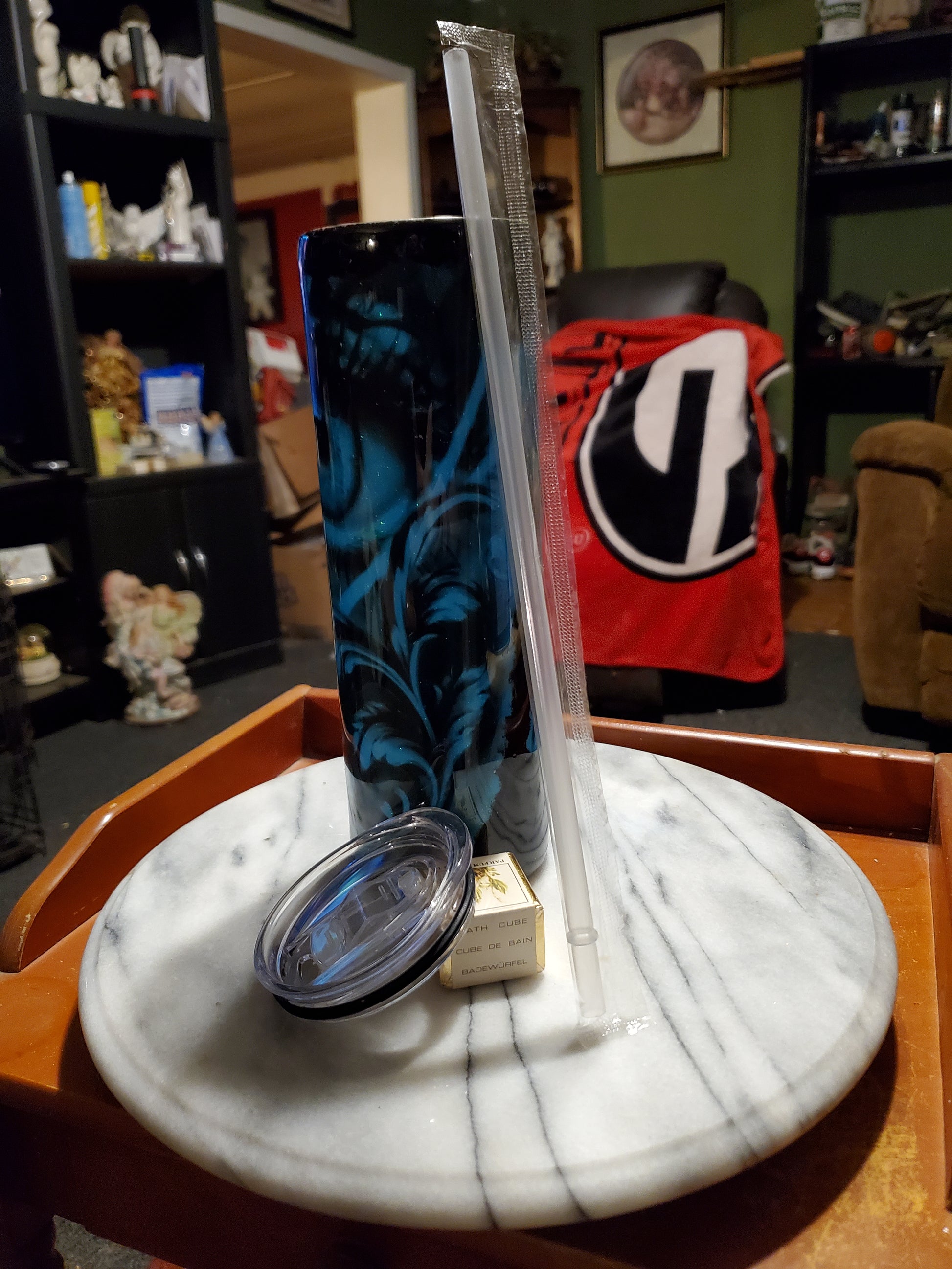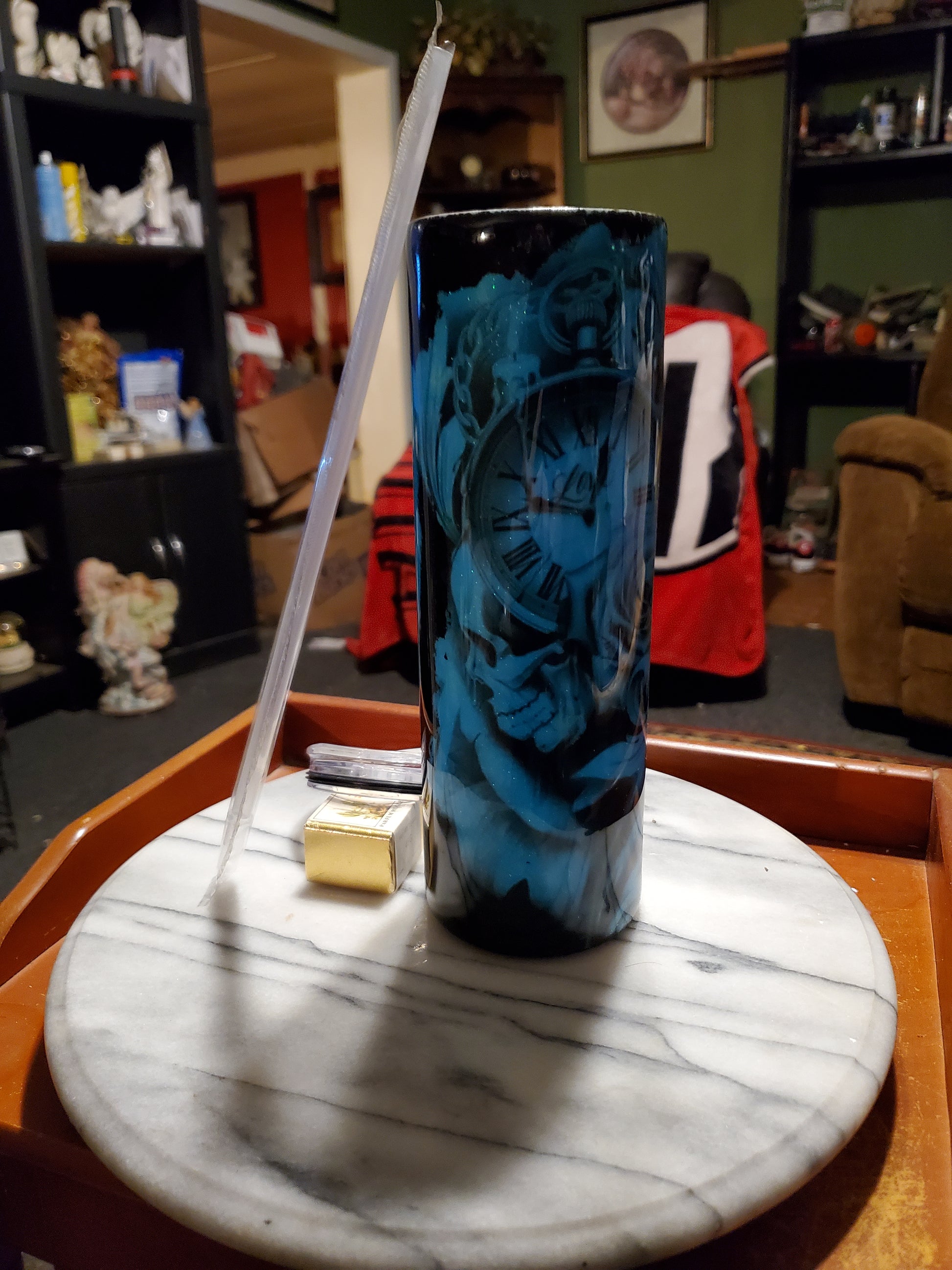 30 0z I got my eye on you hogg tumbler .Keeps drinks cold or hot for hours. Don't put it in the dishwasher, microwave, freezer or direct sunlight. Hand wash only in warm water.