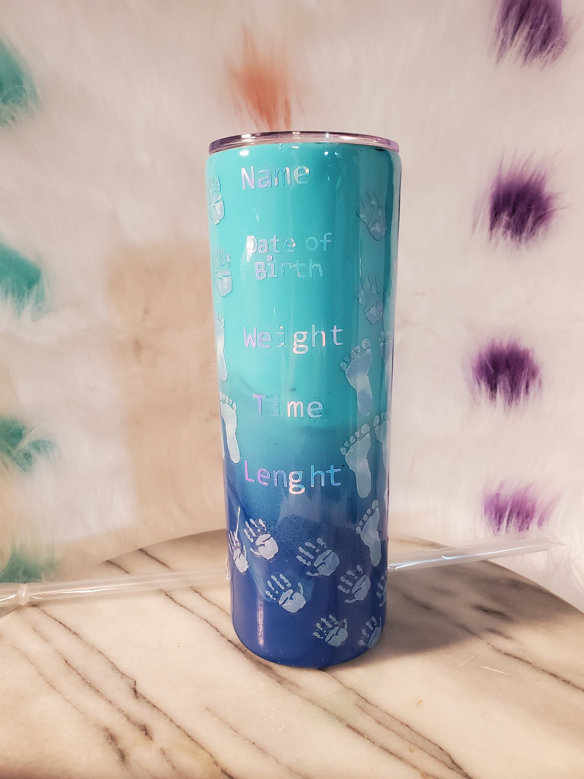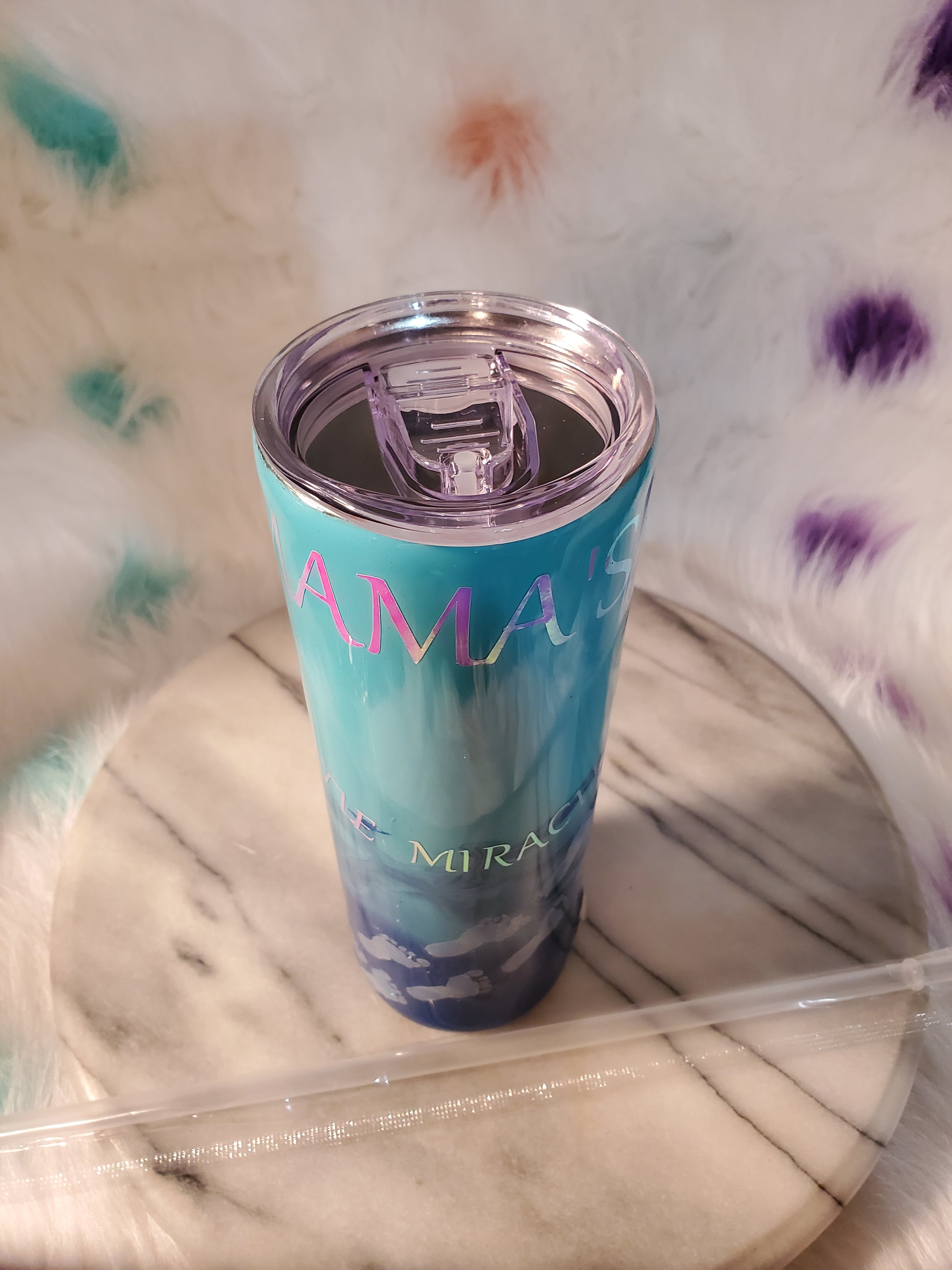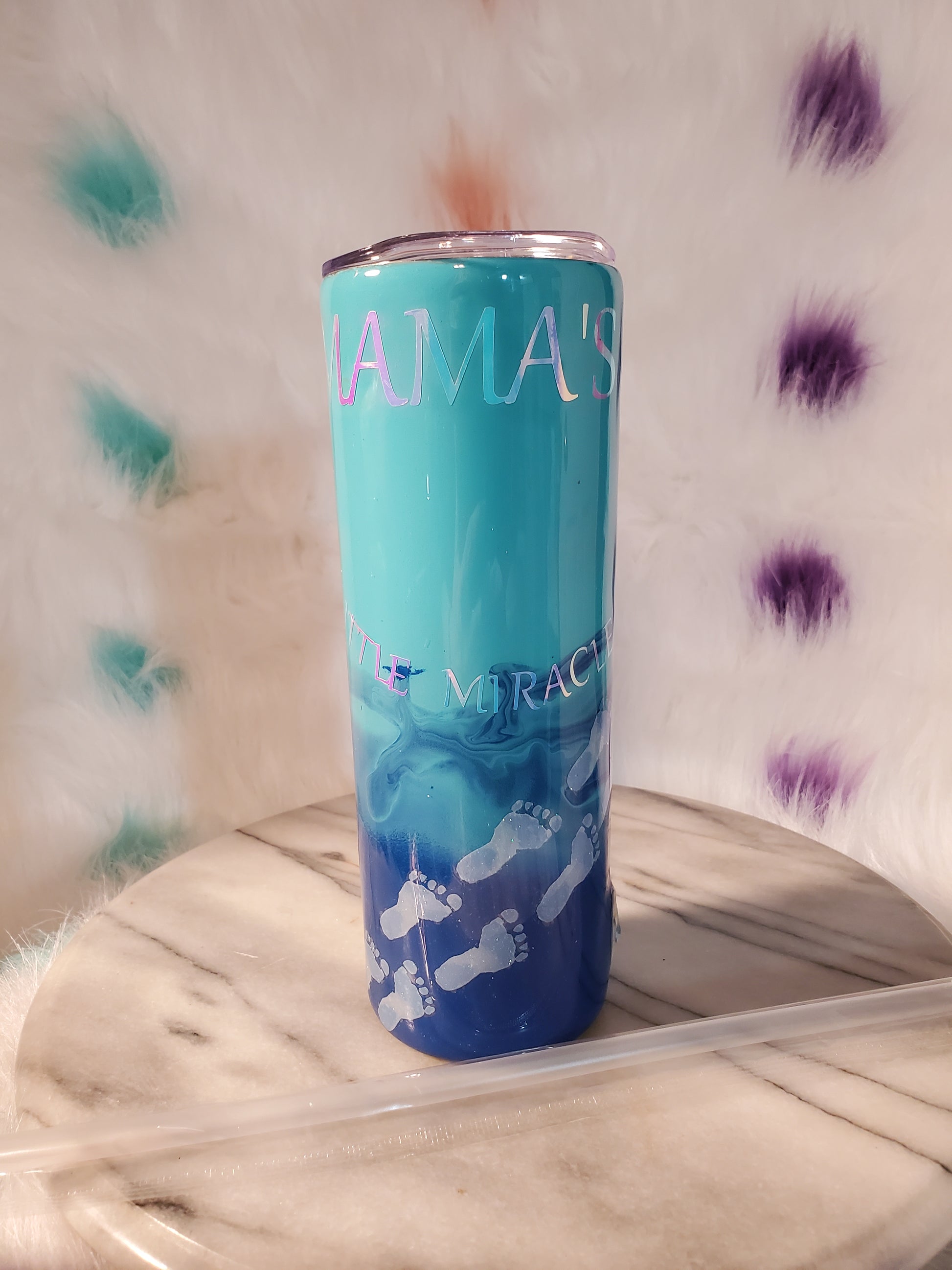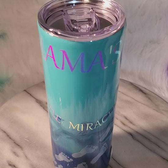 30oz Mama's little miracle double wall stainless steel tumbler cup.Keeps drinks cold or hot for hours. Don't put it in the dishwasher, microwave, freezer or direct sunlight. Hand wash only in warm water. I can put your baby boy's picture under the word mama and on the back I can put the baby's name, lenght,and other information. I can also make a cup in you have more than one baby.