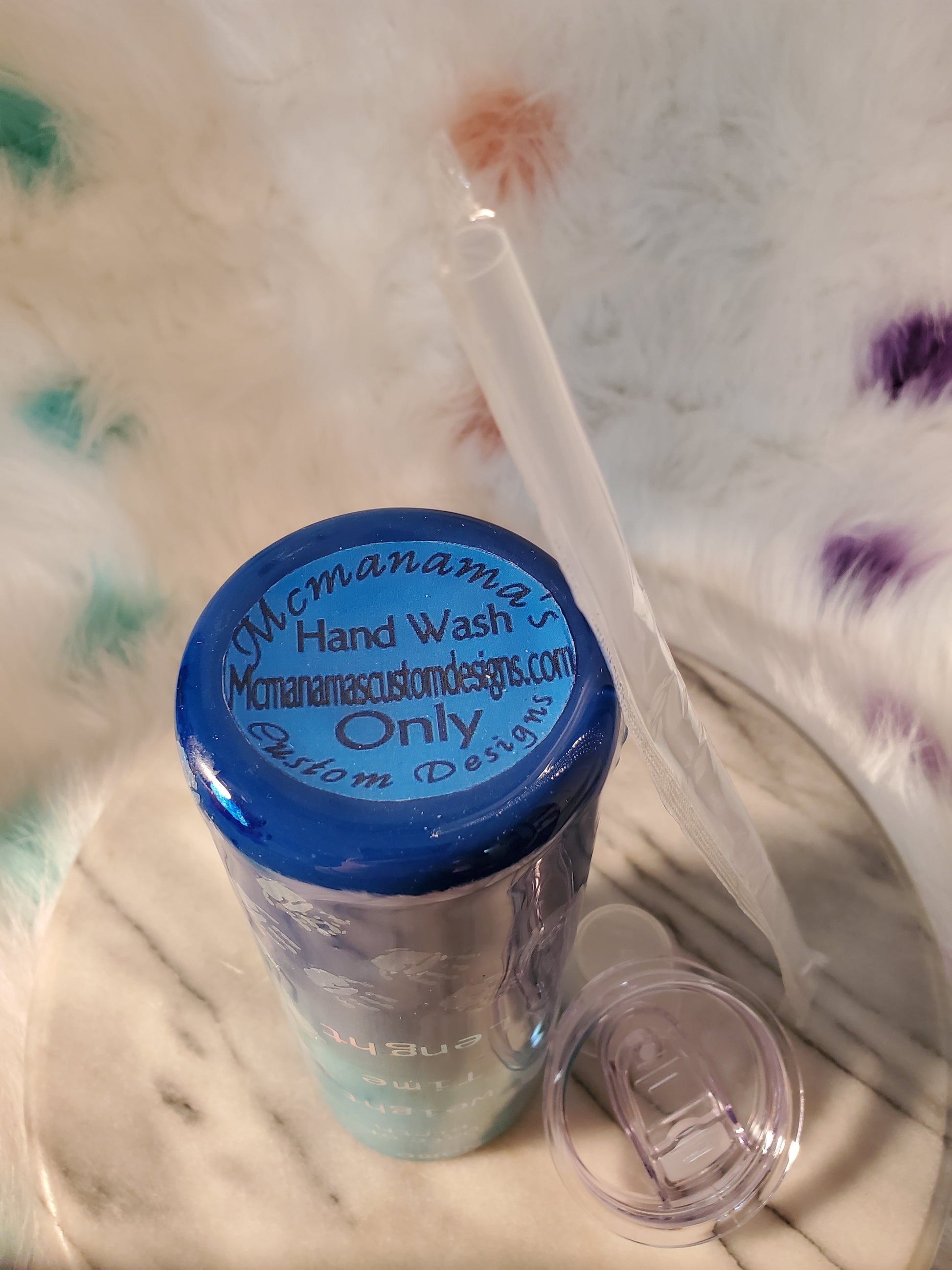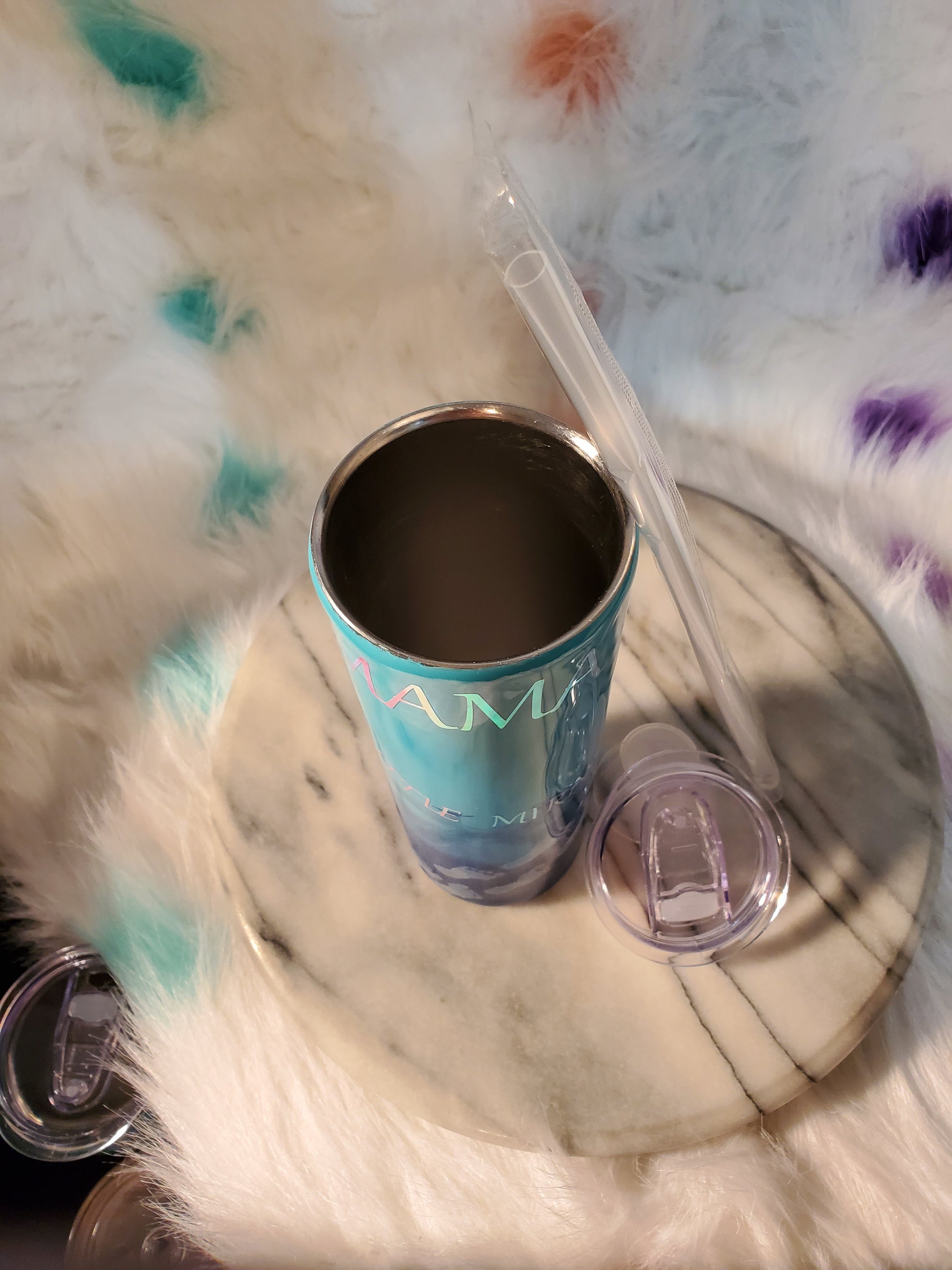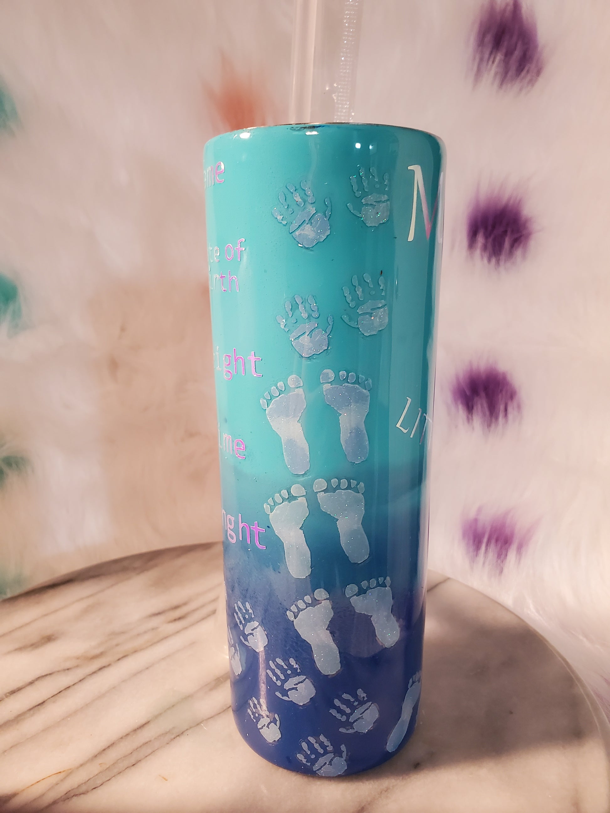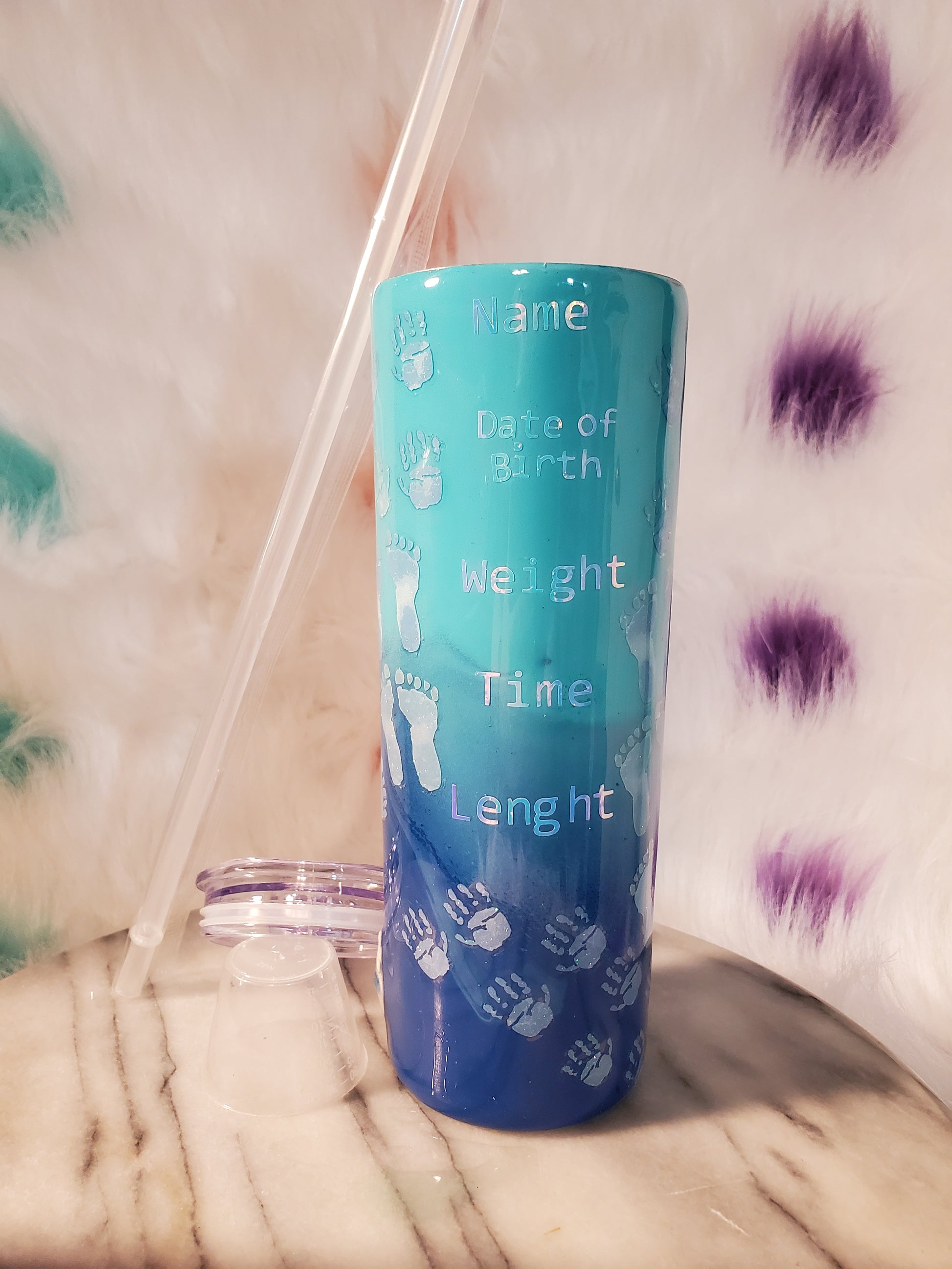 30oz Mama's little miracle double wall stainless steel tumbler cup.Keeps drinks cold or hot for hours. Don't put it in the dishwasher, microwave, freezer or direct sunlight. Hand wash only in warm water. I can put your baby boy's picture under the word mama and on the back I can put the baby's name, lenght,and other information. I can also make a cup in you have more than one baby.