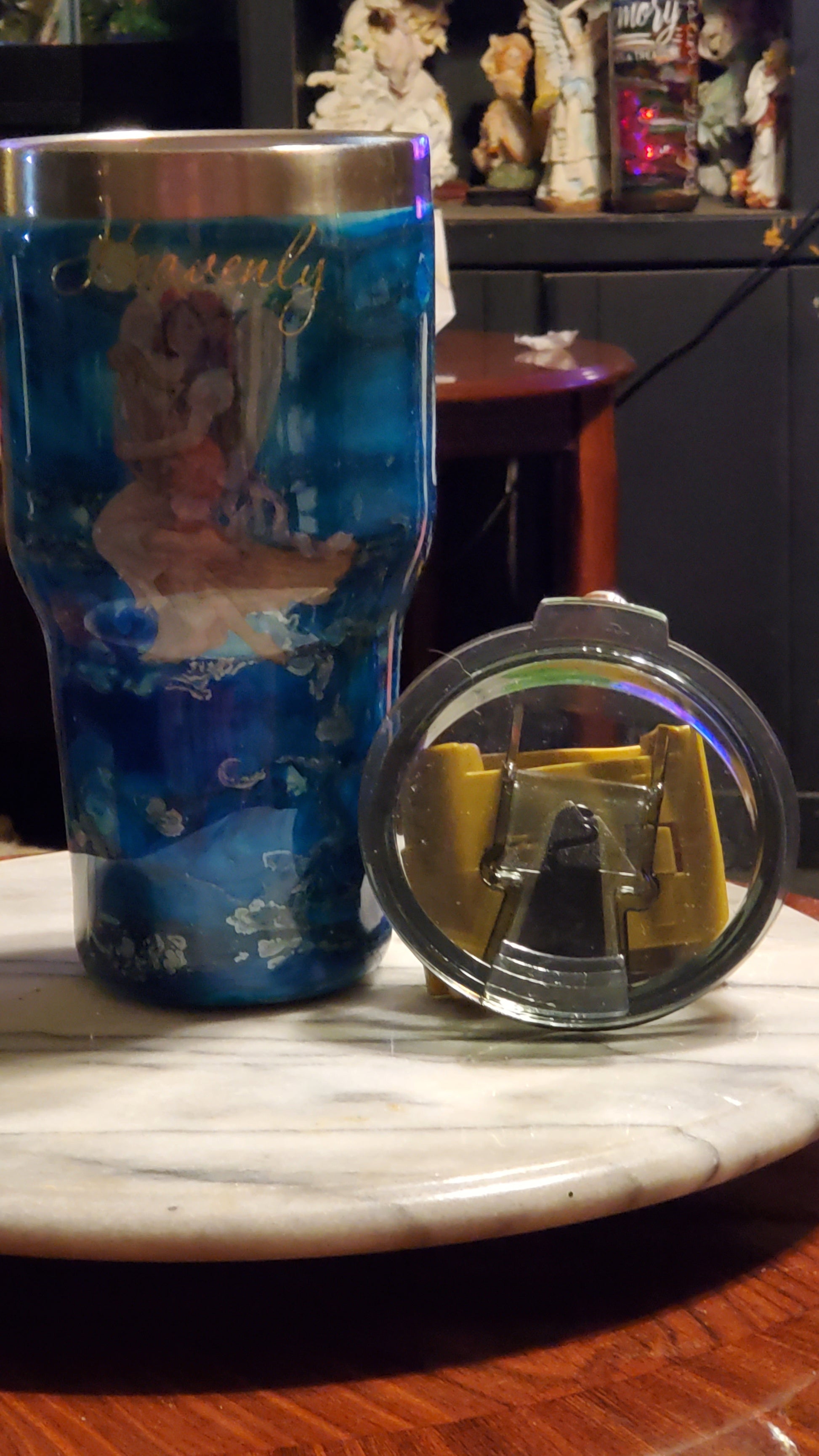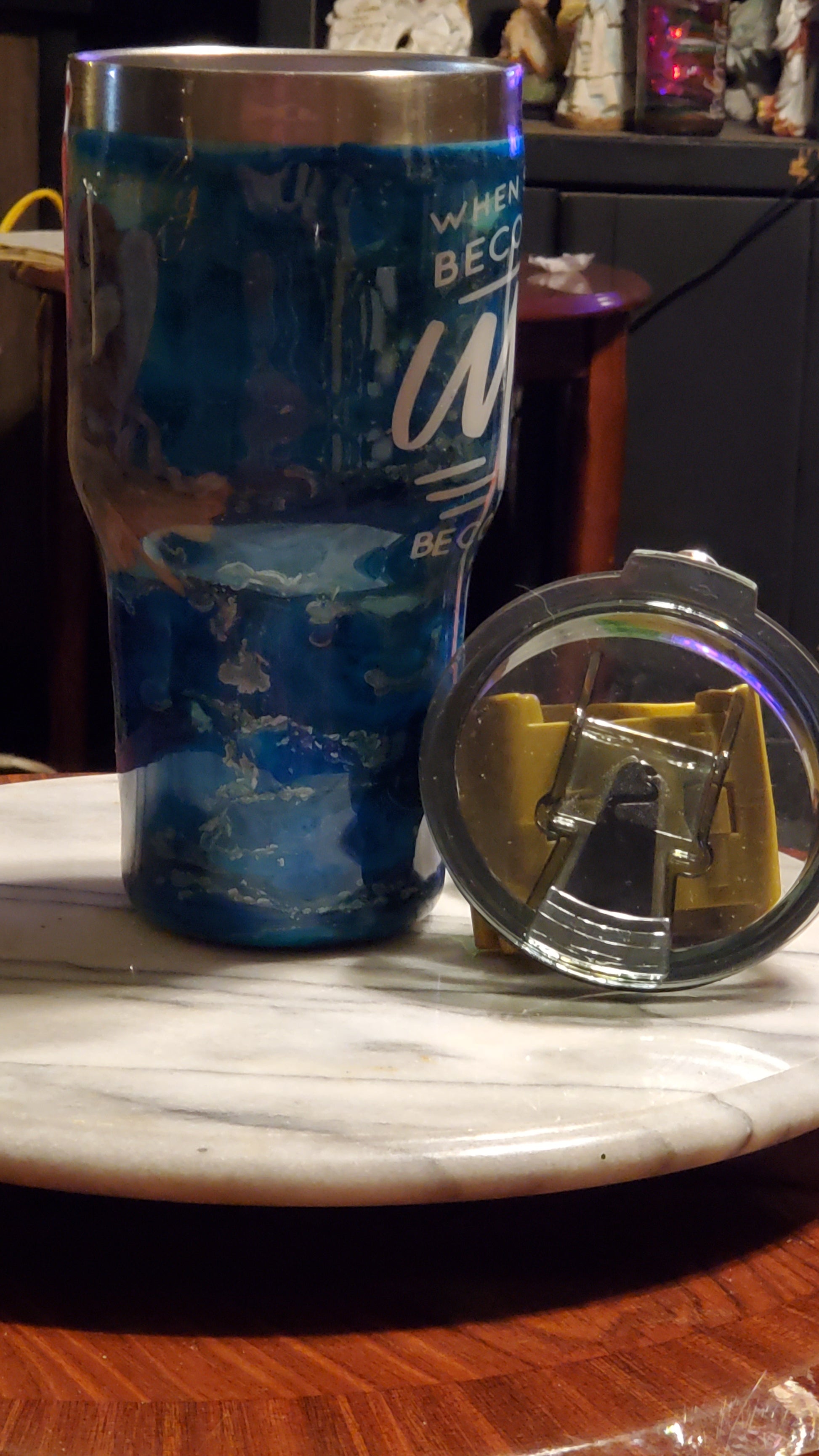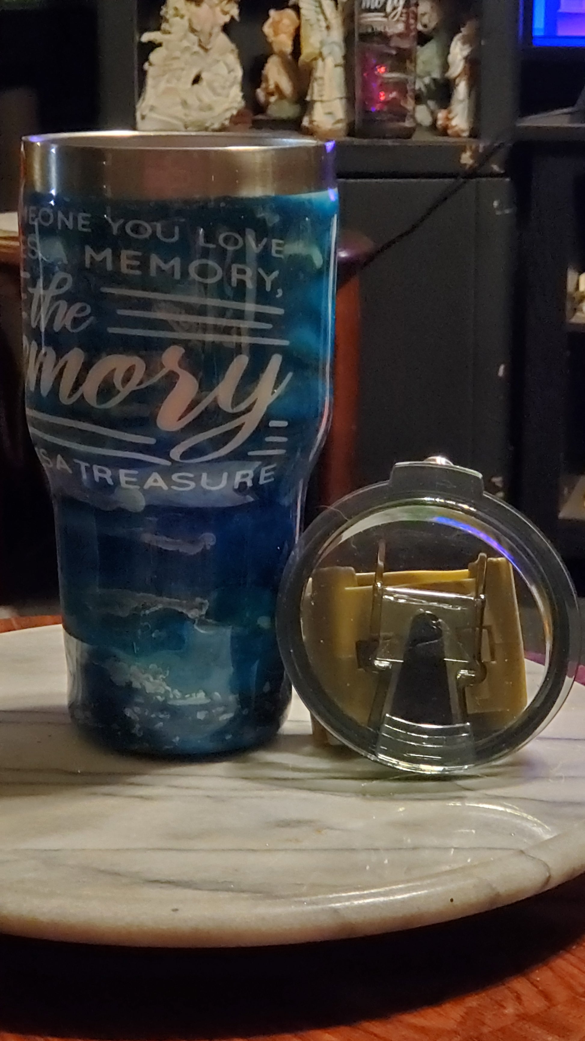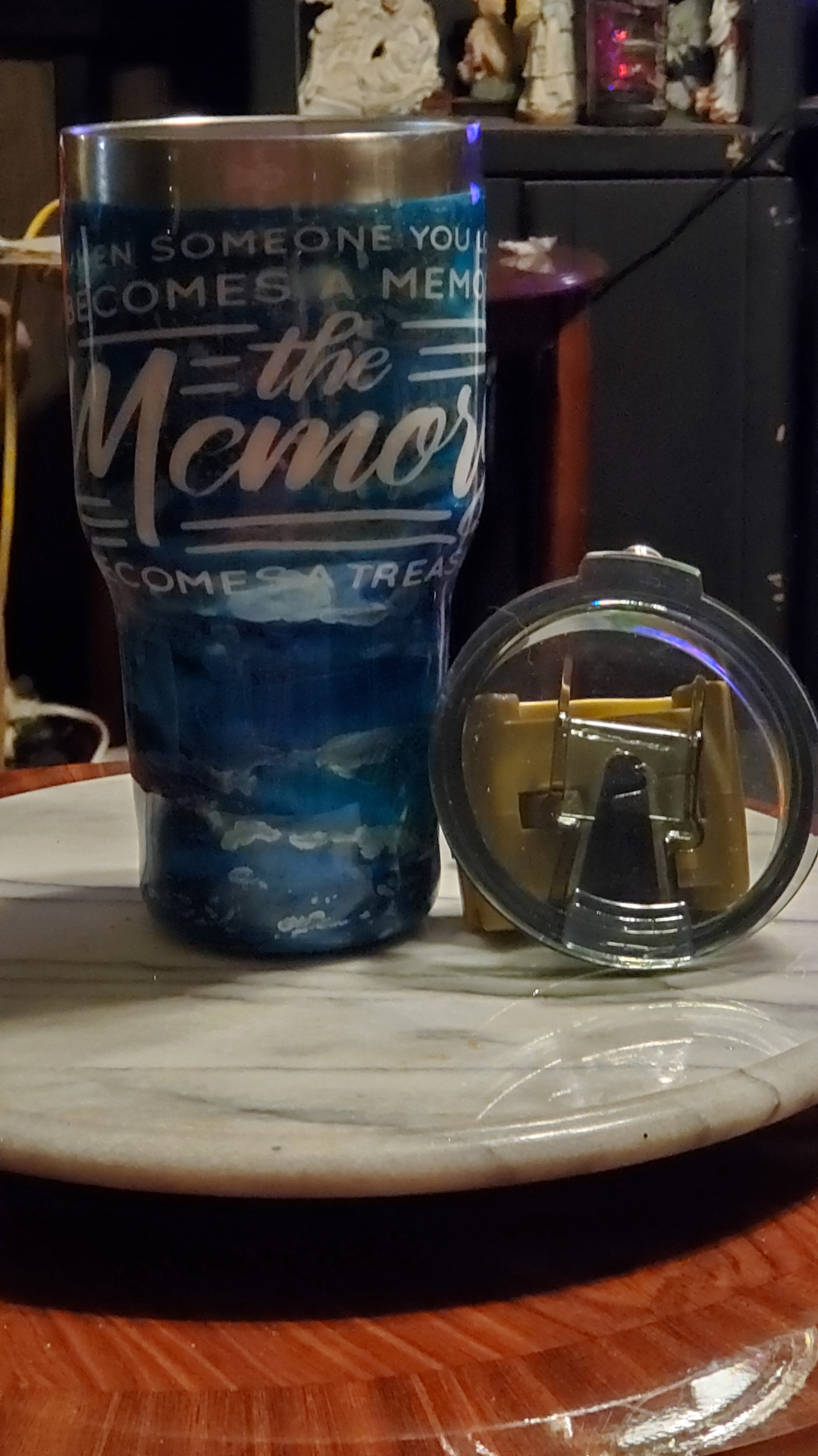 30 0z Memory Stainless steel built tumbler cup.Keeps drinks cold or hot for hours. Don't put it in the dishwasher, Microwave, freezer or direct sunlight. Hand wash only in warm water.