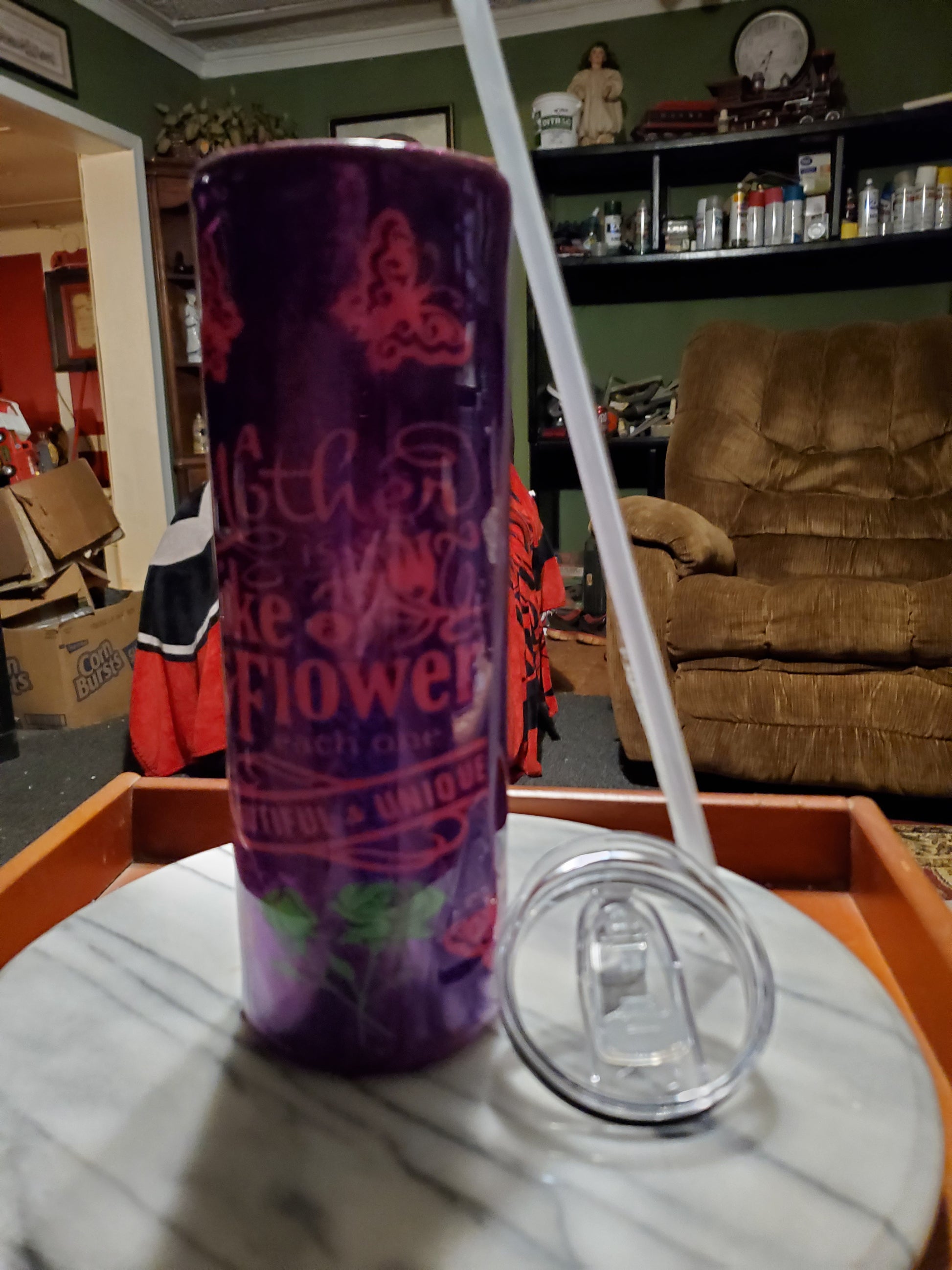 30 0z Mother is like a flower Stainless steel hogg tumbler cup. Keeps drinks cold or hot for hours. Don't put it in the dishwasher, microwave, freezer or direct sunlight. Hand wash only in warm water.