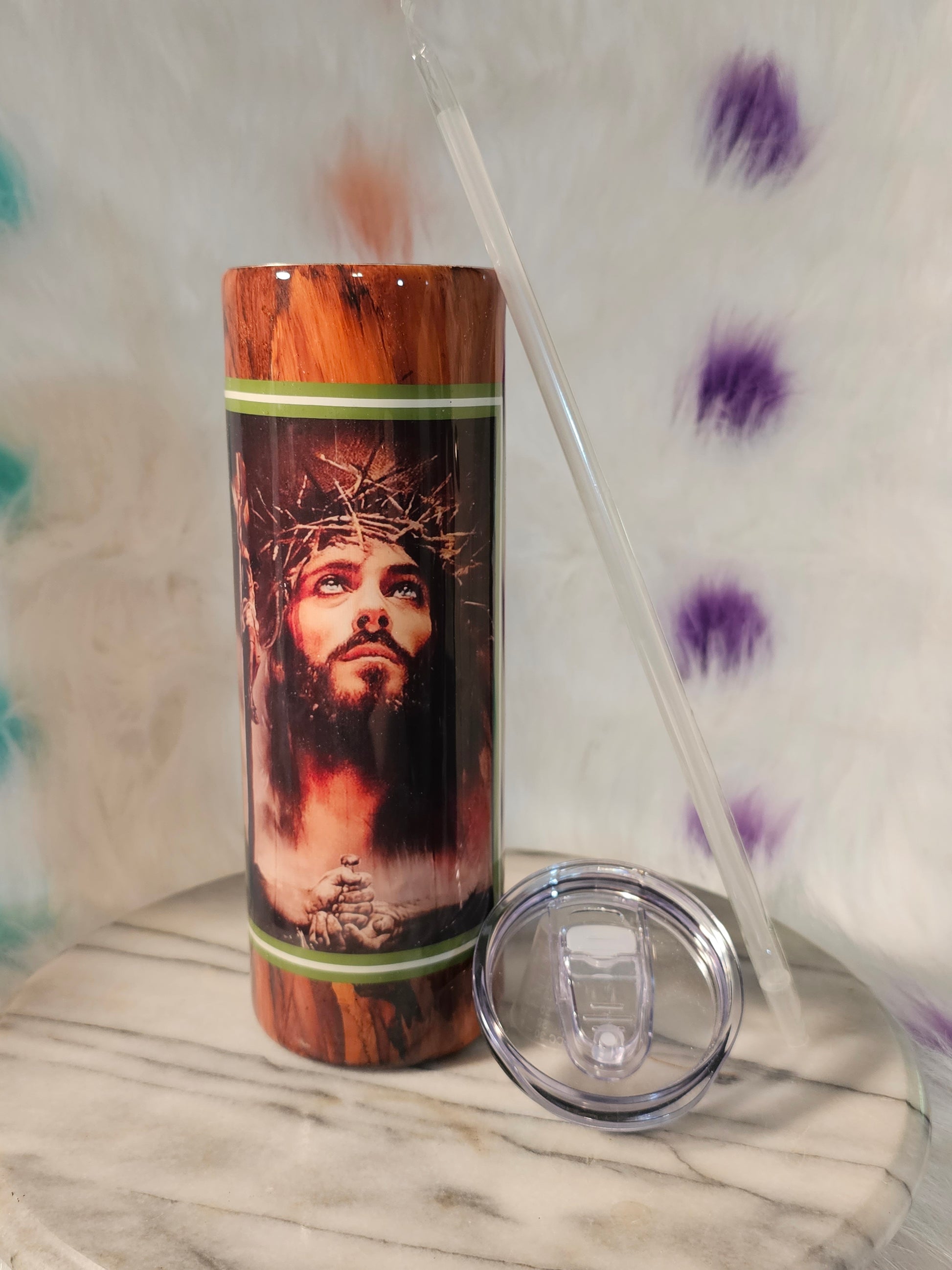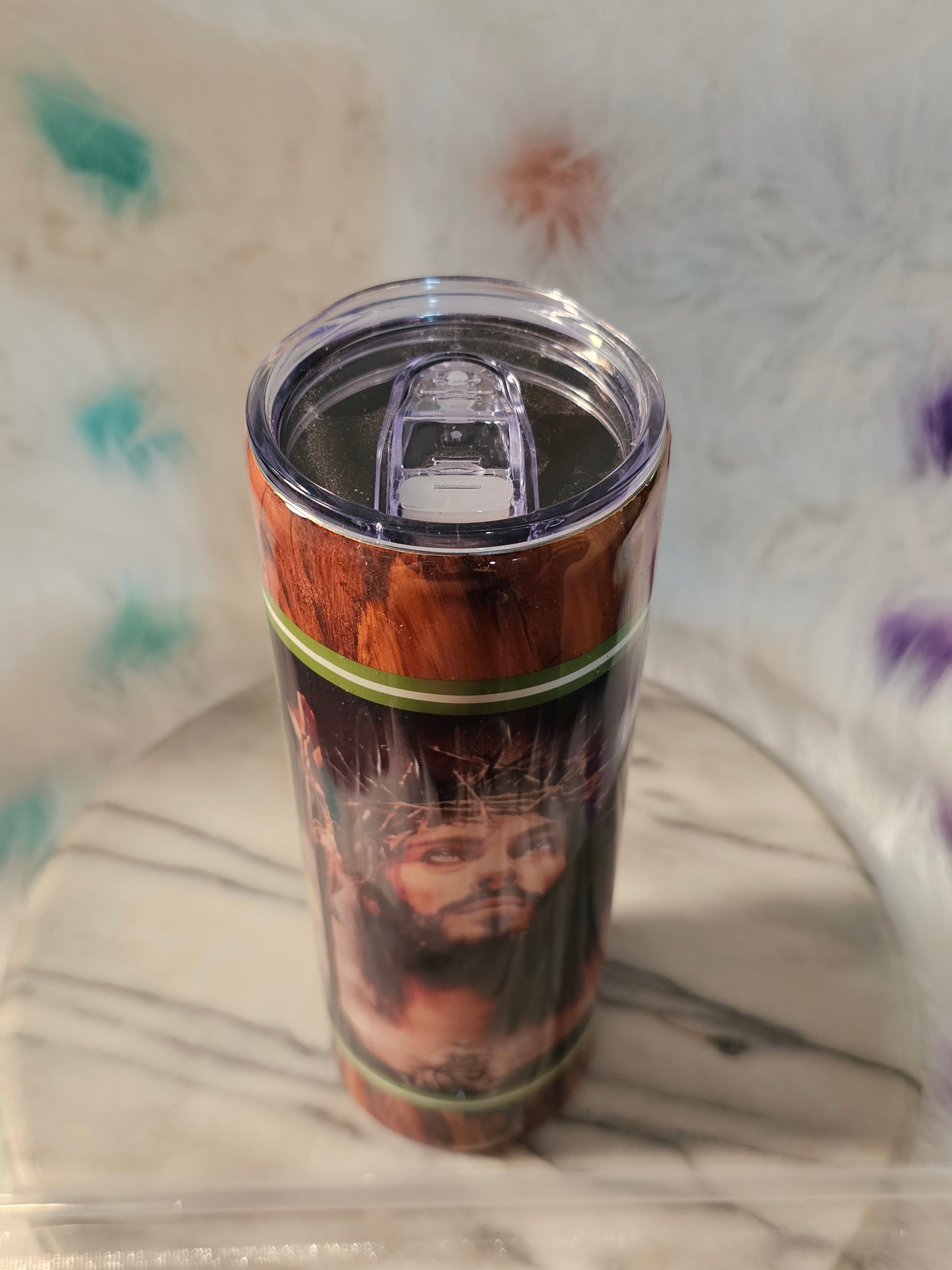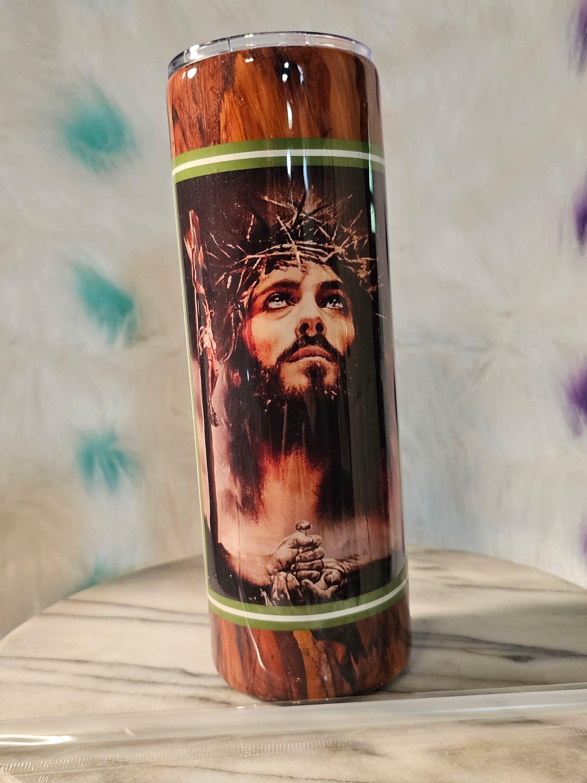 30oz Our lord double wall stainless steel tumbler cup.Keeps drinks cold or hot for hours. Don't put it in the dishwasher, microwave, freezer or direct sunlight. Hand wash only in warm water. I couldn't put the back of the cup picture's on the sight because it has a personal picture on it.This cup has a new home but I can make you one with a personal picture on it.