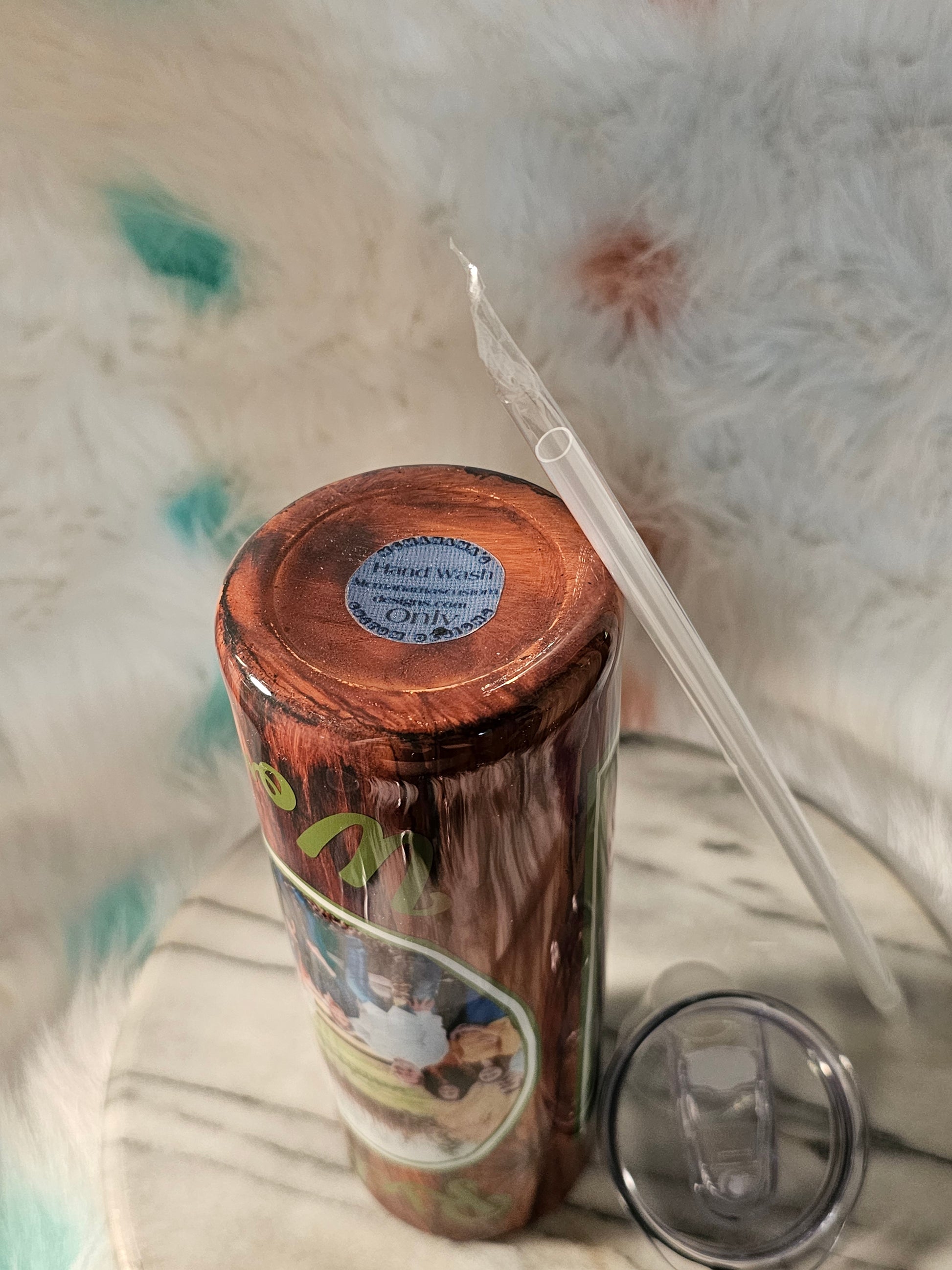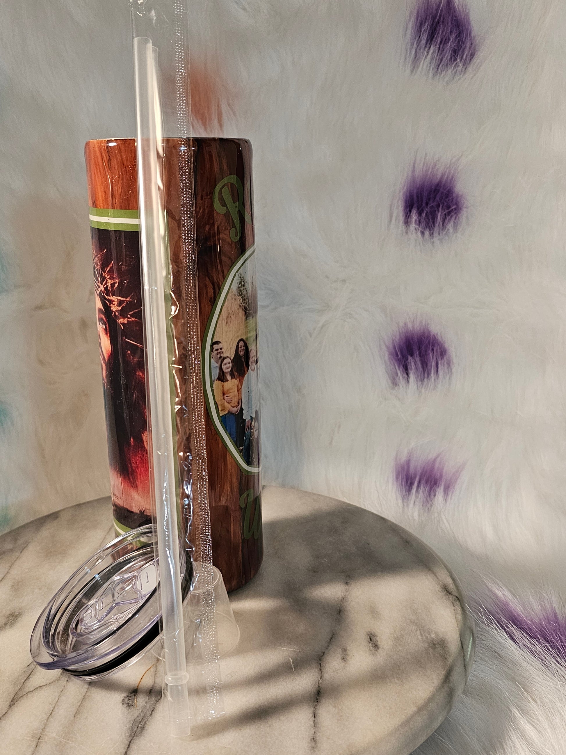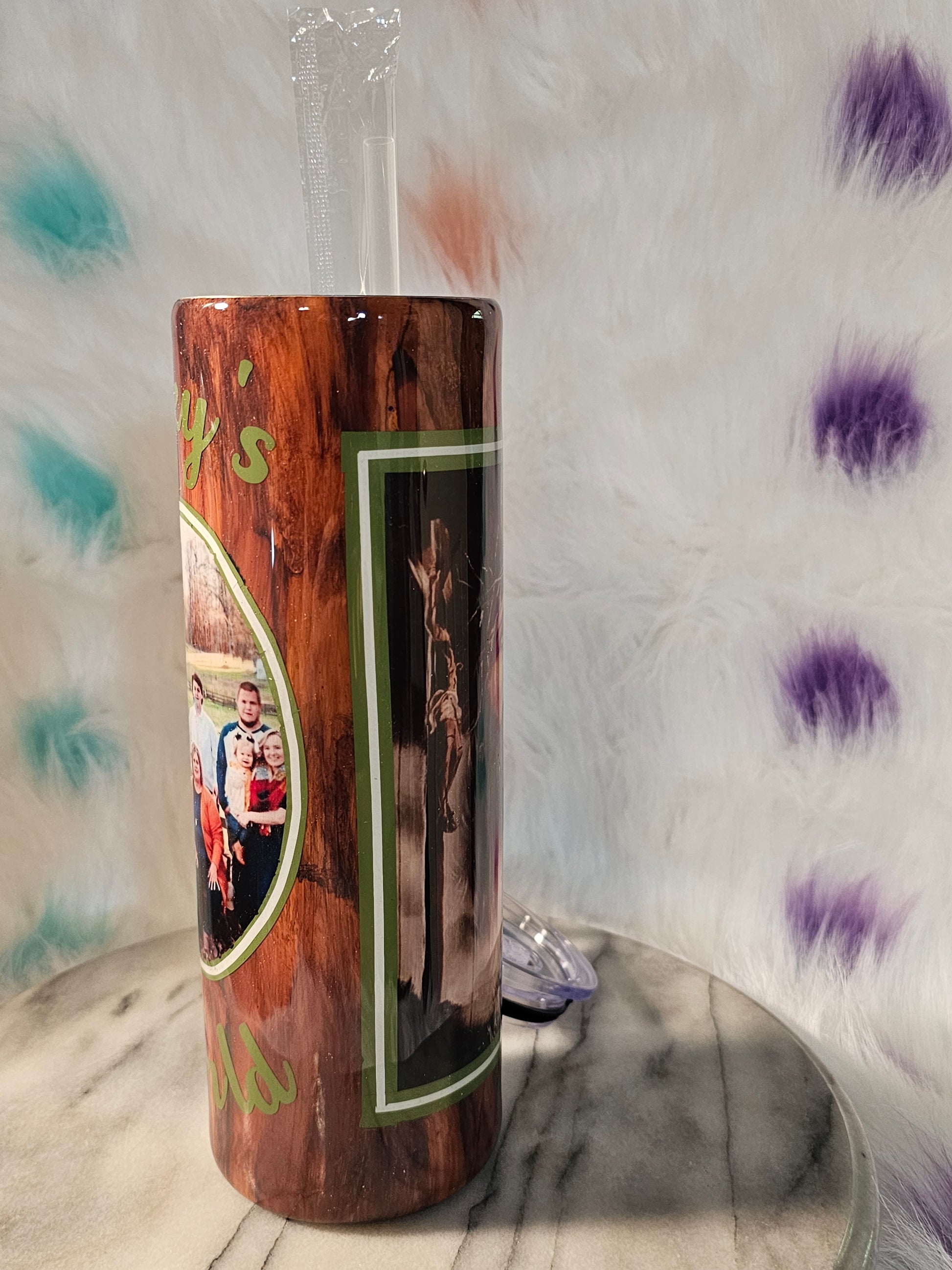 30oz Our lord double wall stainless steel tumbler cup.Keeps drinks cold or hot for hours. Don't put it in the dishwasher, microwave, freezer or direct sunlight. Hand wash only in warm water. I couldn't put the back of the cup picture's on the sight because it has a personal picture on it.This cup has a new home but I can make you one with a personal picture on it.
