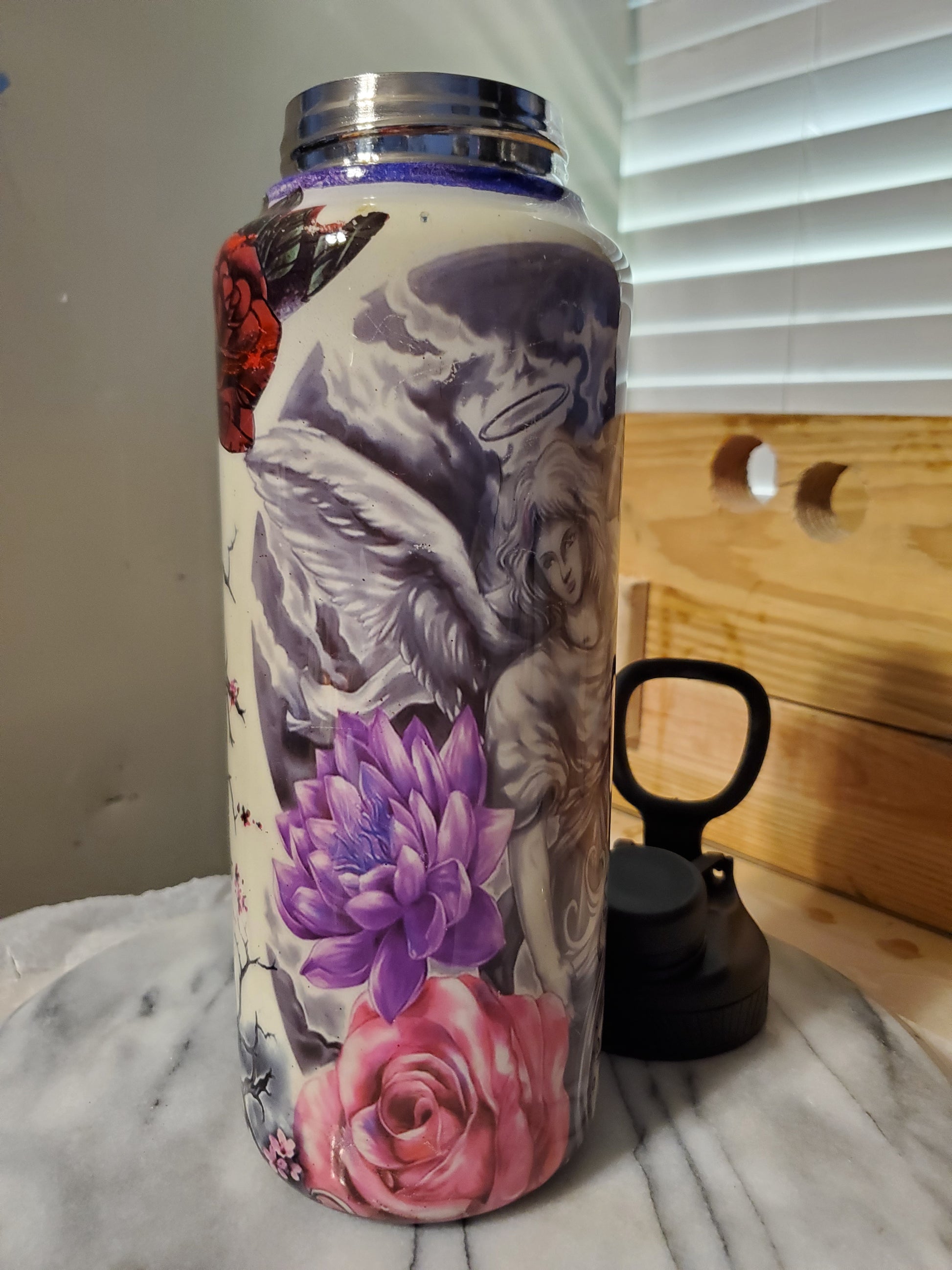 This is a demo cup but I can make another 40 oz My Guardian Angel Stainless steel tumbler cup (Ranger Pro) .Keeps drinks cold for 24 hours and hot for 12 hours. Don't put it in the dishwasher. Hand wash only.I can put your name on it. Charge it with light and it will glow in the dark.