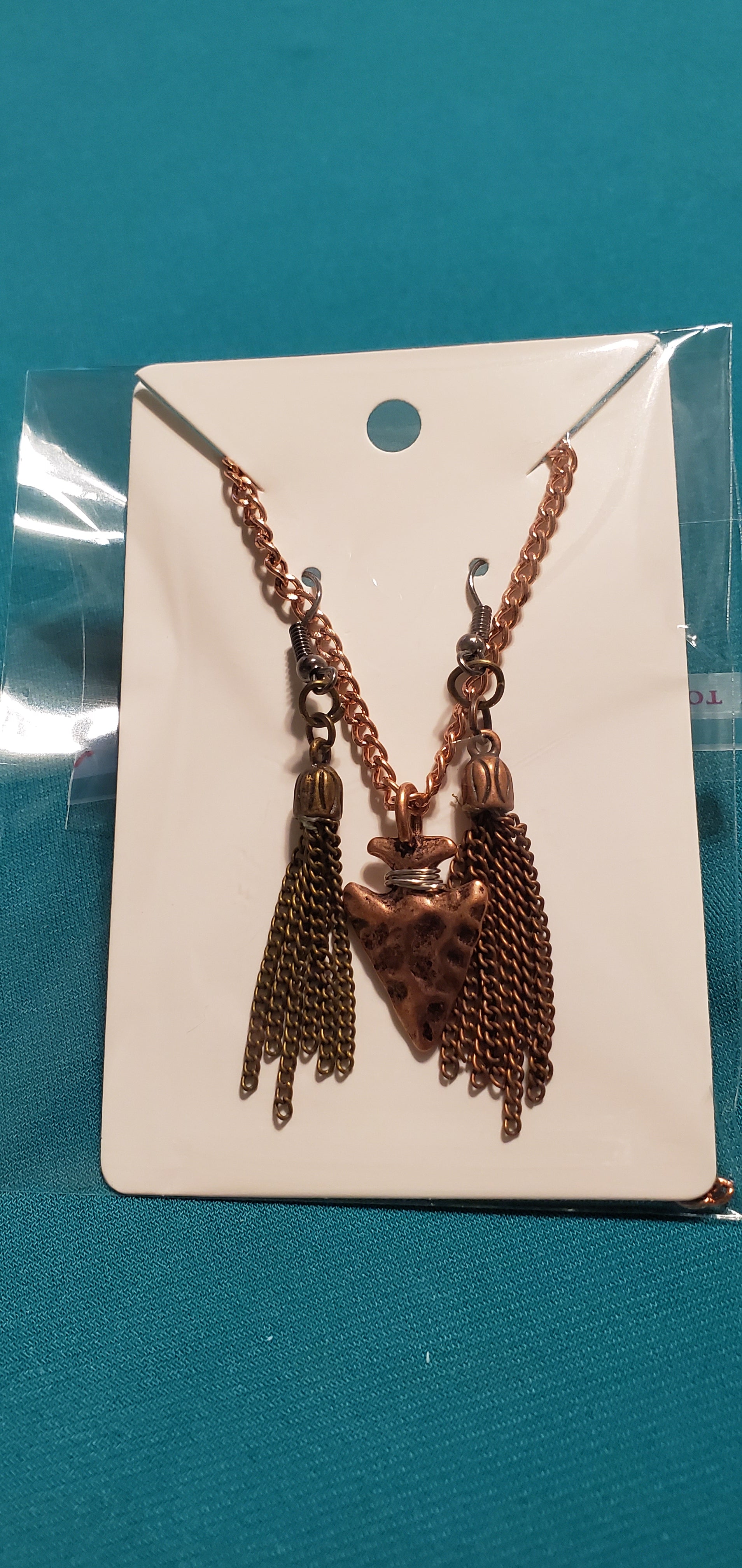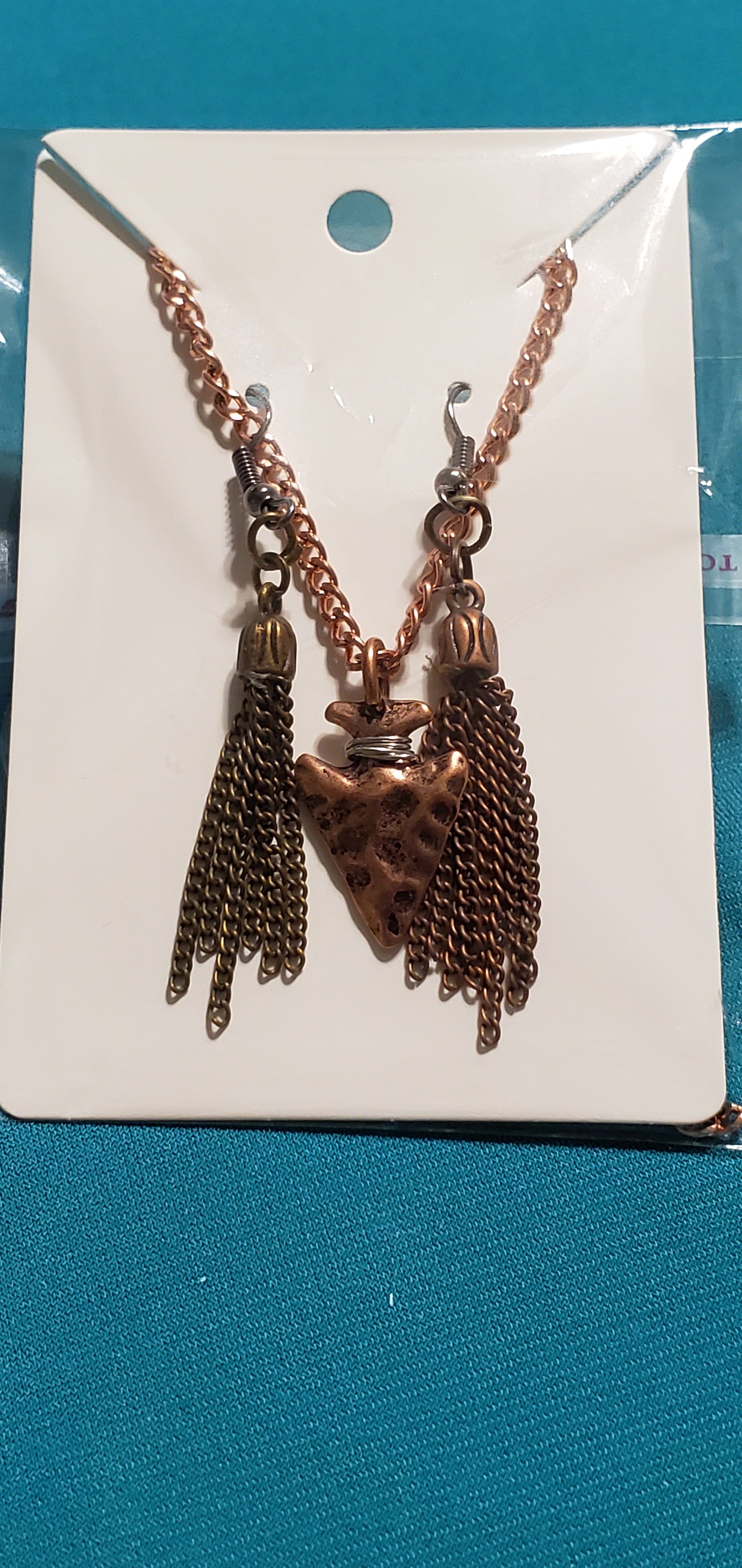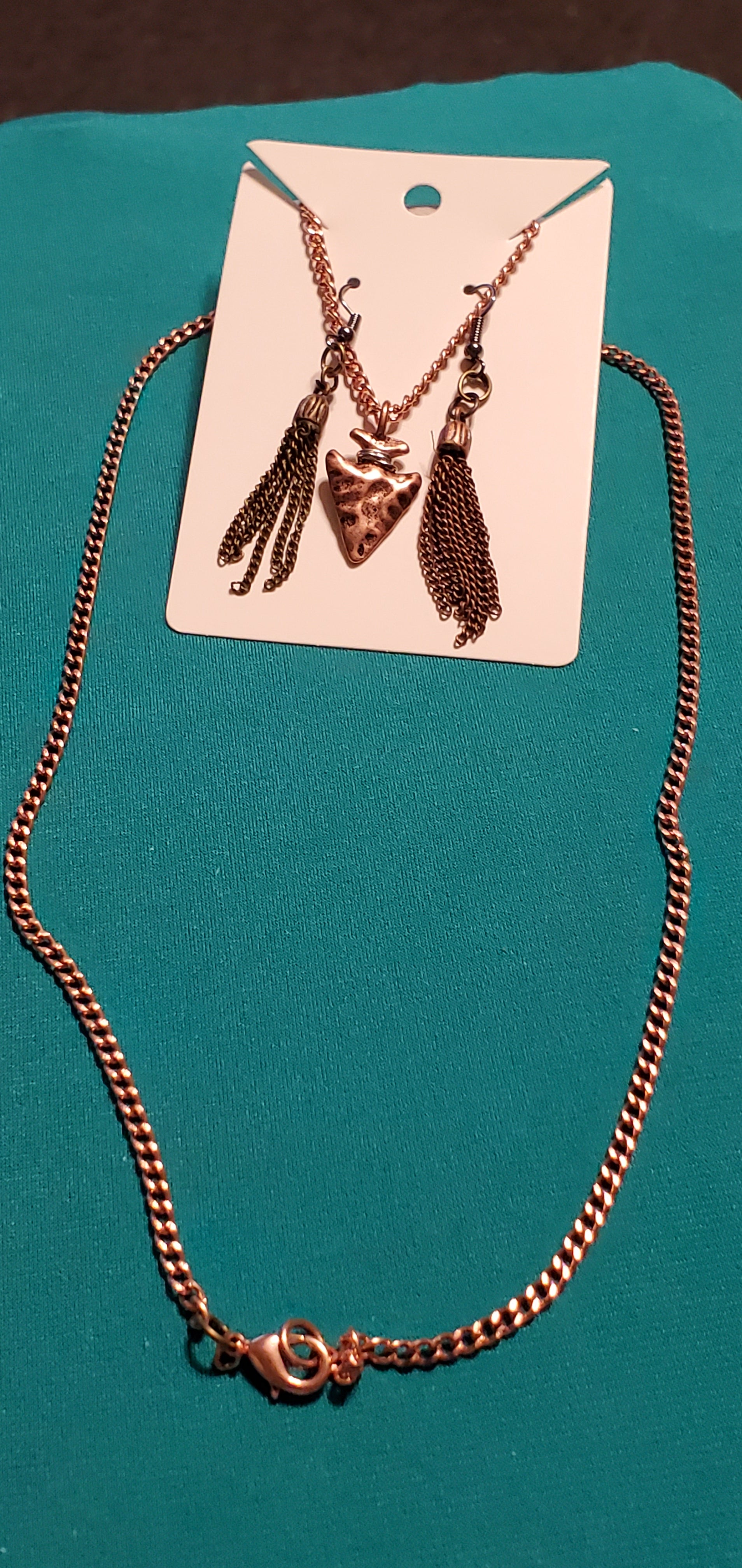 Bronze plated stainless steel arrowhead necklace and bronze plated chain links earrings. You can get the set for $10.00.