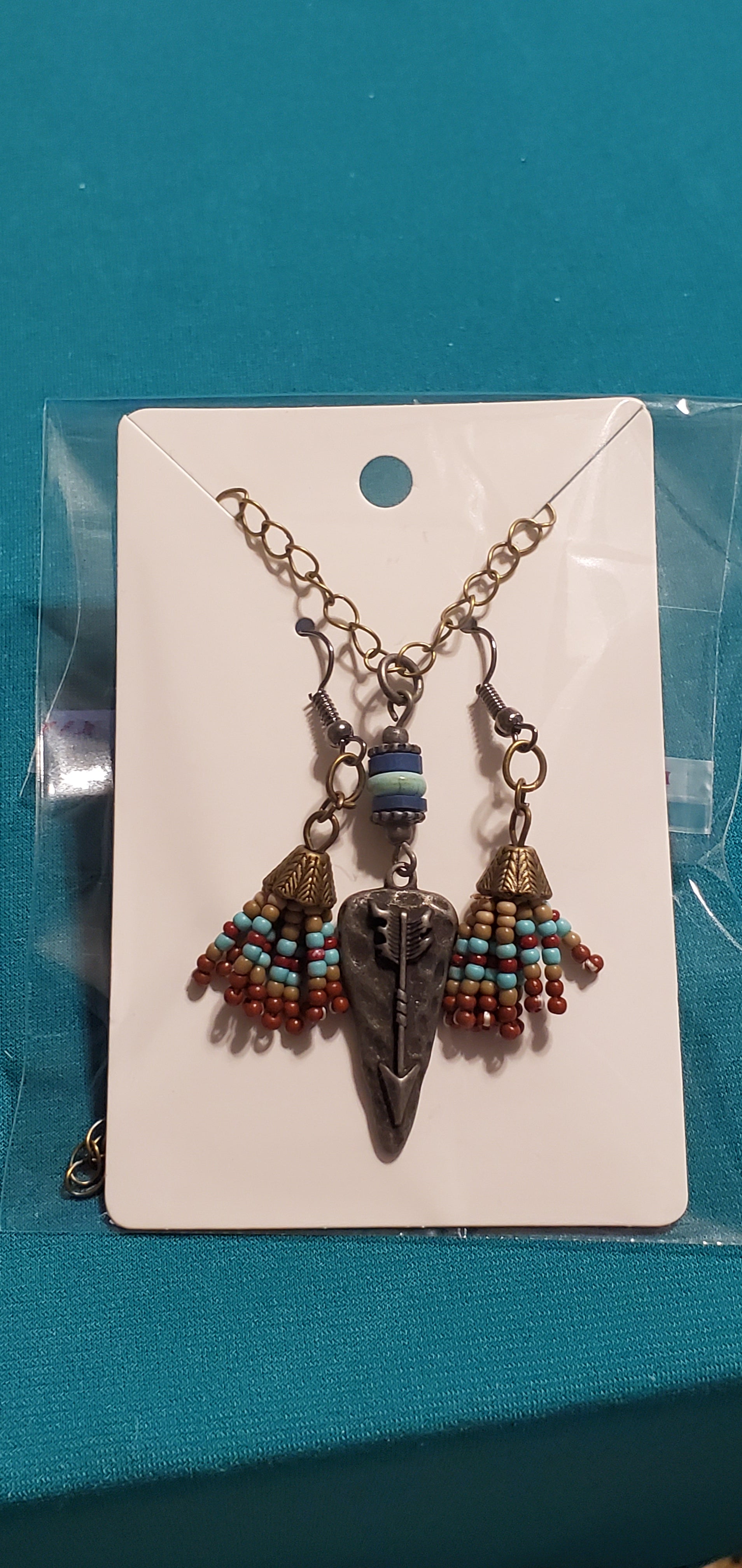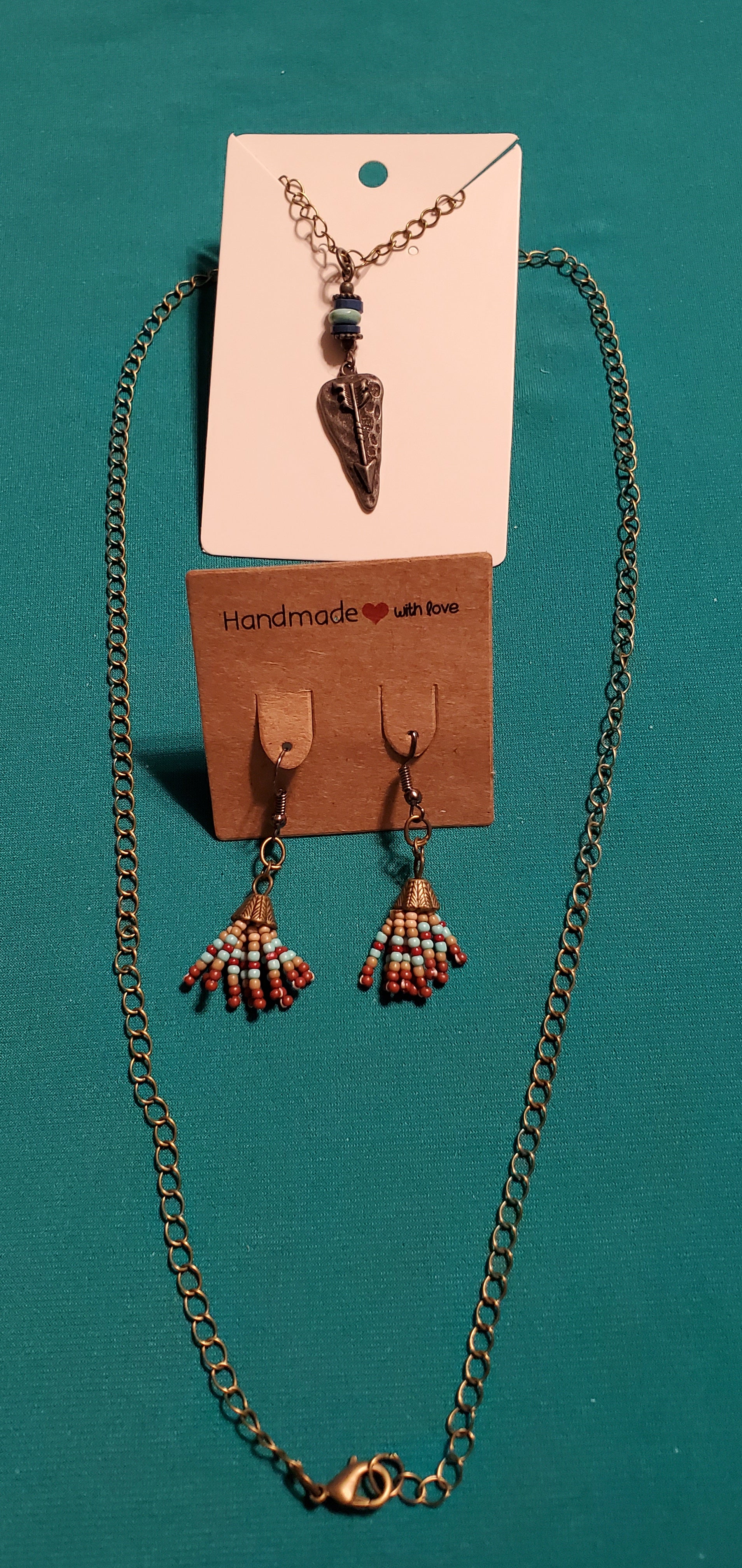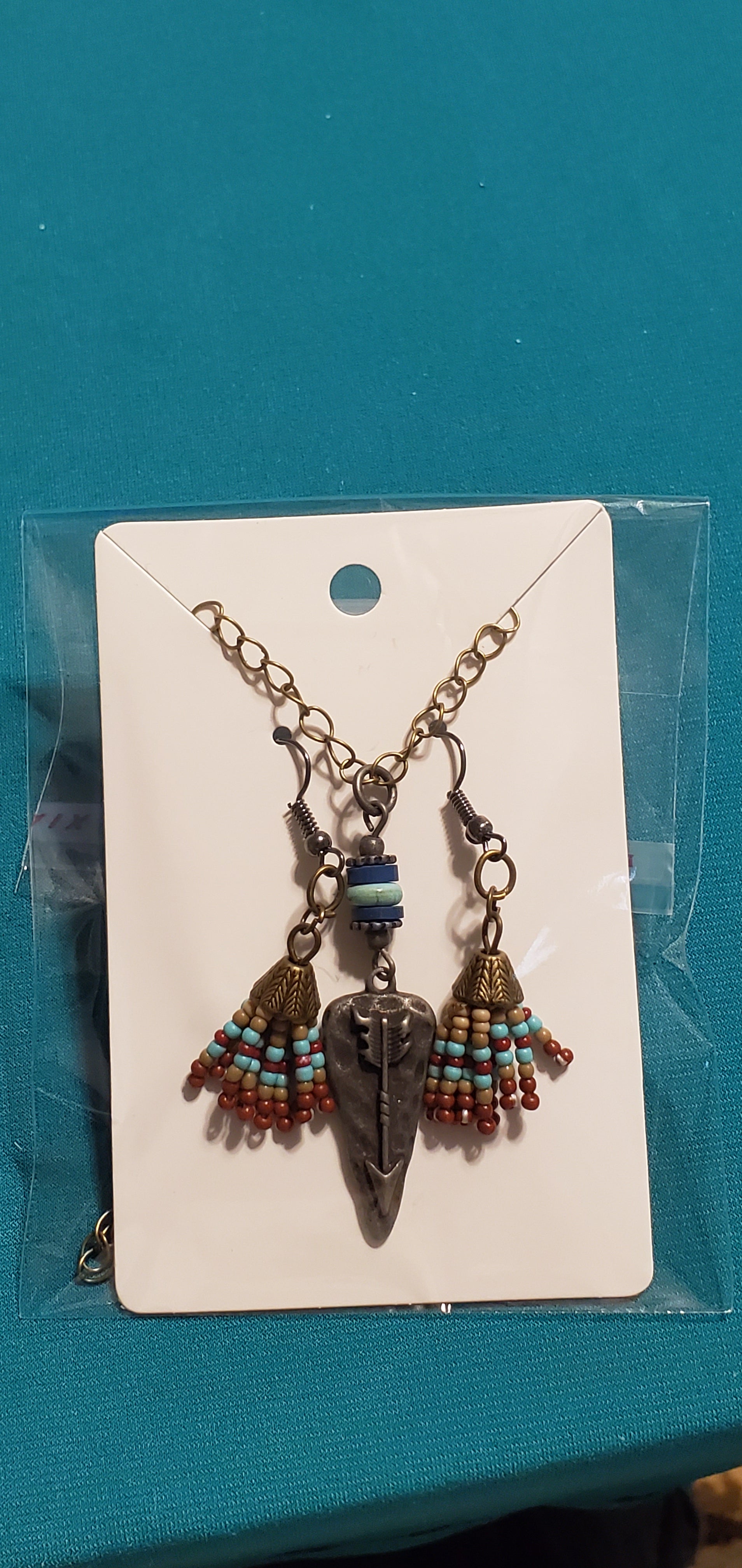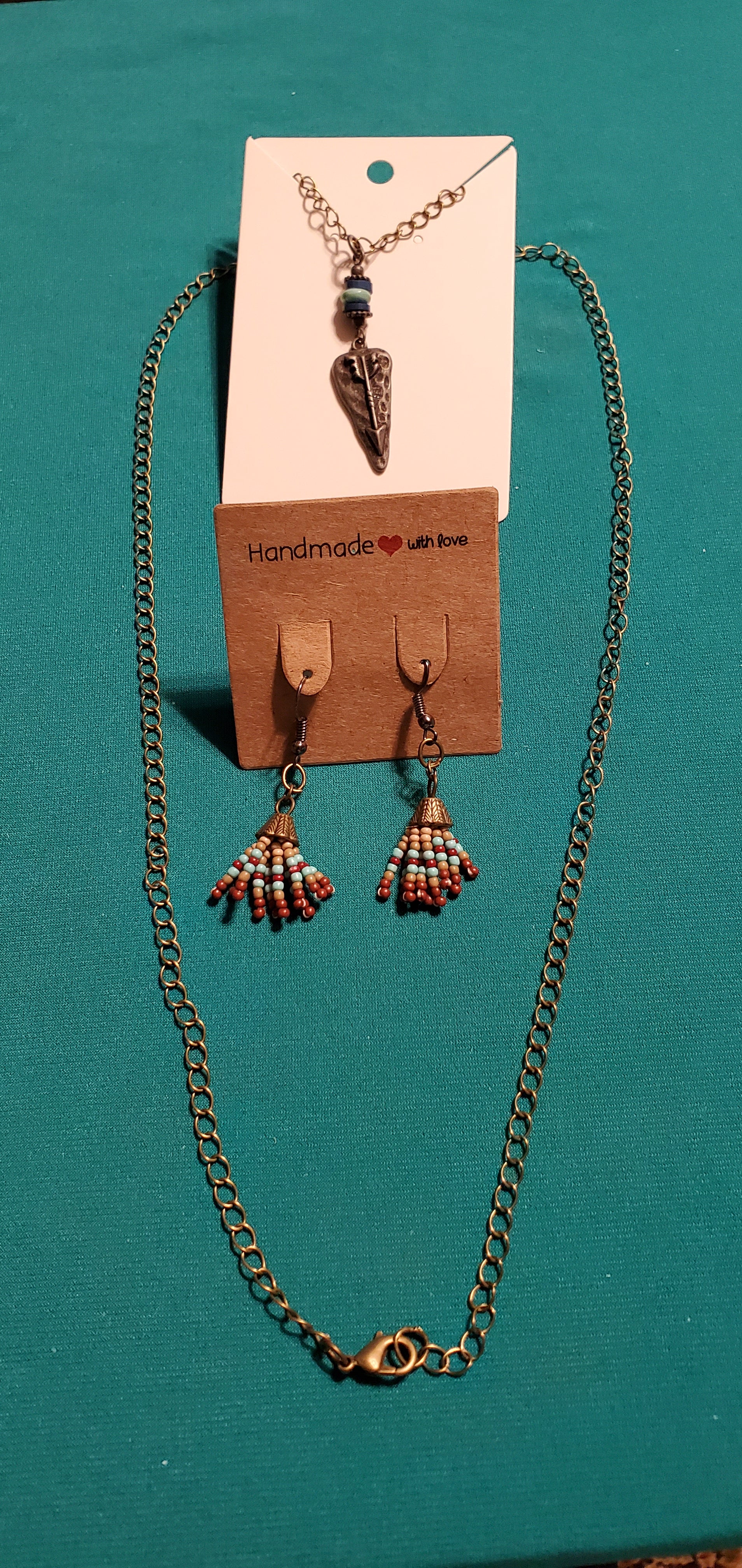 Bronze plated Indian beads earrings on fish hook post.You can get the earrings for $5.00 or the necklace for $5.00 or you can get the set for $10.00.