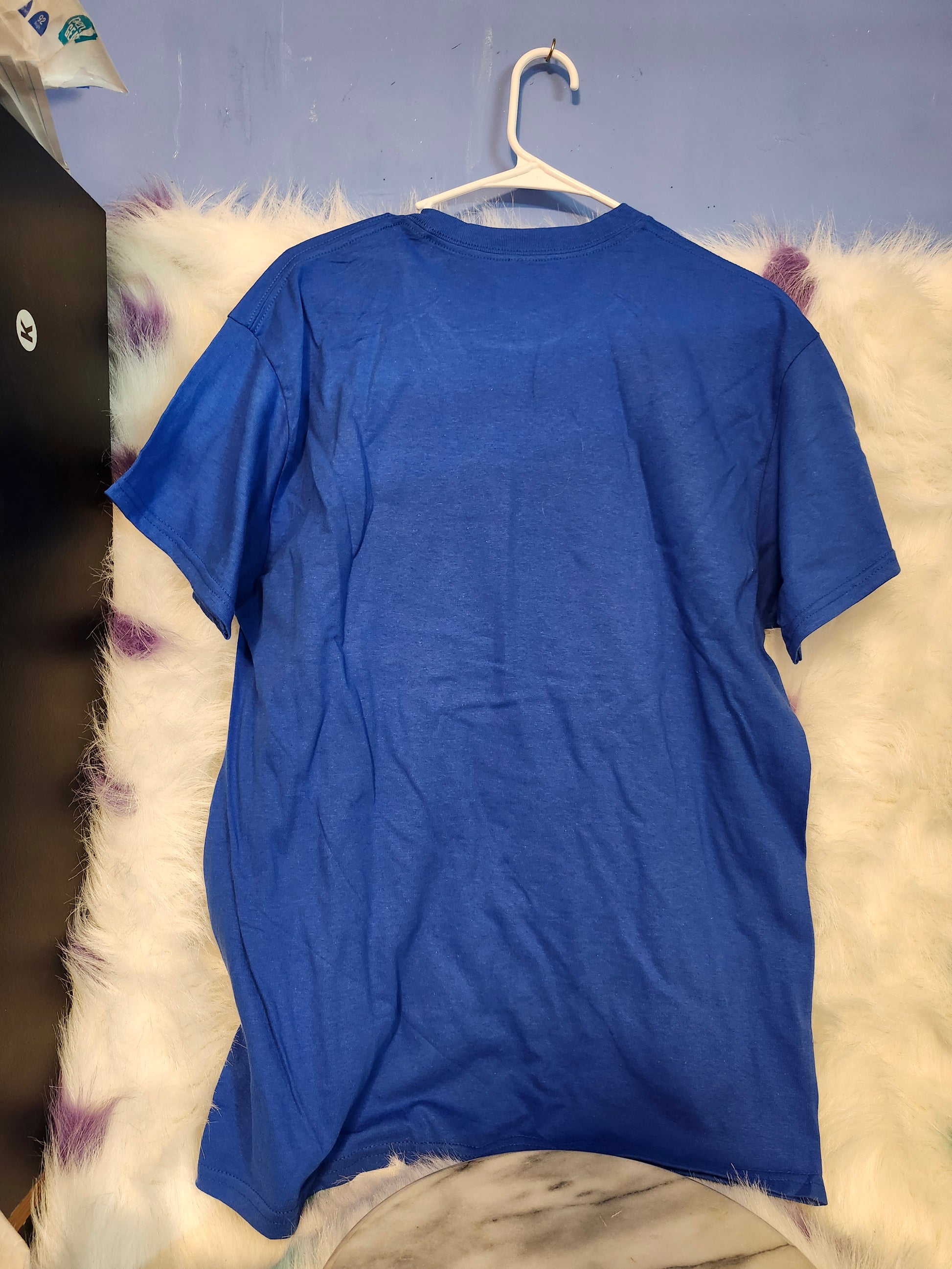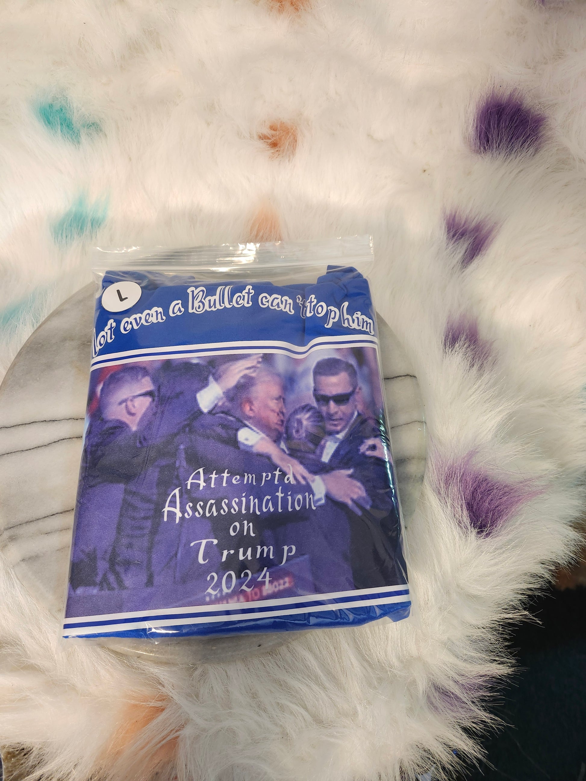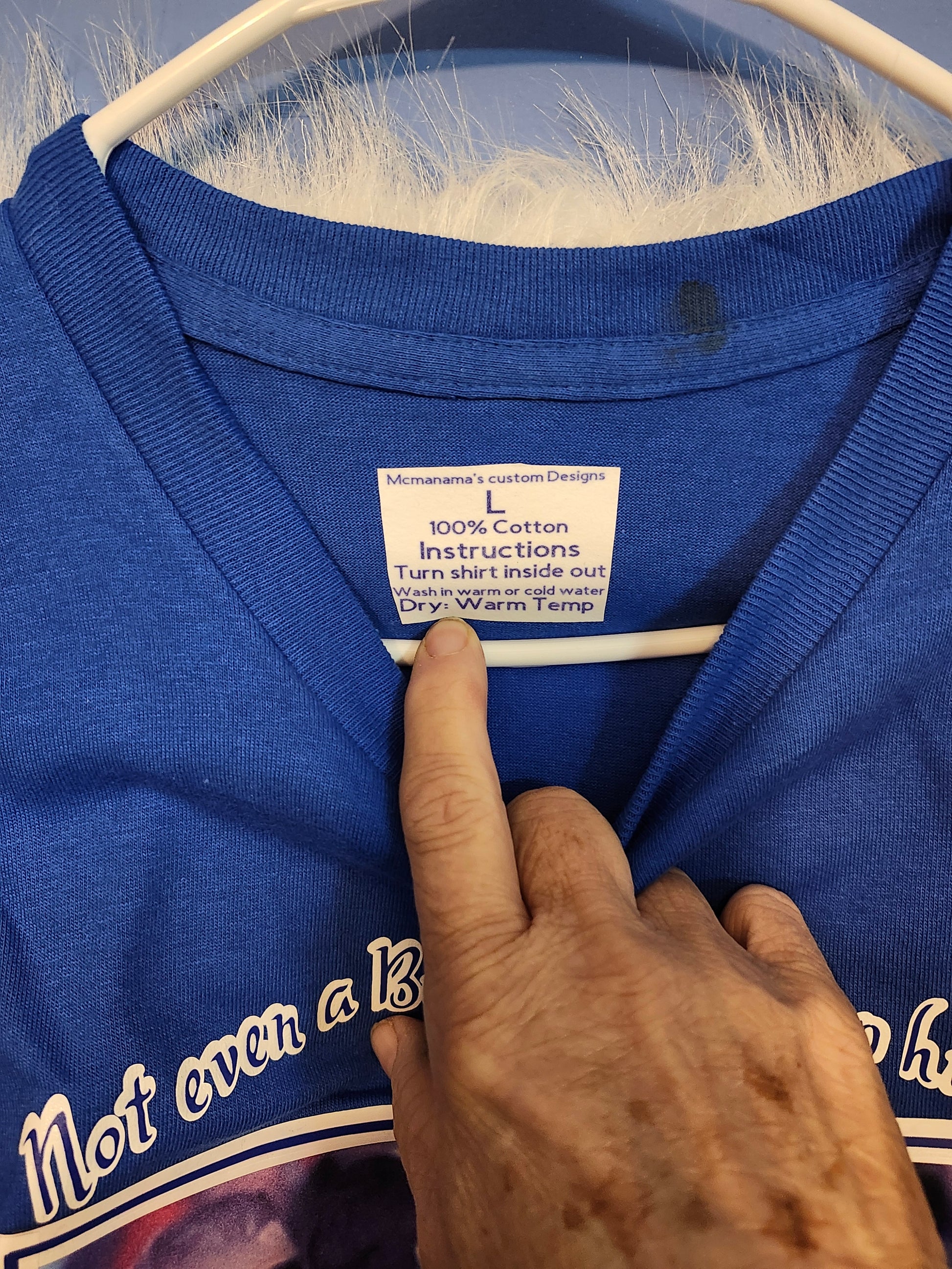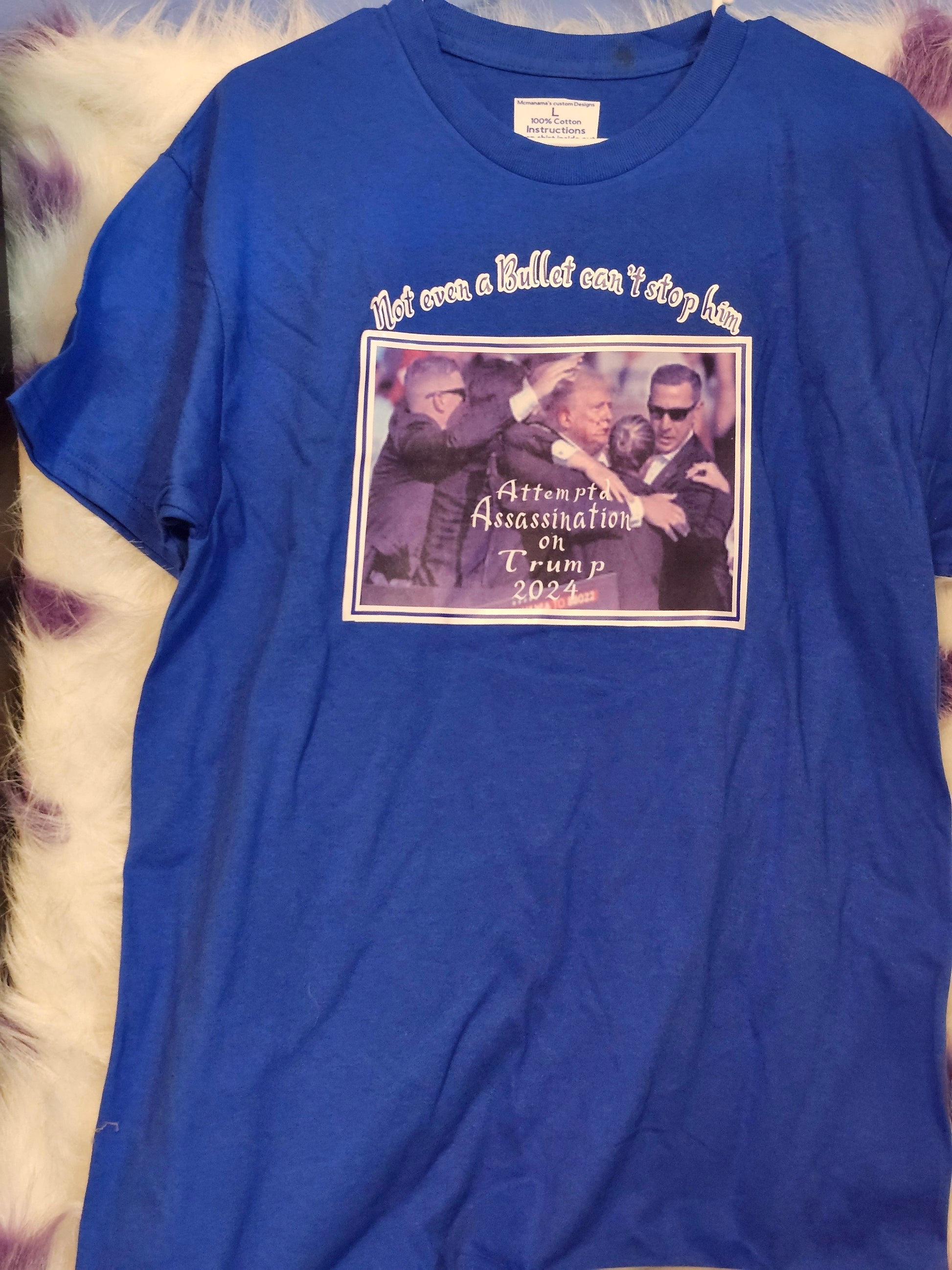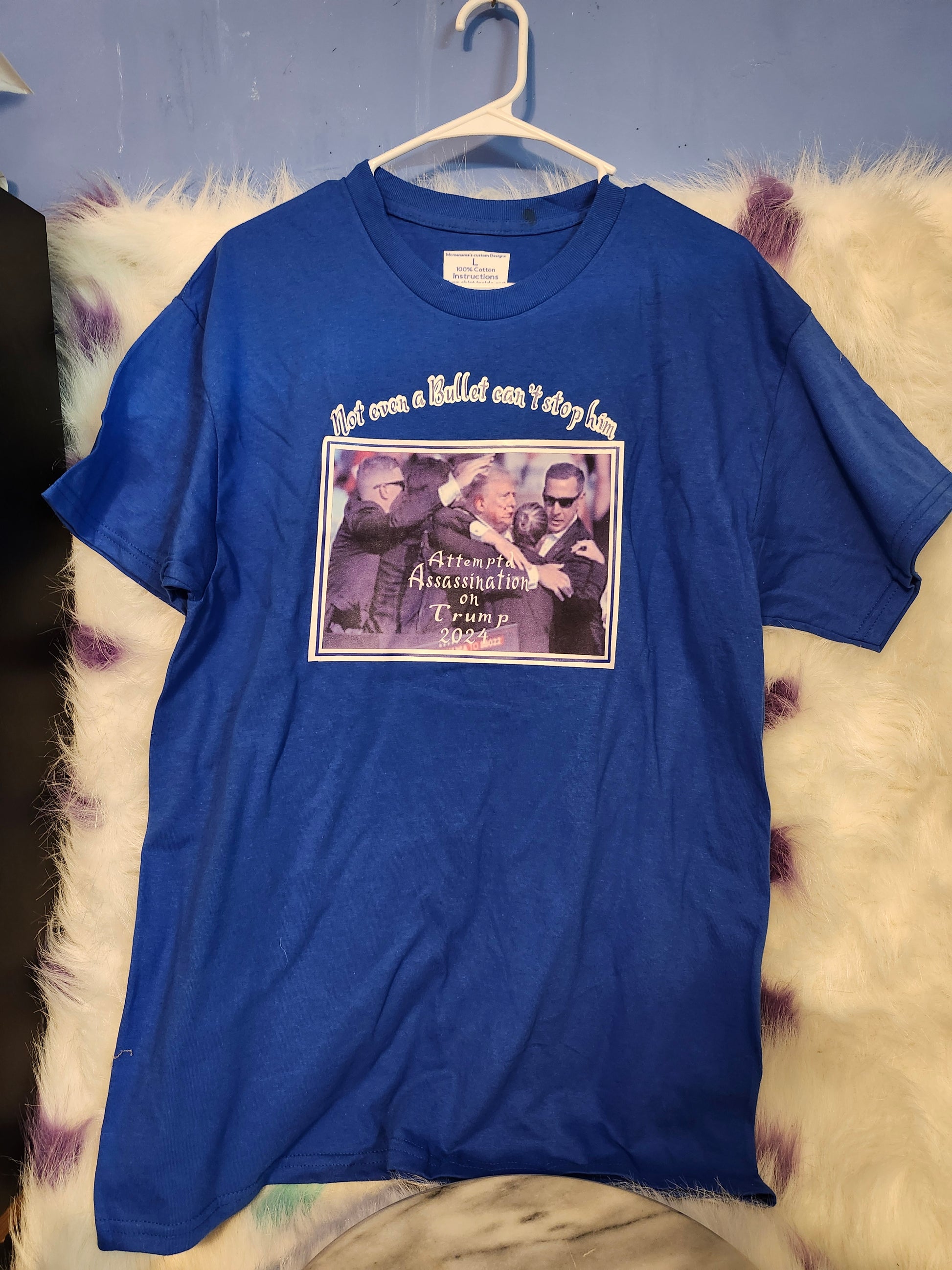 Size L 100% blue cotton Not even a bullet can stop him tshirt. Wash in cold or warm water and turn Shirt inside out.Dry on low heat or air dry.DO NOT wash in Hot water.Your information is protected. I make different colors, sizes and designs.Text me at 678-209-6711 and let me know what color, size and designs you would like.