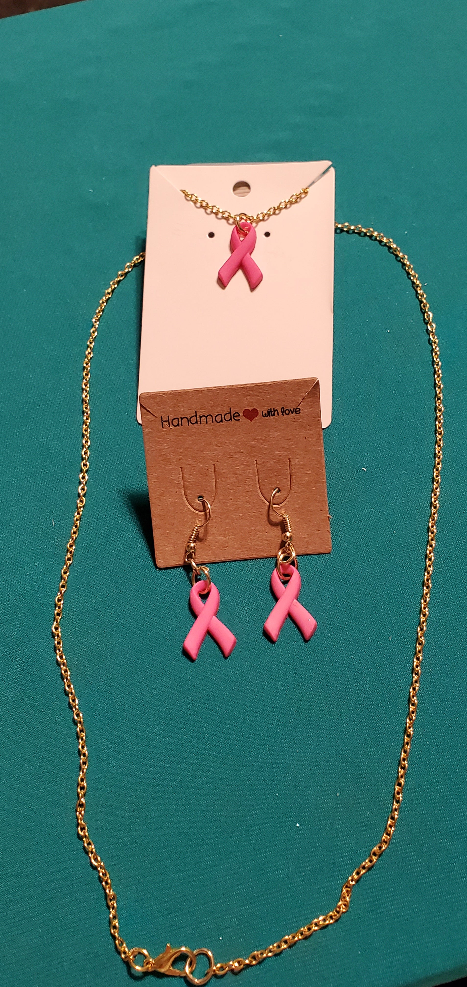 Cancer free gold plated necklace. You can get the necklace for $5.00 or the earrings for $5.00 and also the set for $10.00.