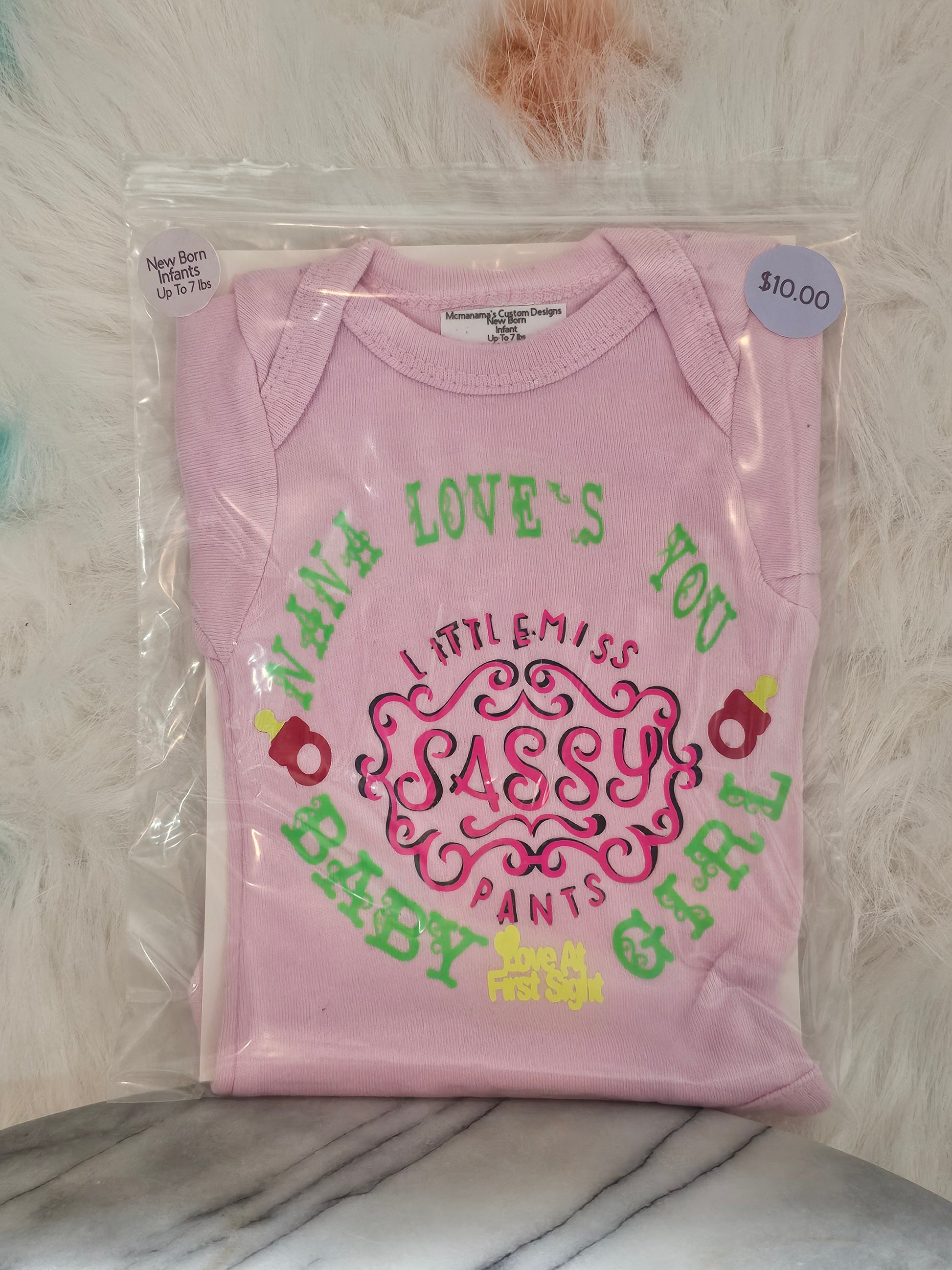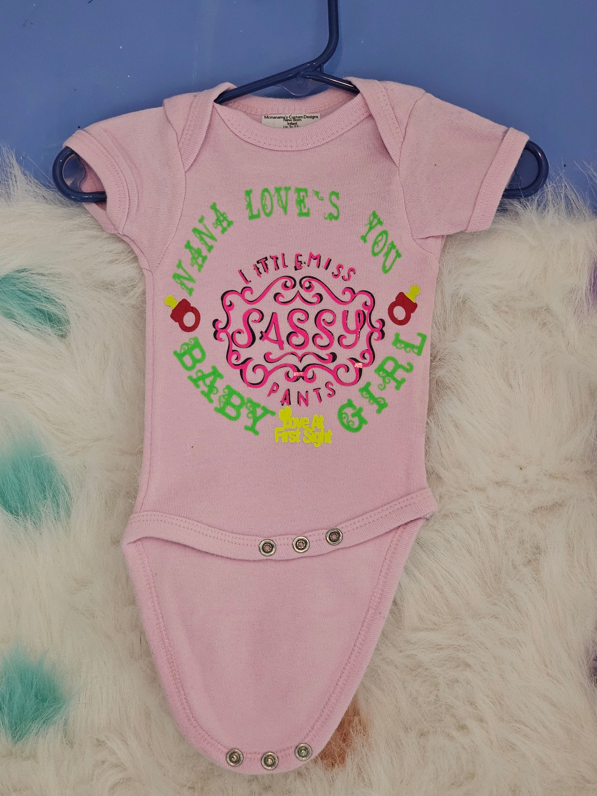 - Expertly crafted from 100% cotton, this Nana's loves you baby girl Onesie in size 0-3 months is the perfect blend of comfort and style. Keep your little one looking adorable and feeling cozy while showing off their sassy personality. A must-have for any fashionable baby.Size 0 to 3 months 100% cotton Grandma's Little Sassy pants cotton Oneies.I can do different sizes and colors. Washing instructions turn Shirt inside out and wash in cold or warm water and dry on low heat or air dry.DO NOT wash in Hot water.Your information is protected.