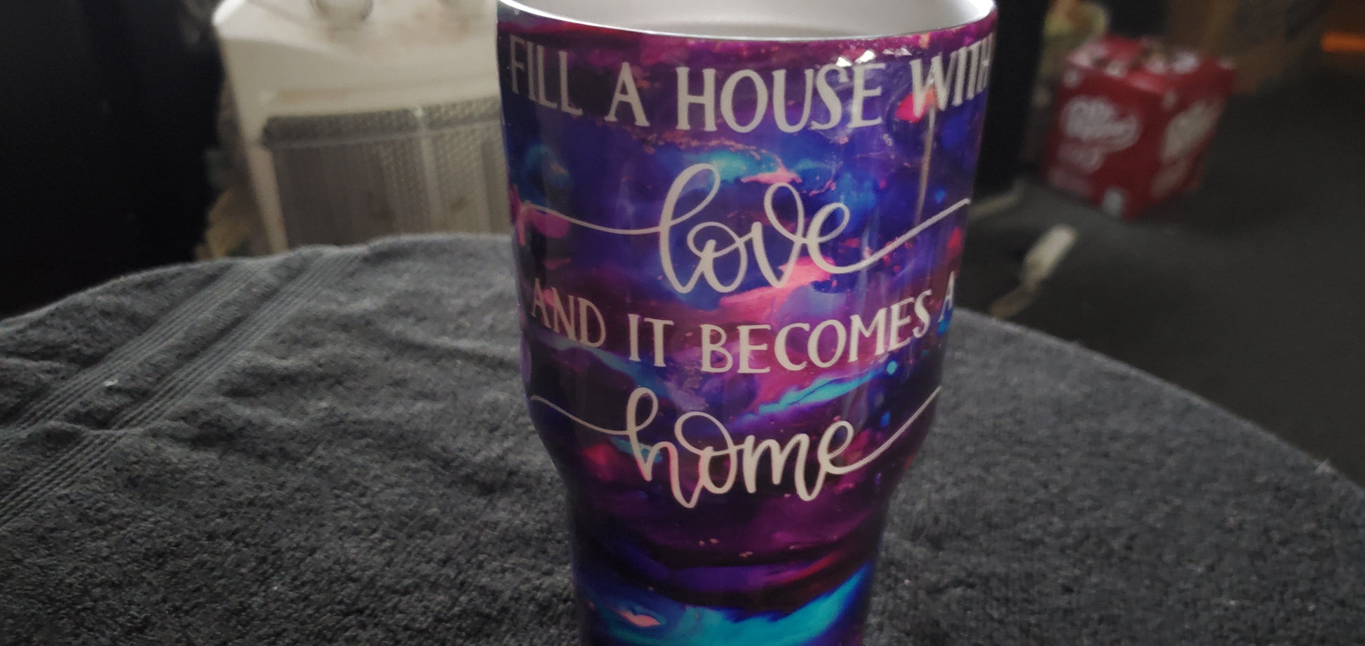 30 0z House makes a home Double Walled insulated Stainless steel tumbler cup. Keeps drinks cold for 24 hours and hot for 6 hours. Do not put them in the dishwasher. Hand wash only.I can do personalized designs, different sizes and colors.