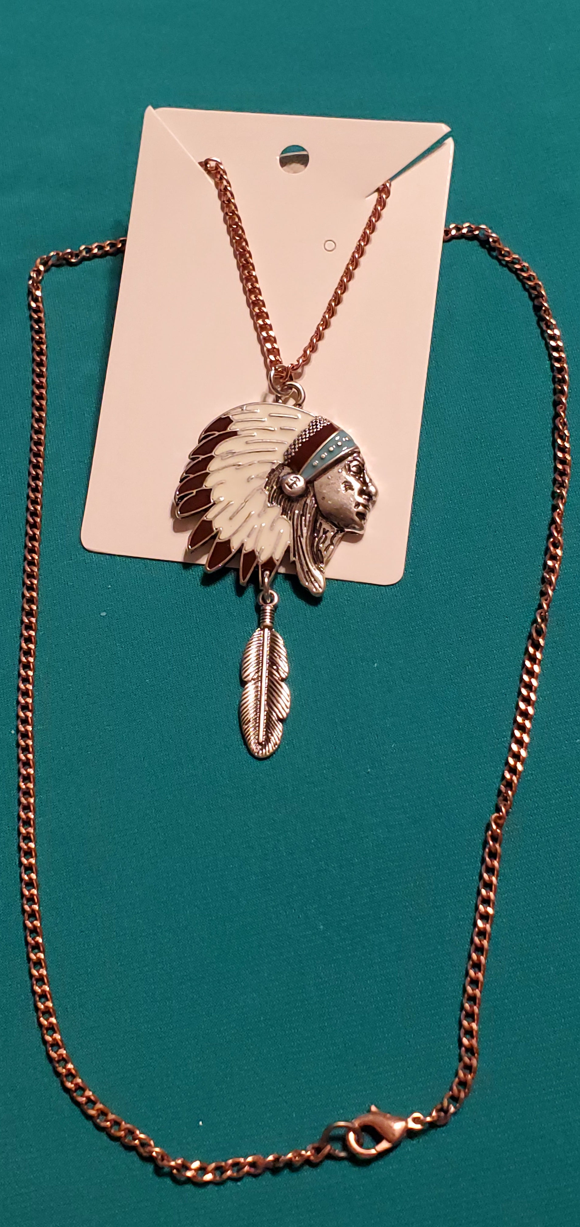 Indian head on bronze plated necklace and Indian beads on bronze plated post