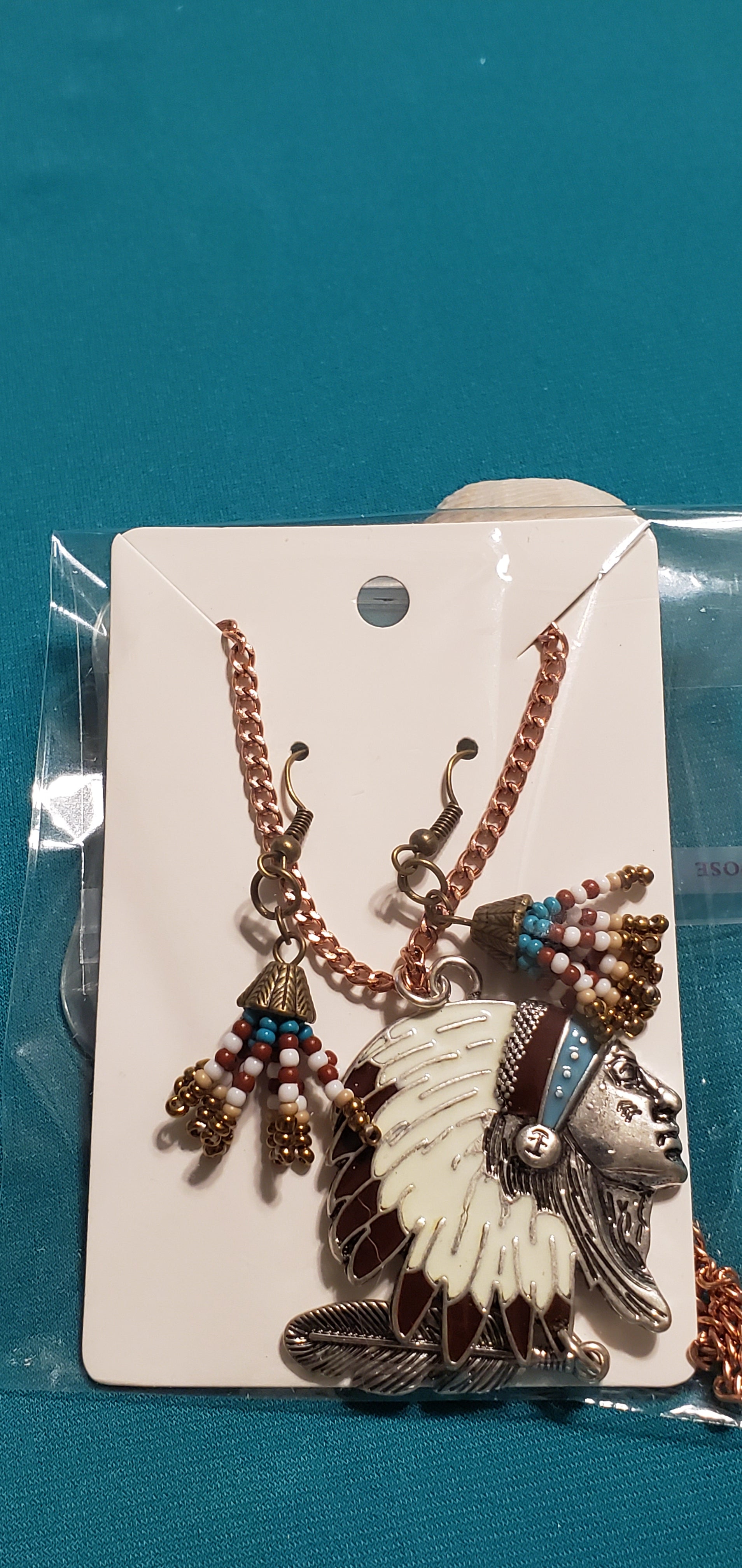 Indian head on bronze plated necklace and Indian beads on bronze plated post.You can get the set for $10.00 or the necklace for $5.00 or you can get the earrings for $5.00.