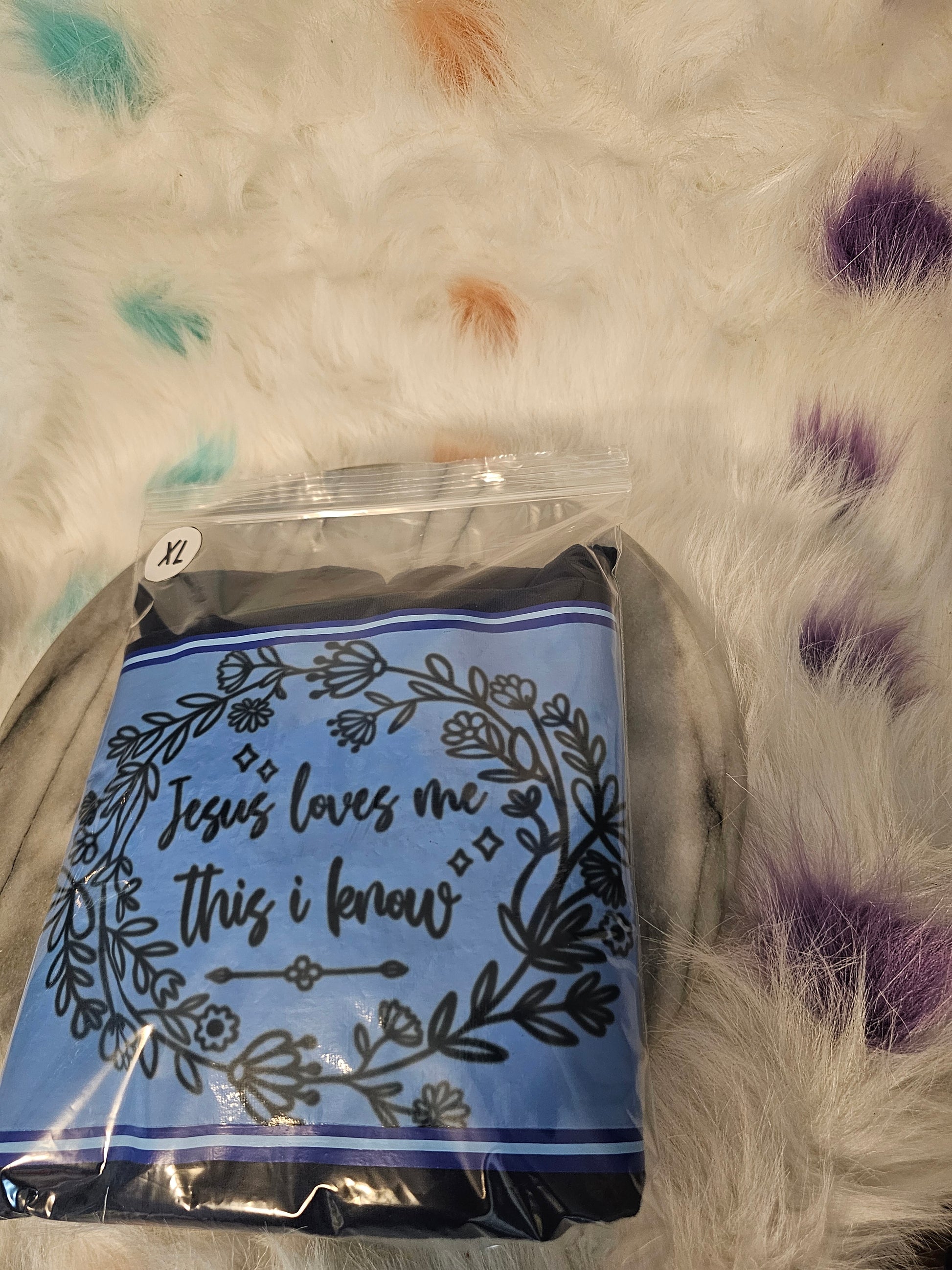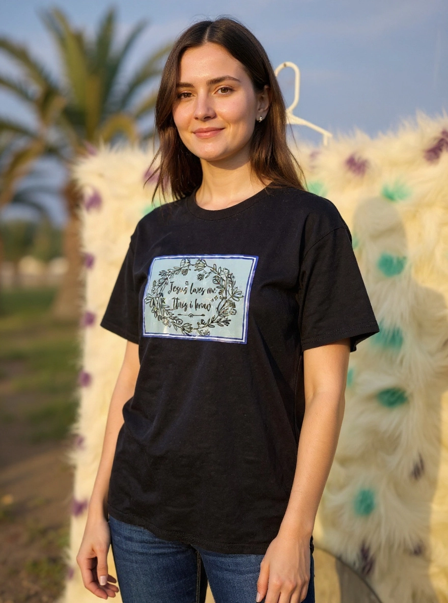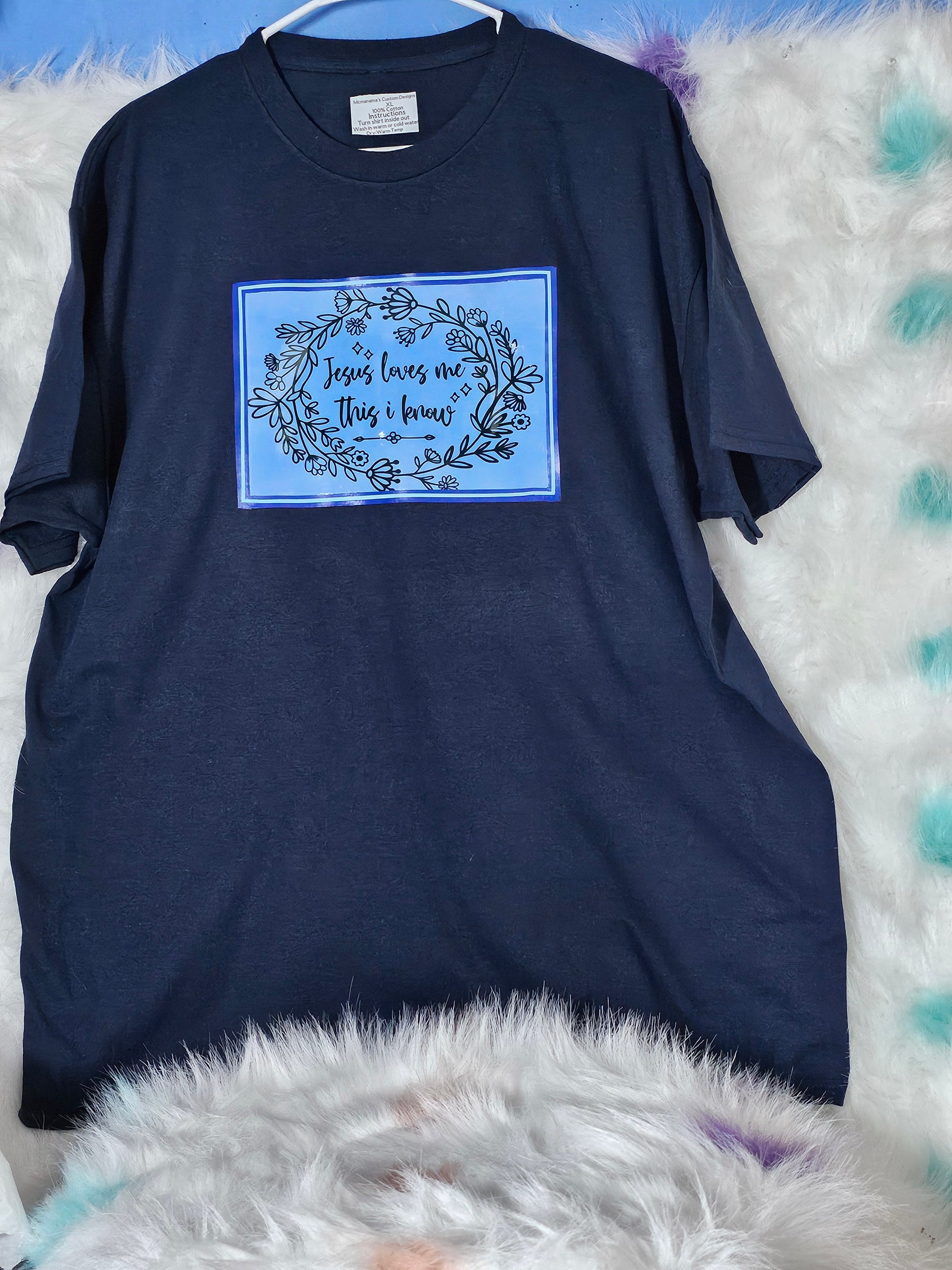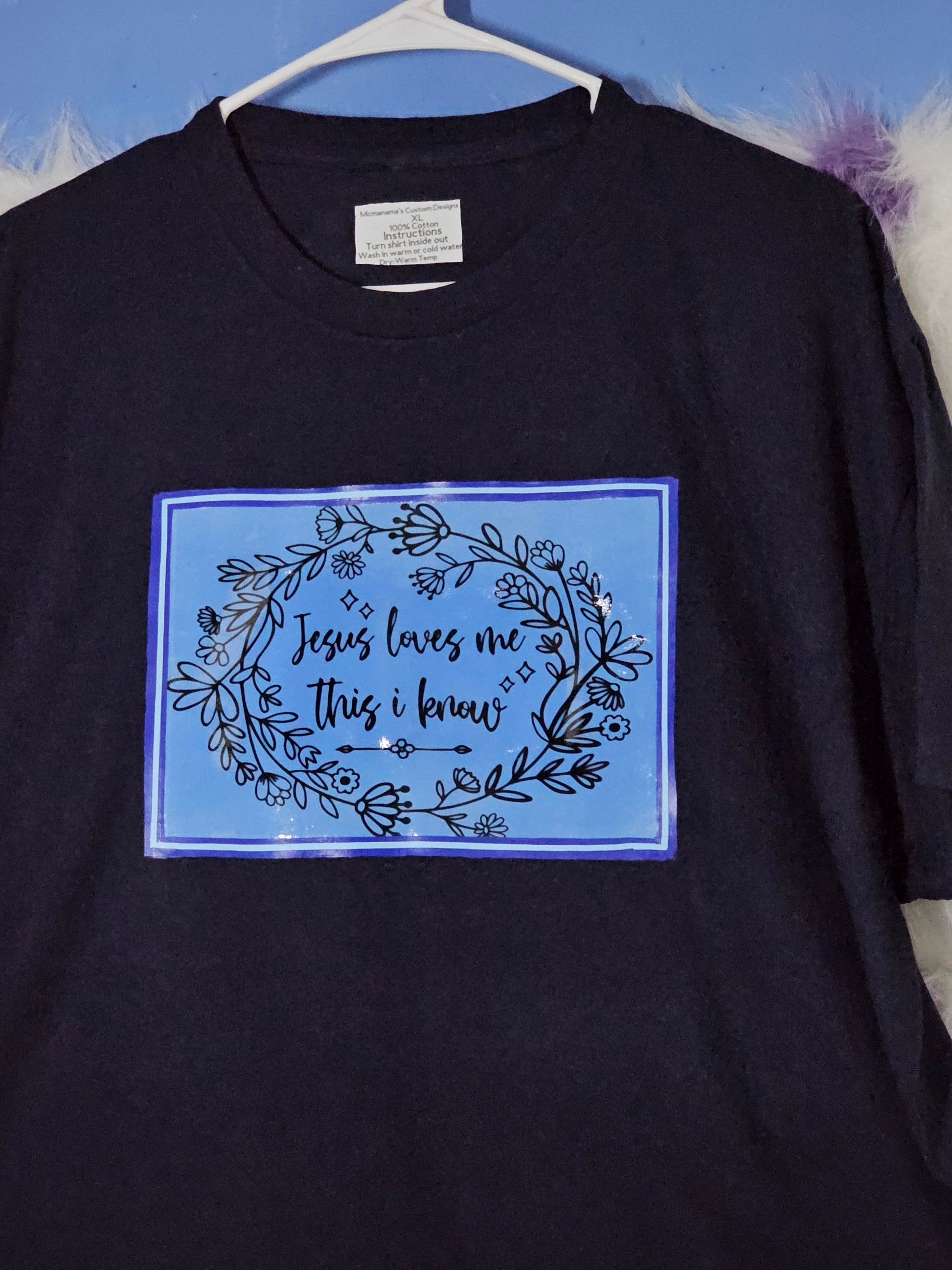 Size XL.Jesus loves me black T-Shirt. I have shirts in different sizes and colors. Washing instructions:Turn Shirt inside out and wash in cold or warm water. Dry on low heat or air dry.DO NOT wash in Hot water.Your information is protected. "This black T-Shirt features the comforting words 'Jesus loves me' in bold white lettering. Made from high-quality cotton, this shirt is soft, durable, and stylish. Perfect for showcasing your faith and spreading a message of love and hope. Available in a variety of sizes. "