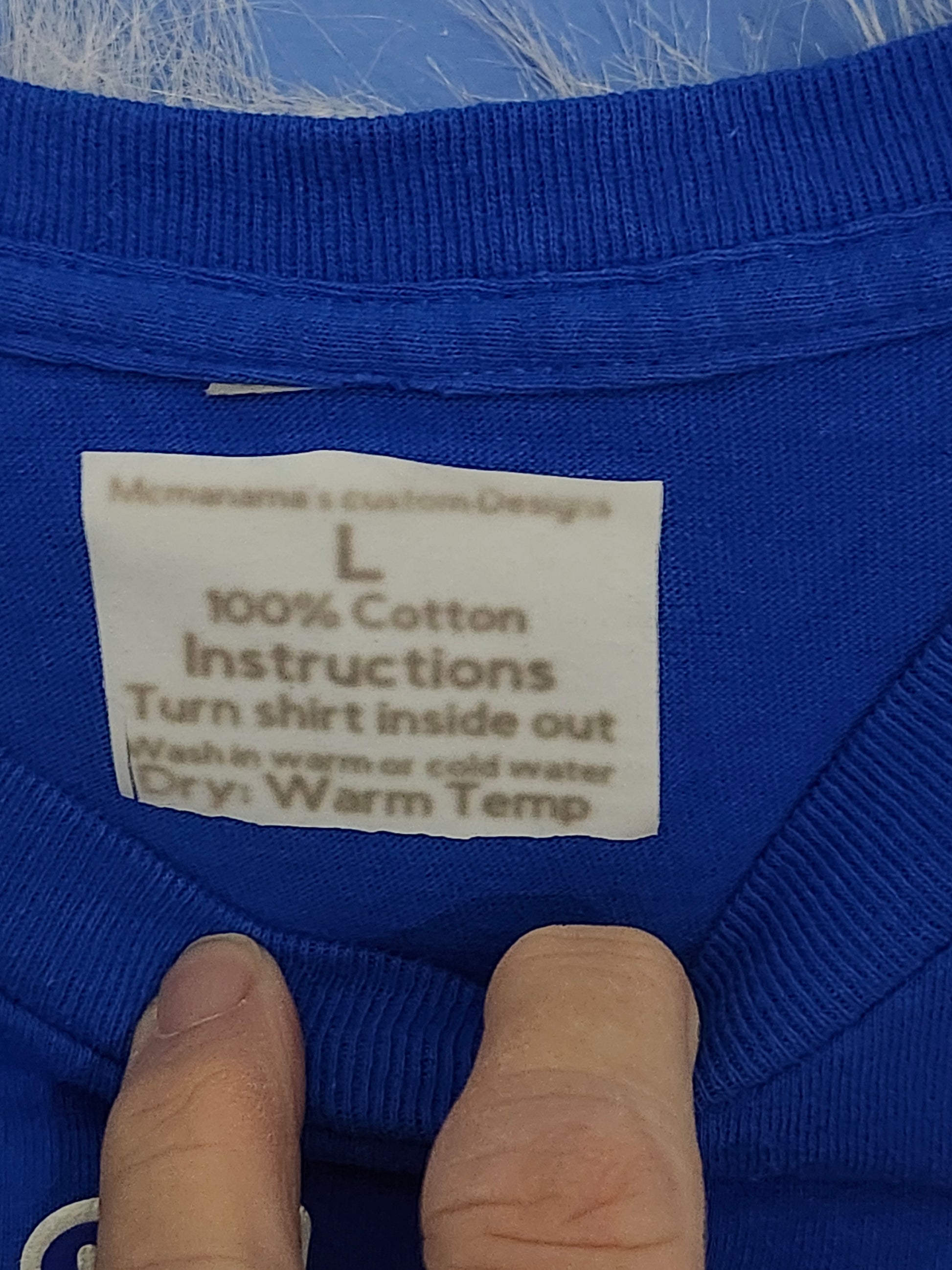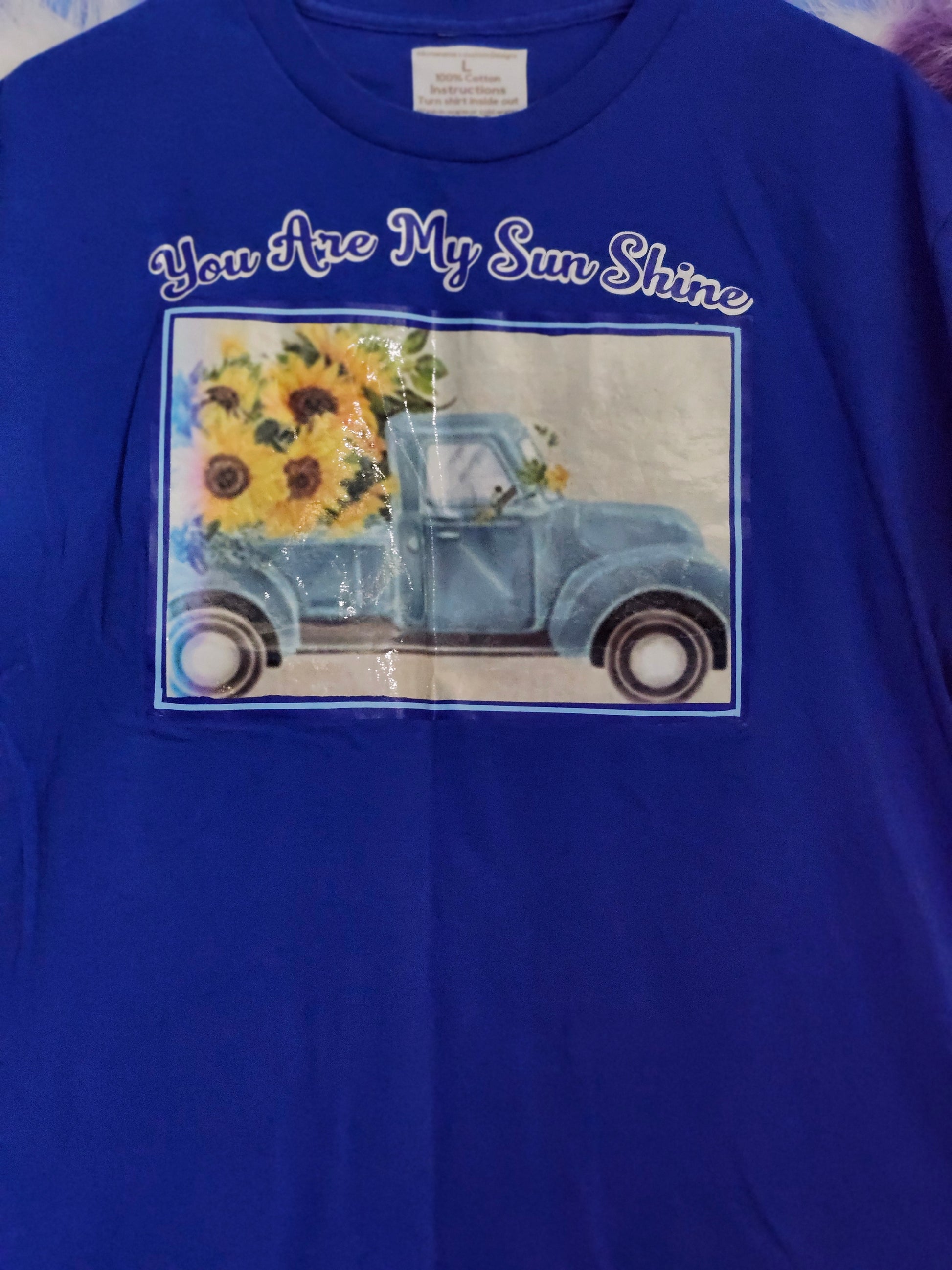 L 100%cotton blue You are my sunshine tshirt.Wash in cold water turn Shirt inside out. Dry on low heat or air dry.DO NOT wash in Hot water.Your information is protected. I make different colors, sizes and designs. Text me at 678-209-6711 and let me know what color, size or design you would like. This L 100% cotton blue You are my sunshine tshirt is made with soft and breathable material, providing comfort and style. The vibrant blue color and message of "You are my sunshine" make it a perfect choice for casual wear or as a thoughtful gift.
