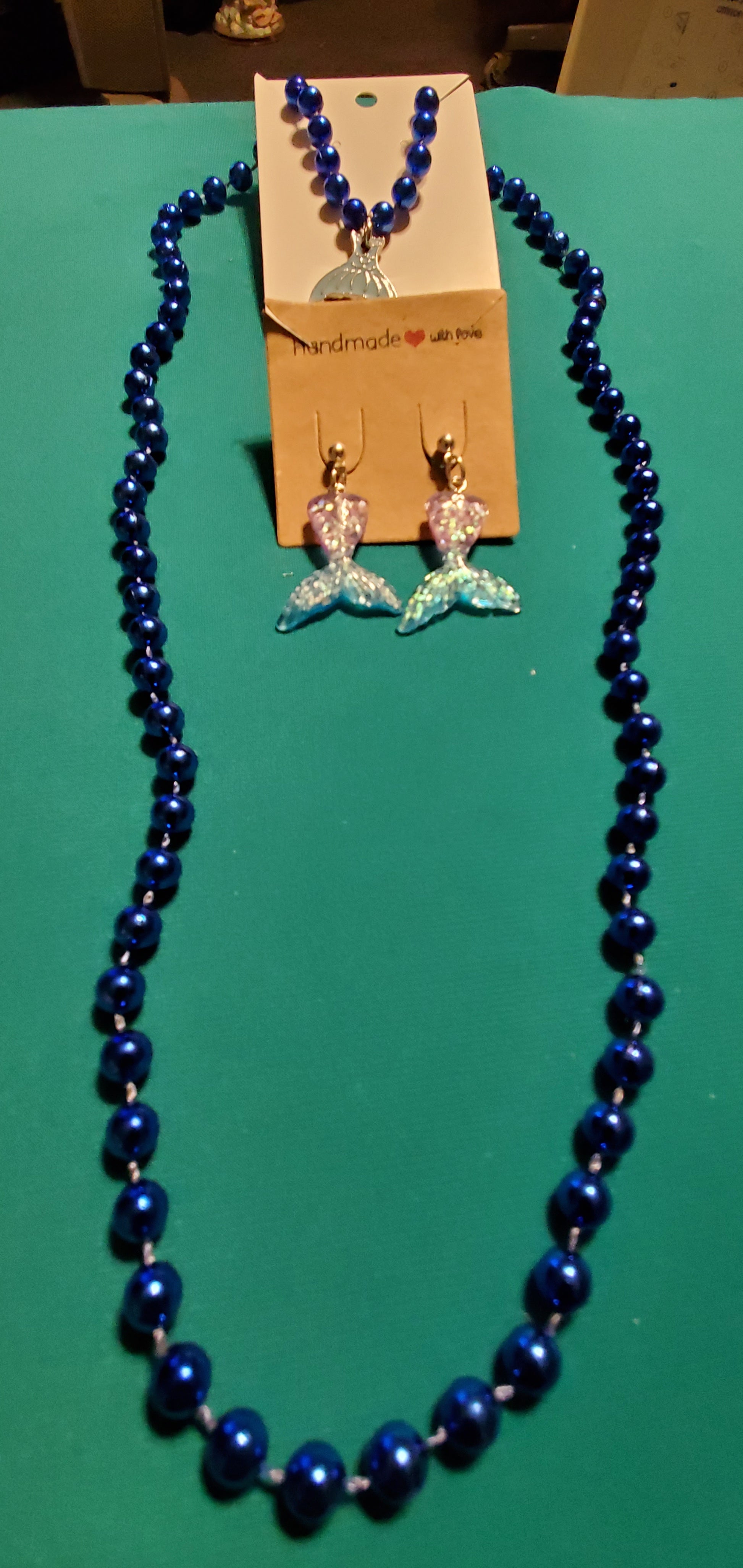 Mermaid tail on blue beaded necklace. You can get the necklace for $5.00 or the earrings for $5.00 or the set for $10.00.