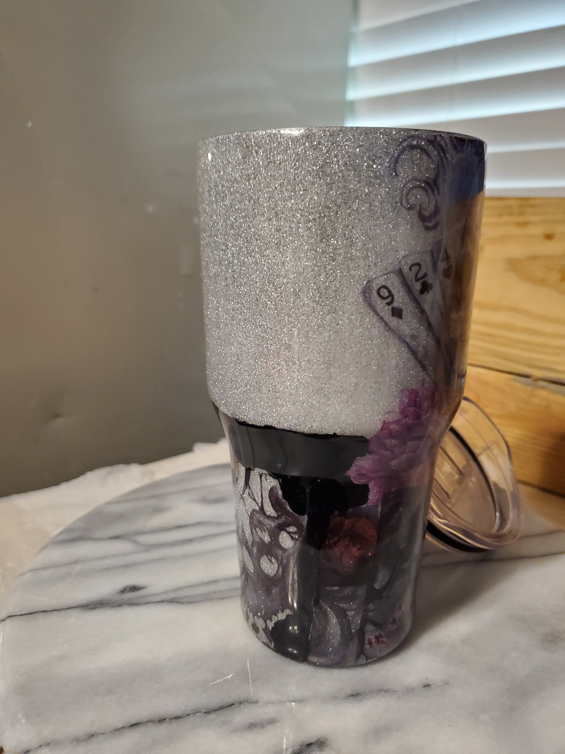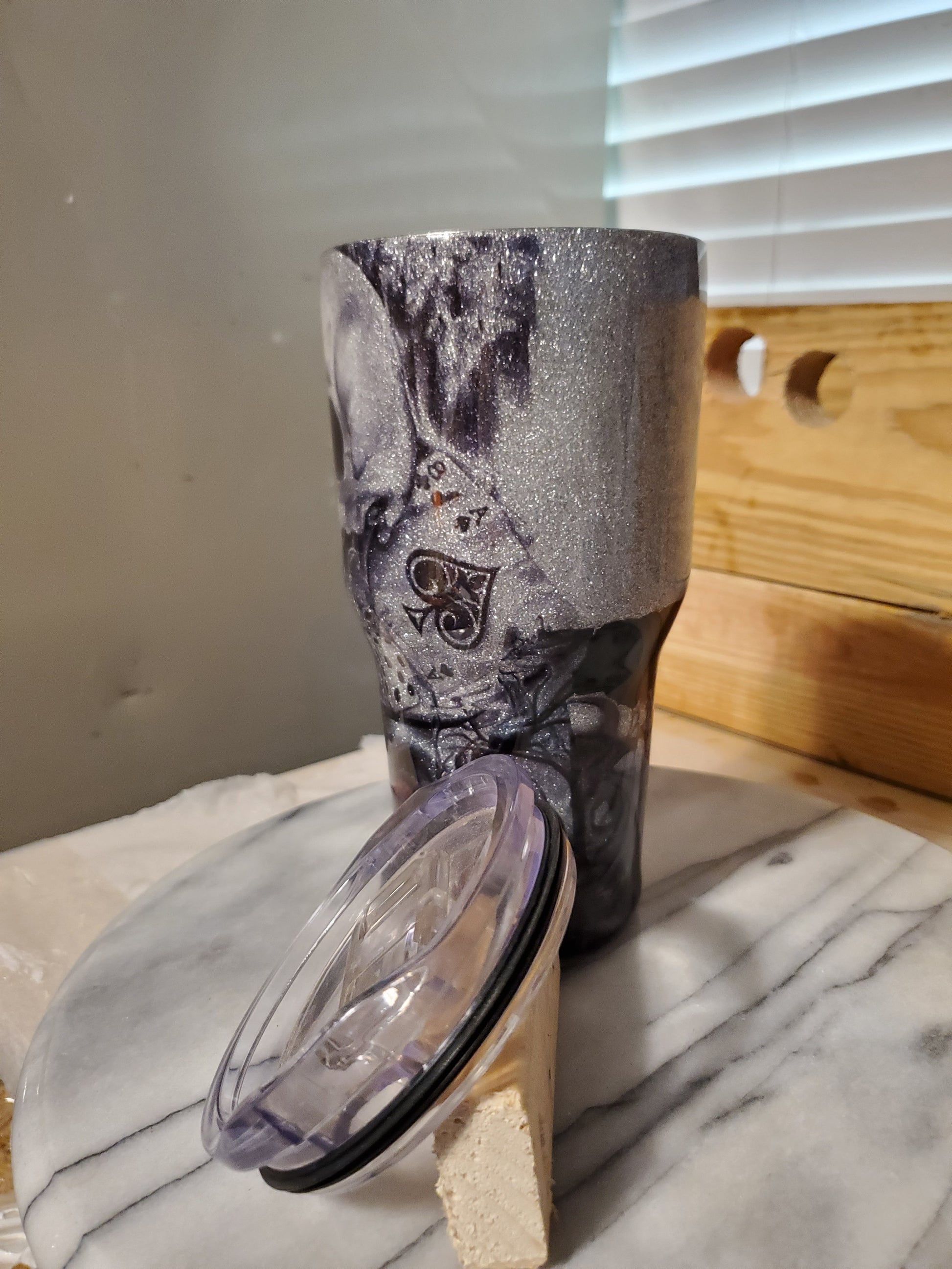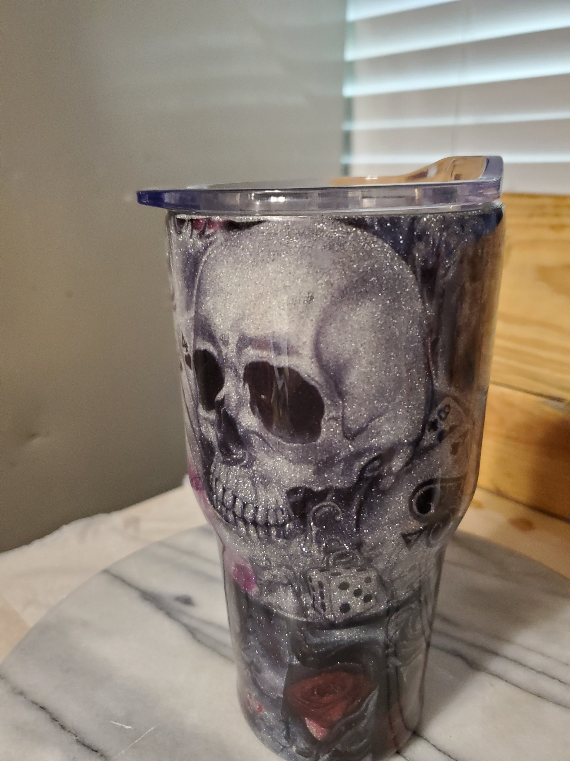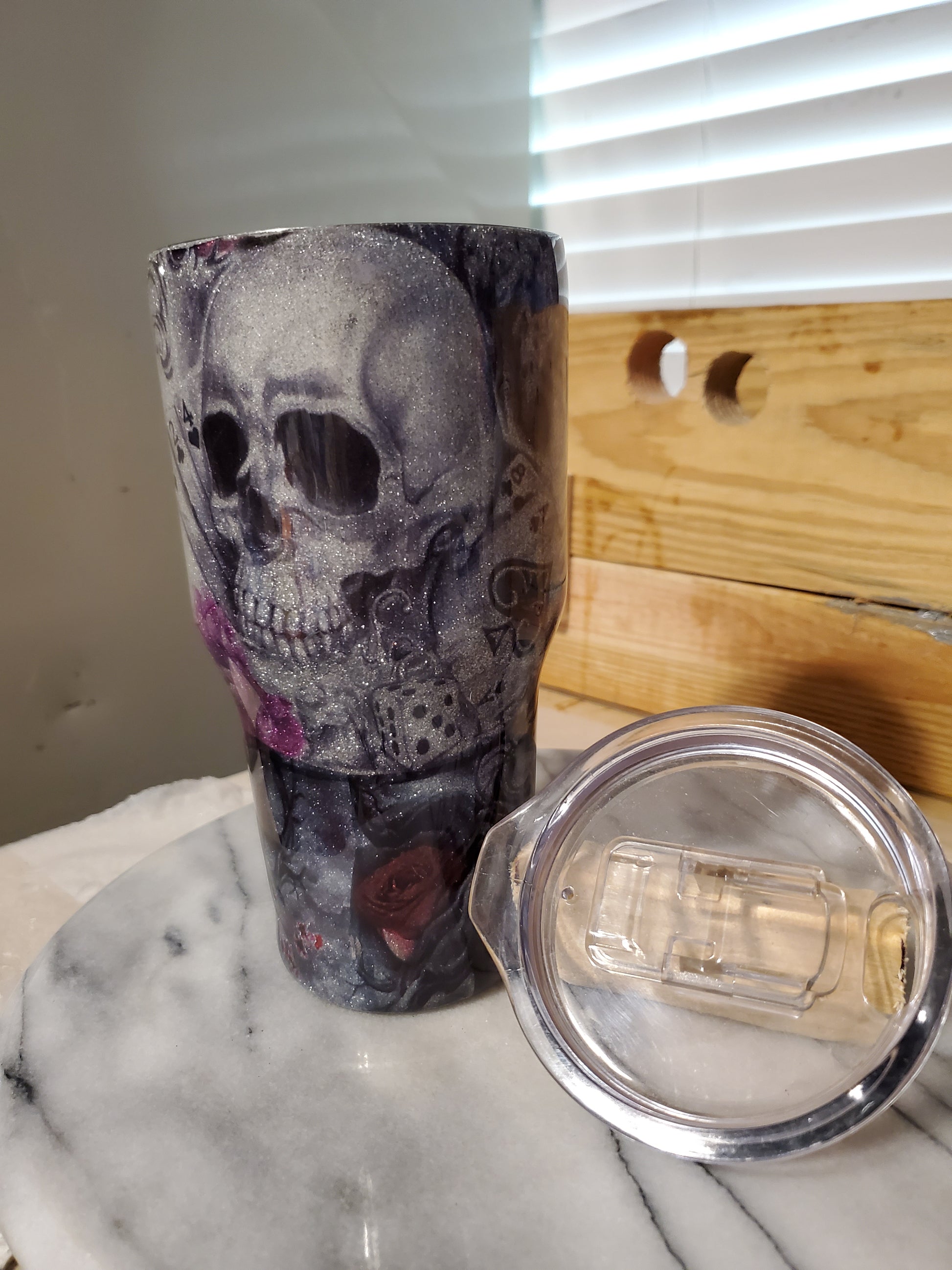 My 30 oz Skelton Double walled insulated Stainless steel built tumbler cup.Keeps drinks cold for 24 hours and hot for 6 hours.Don't put it in the dishwasher. Hand wash only.I can do personalized designs.I can put your name on.