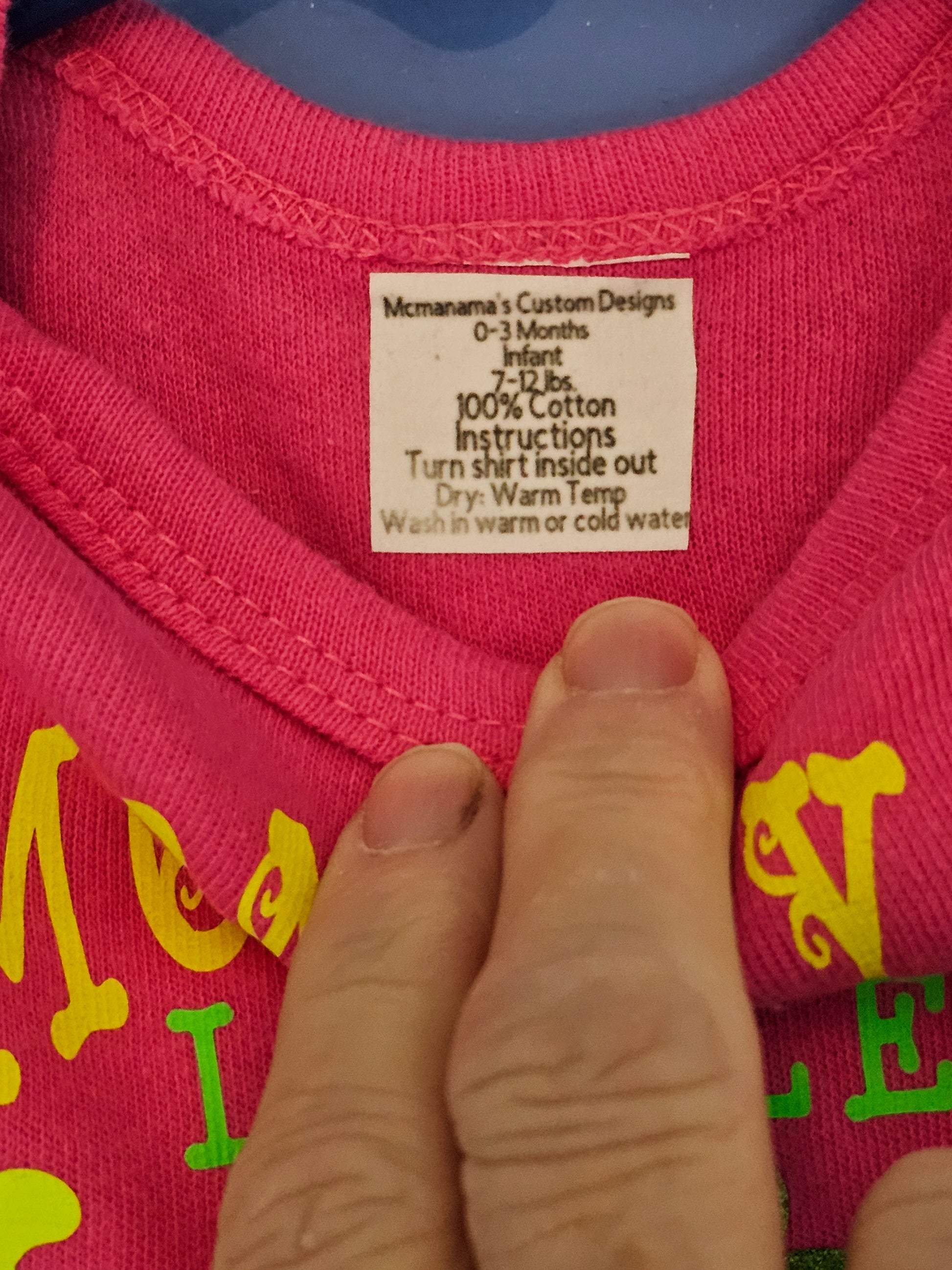 Introducing our Size 0-3 months 100% cotton Pink little Angels onesie - the perfect choice for your little one. Made of 100% soft and breathable cotton, this onesie will keep your baby comfortable and stylish. With its adorable "Little Angels" design, your baby will look and feel like an angel. Let your little one enjoy blissful comfort with this onesie.Size 0 to 3 months My Little Angels cotton Oneies.I can make different sizes and colors. Washing instructions :Turn Shirt inside out and wash in cold or warm water and dry on low heat or air dry.DO NOT wash in Hot water.Your information is protected.