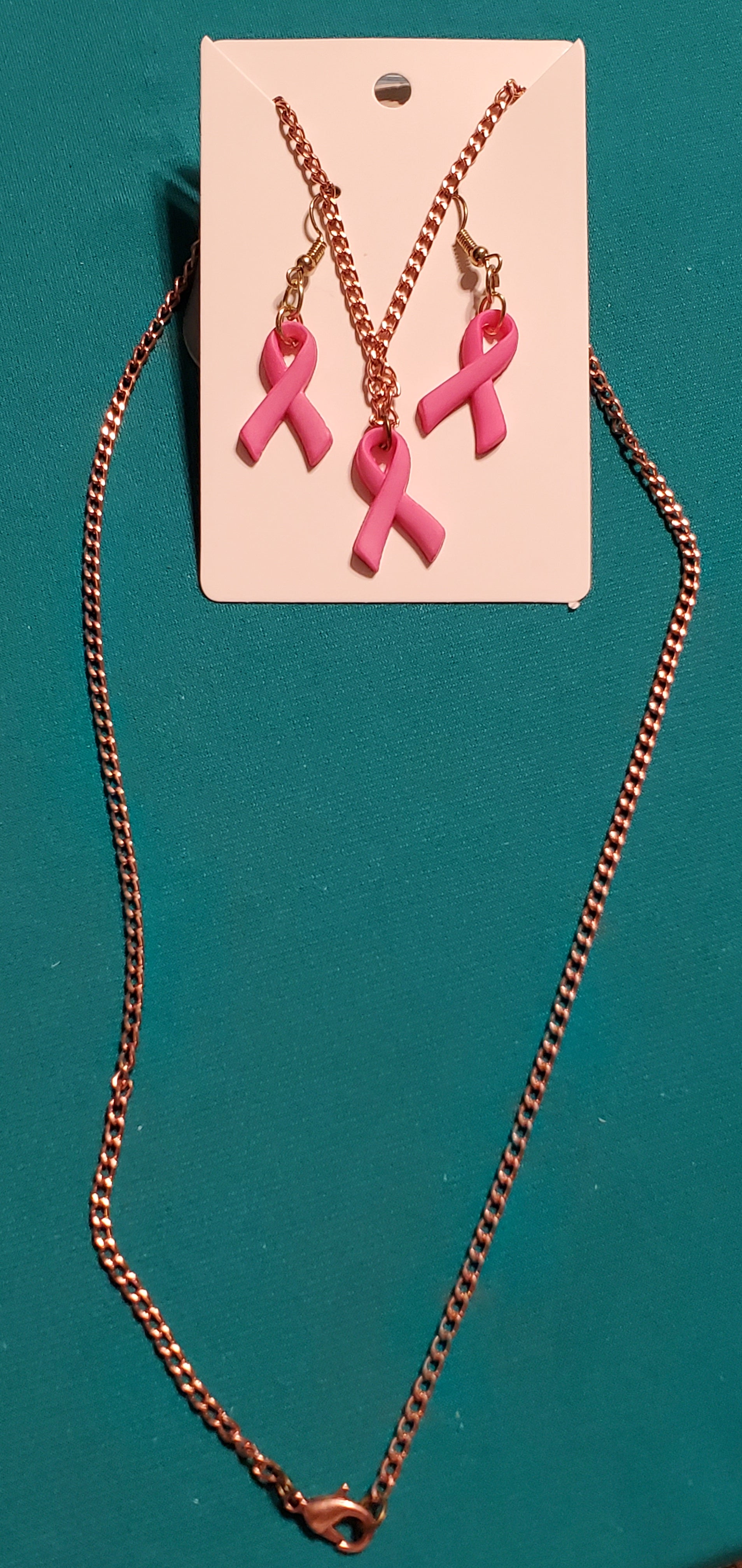 Pink cancer free gold plated necklace and earrings. You can get the set for $10.00 or the necklace for $5.00 and earrings for $5.00.