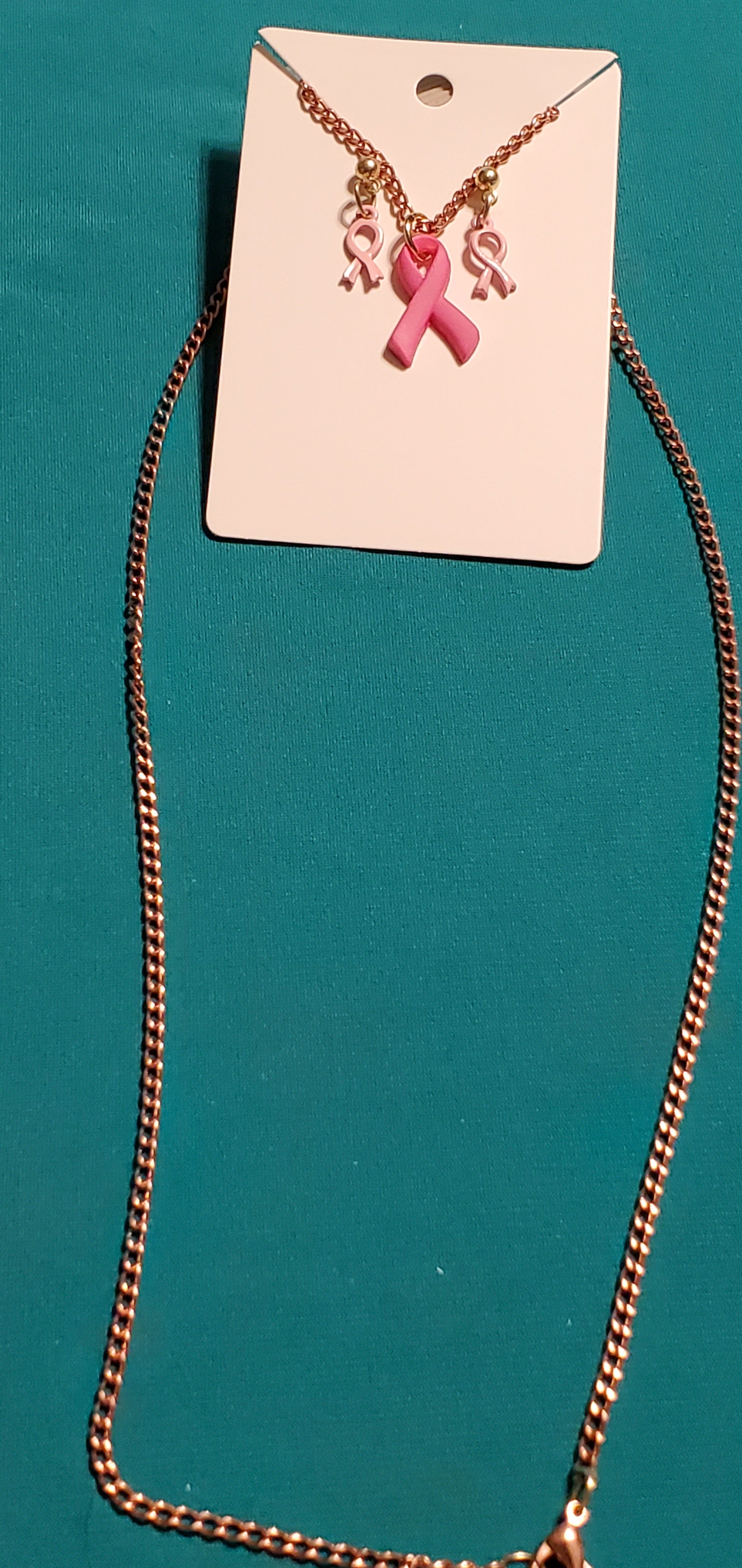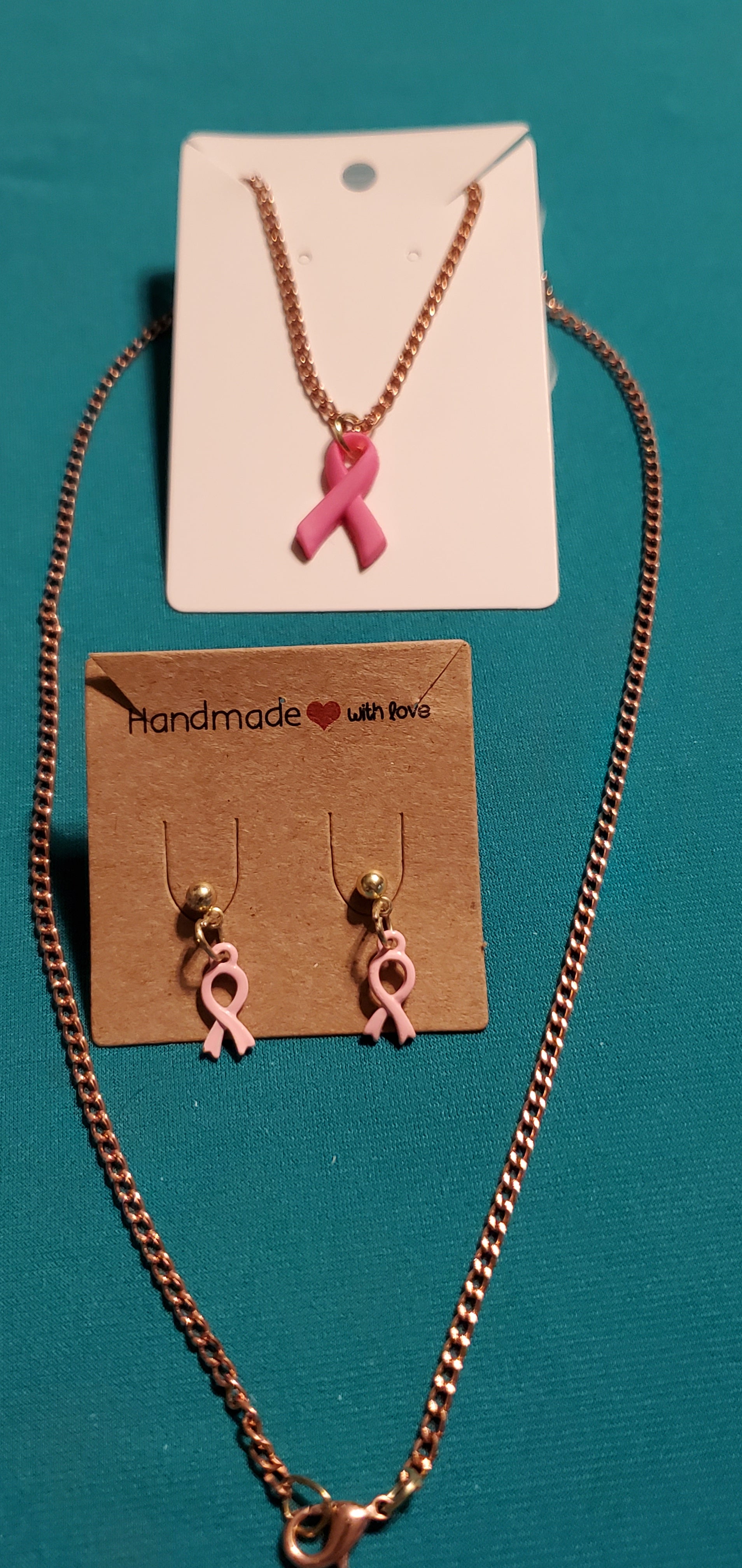 Pink cancer free gold plated necklace and earrings. You can get the set for $10.00 or the necklace for $5.00 or earrings for $5.00.