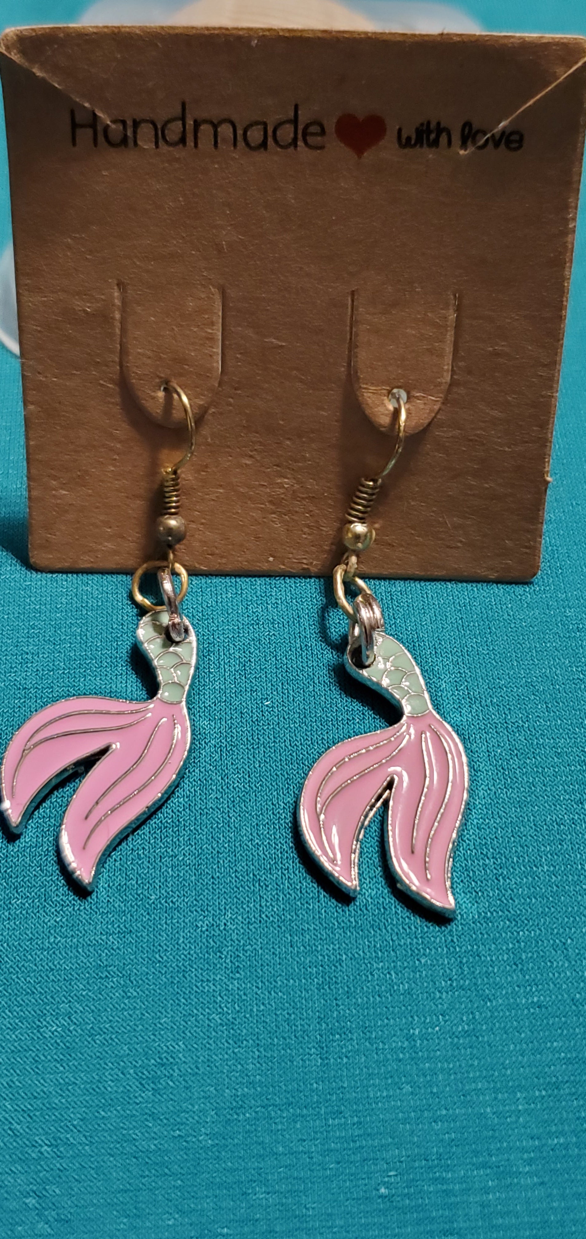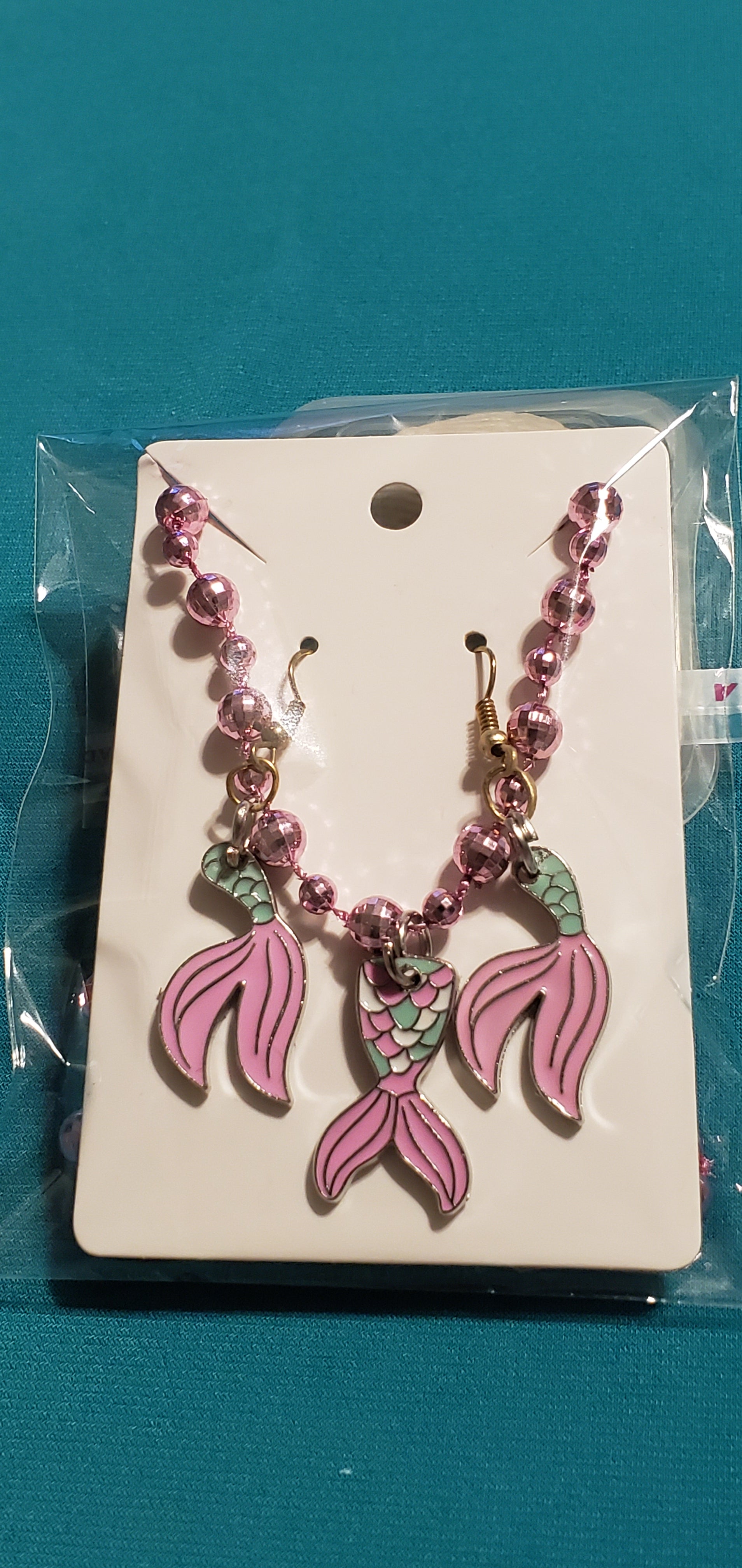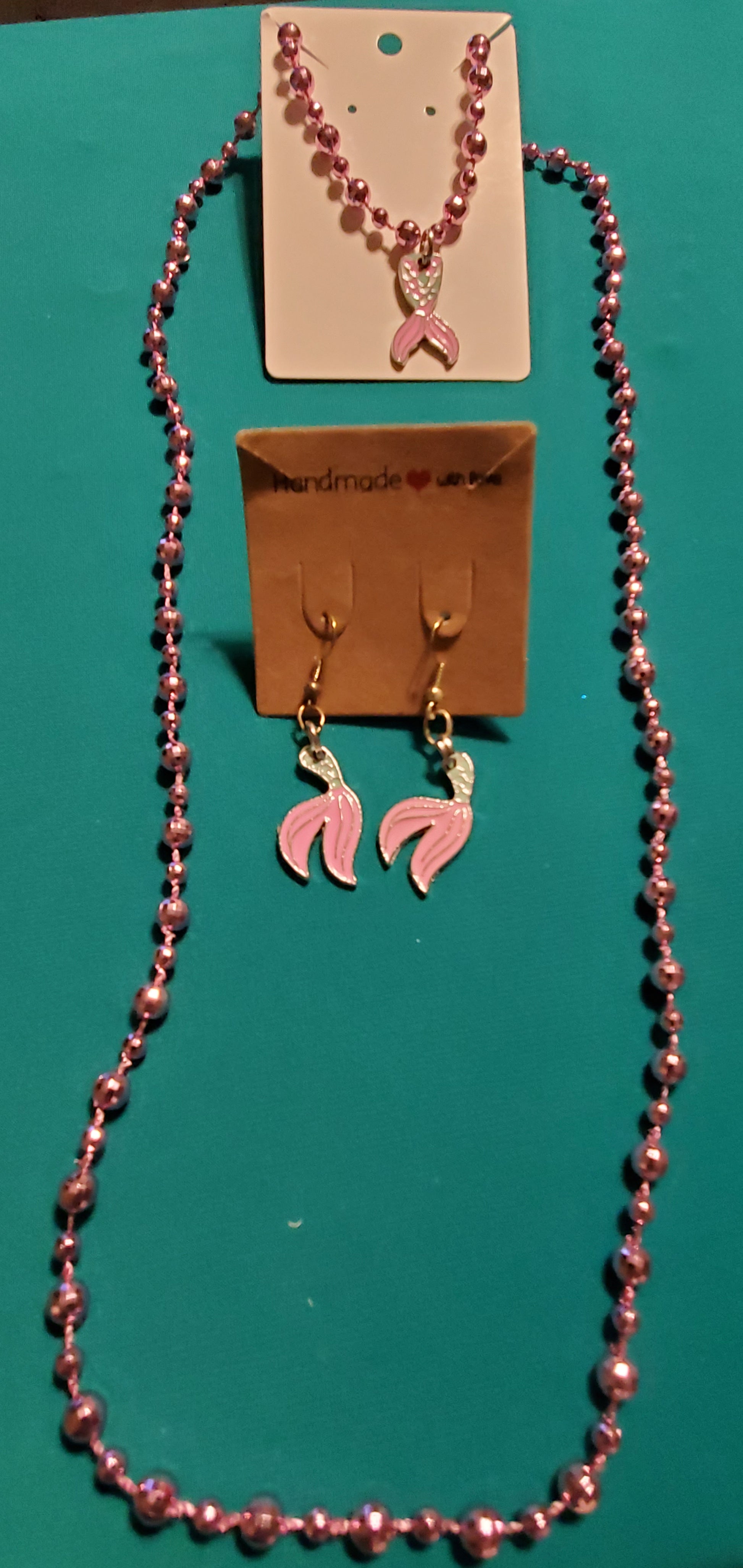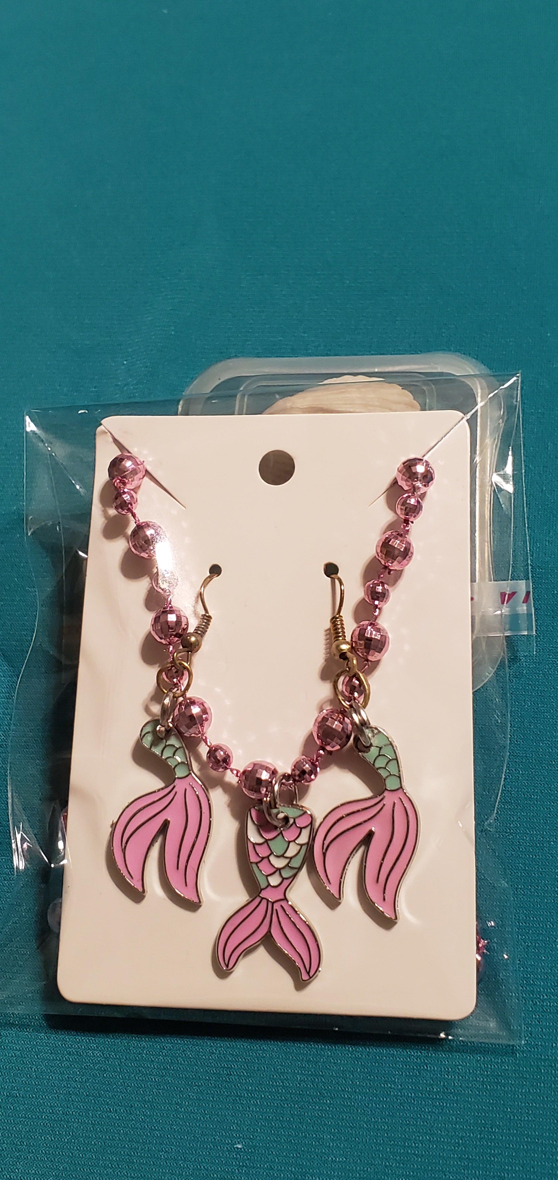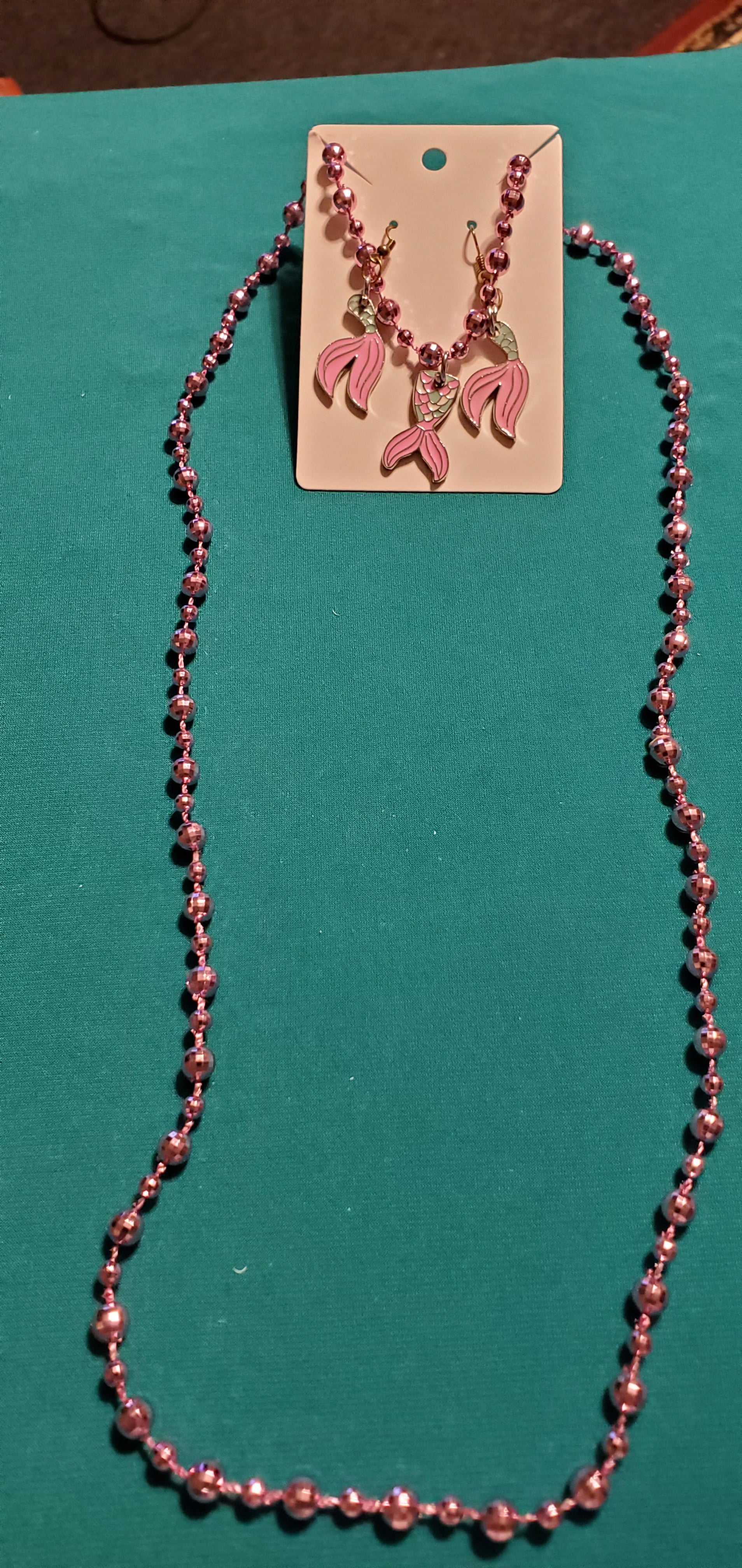 Pink mermaid tail on beaded necklace and earrings. You can get the set for $10.00 or the necklace for $5.00 and the earrings for $5.00.