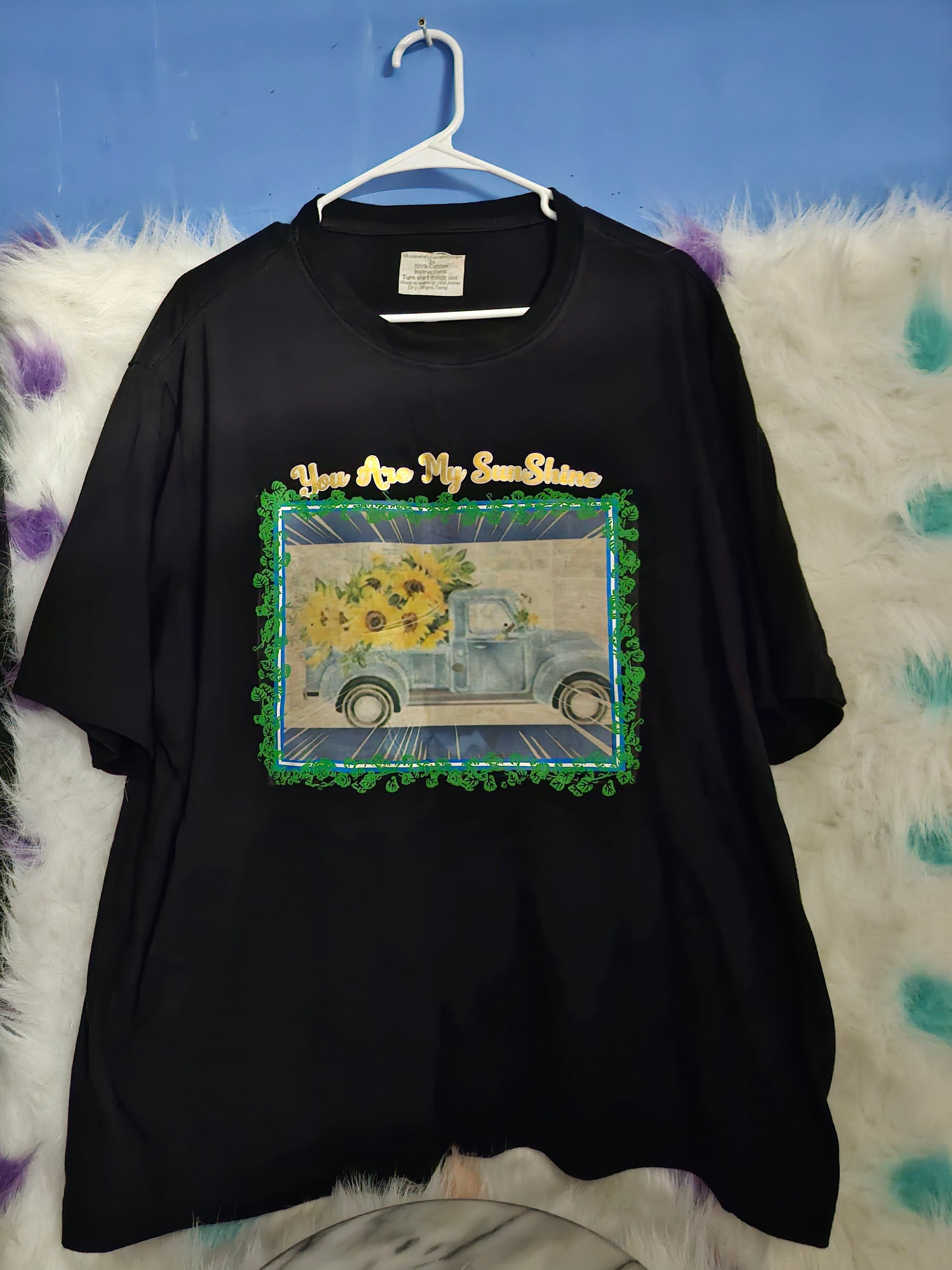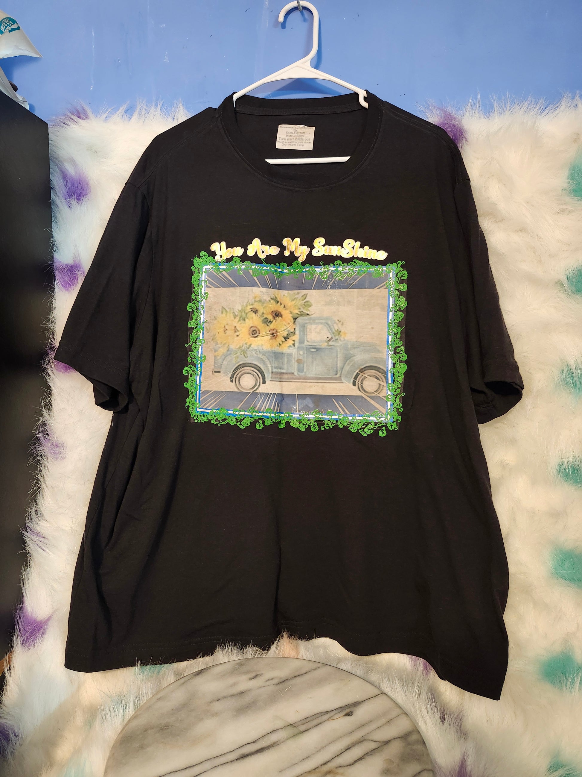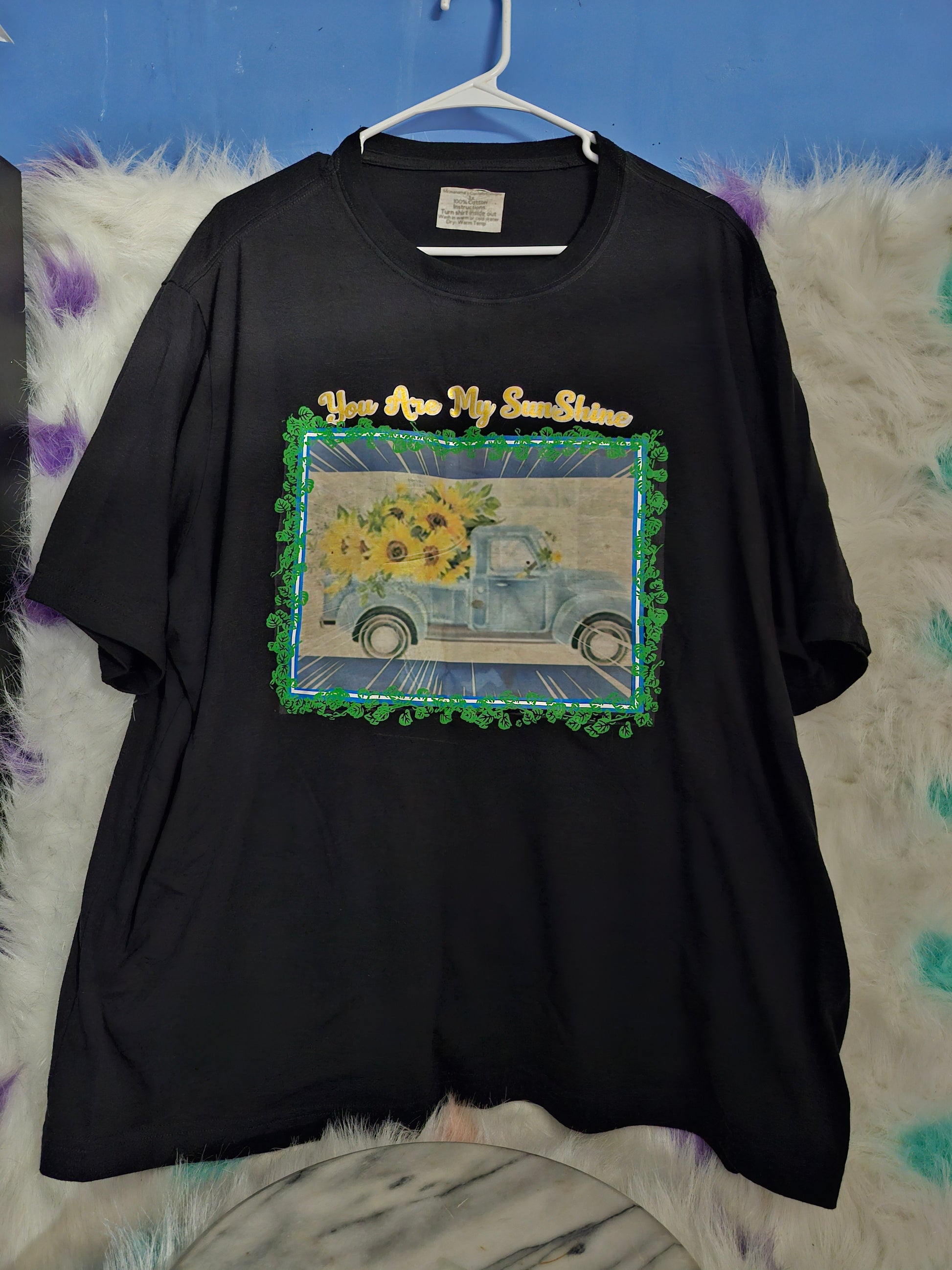 Size 3 100% cotton black you are my sunshine tshirt.Washing instructions.Turn Shirt inside out and Wash in cold water or warm water and Dry on low heat or air dry.DO NOT wash in Hot water.Your information is protected. I make different colors, sizes and designs. Text me at 678-209-6711 and let me know what color, size and designs you would like.