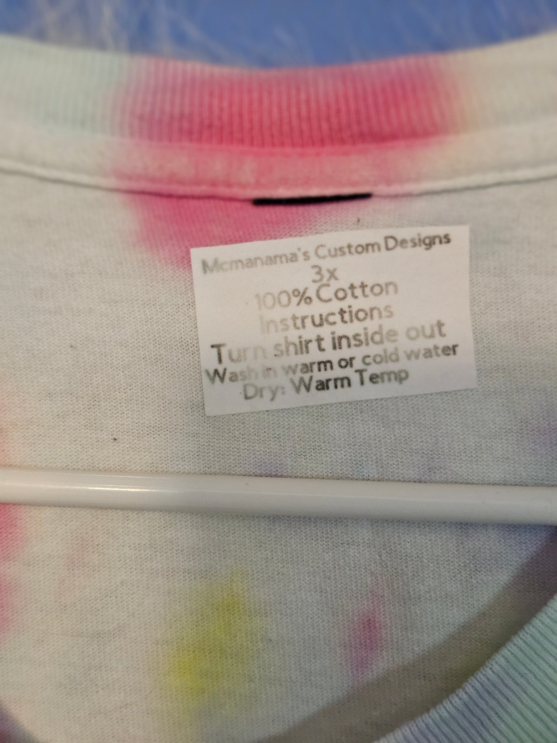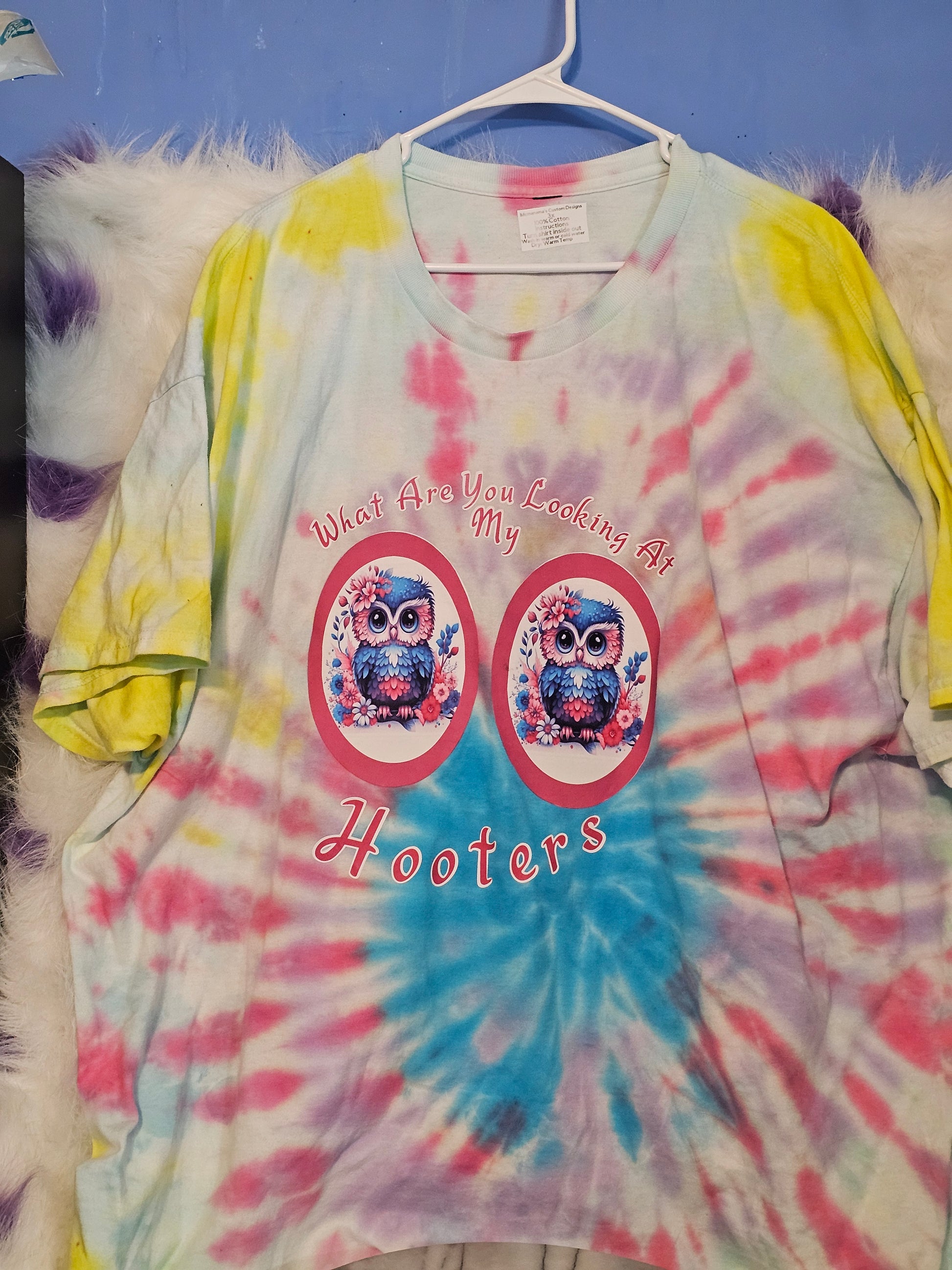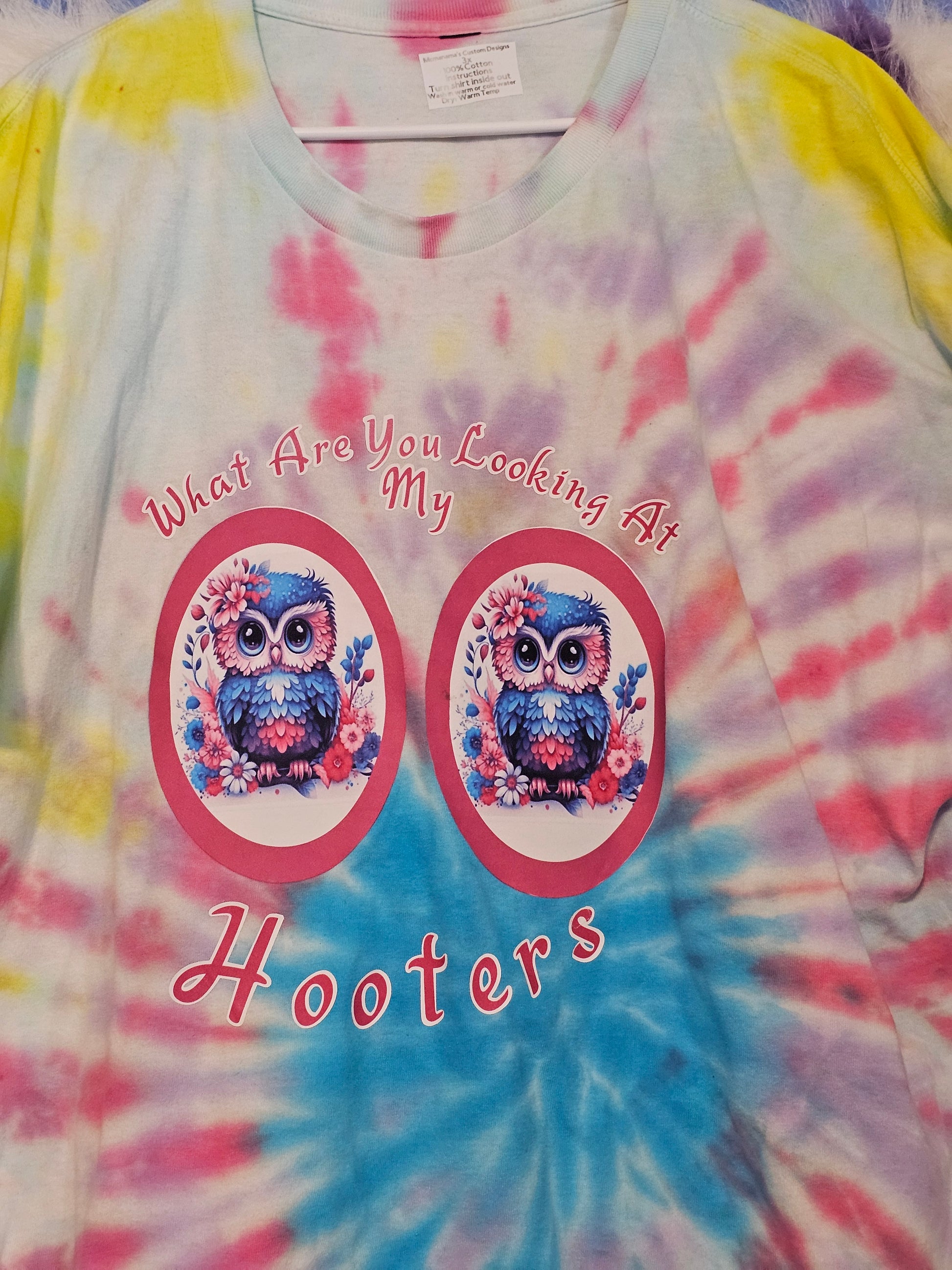 Size 3x 100% cotton What are you looking at my hooters.wash in cold or hot water.Washing instructions:Turn shirt inside out.Dry on low heat or air dry.DO NOT wash in Hot water.Your information is protected. I can do just about any design you would like but I can't promise same tie die  or bleach die.This Size 3x shirt is made of 100% cotton, ensuring comfort and durability. With its unique bleach tie dye design, it's sure to turn heads and make a statement. Show off your love for Hooters in style.