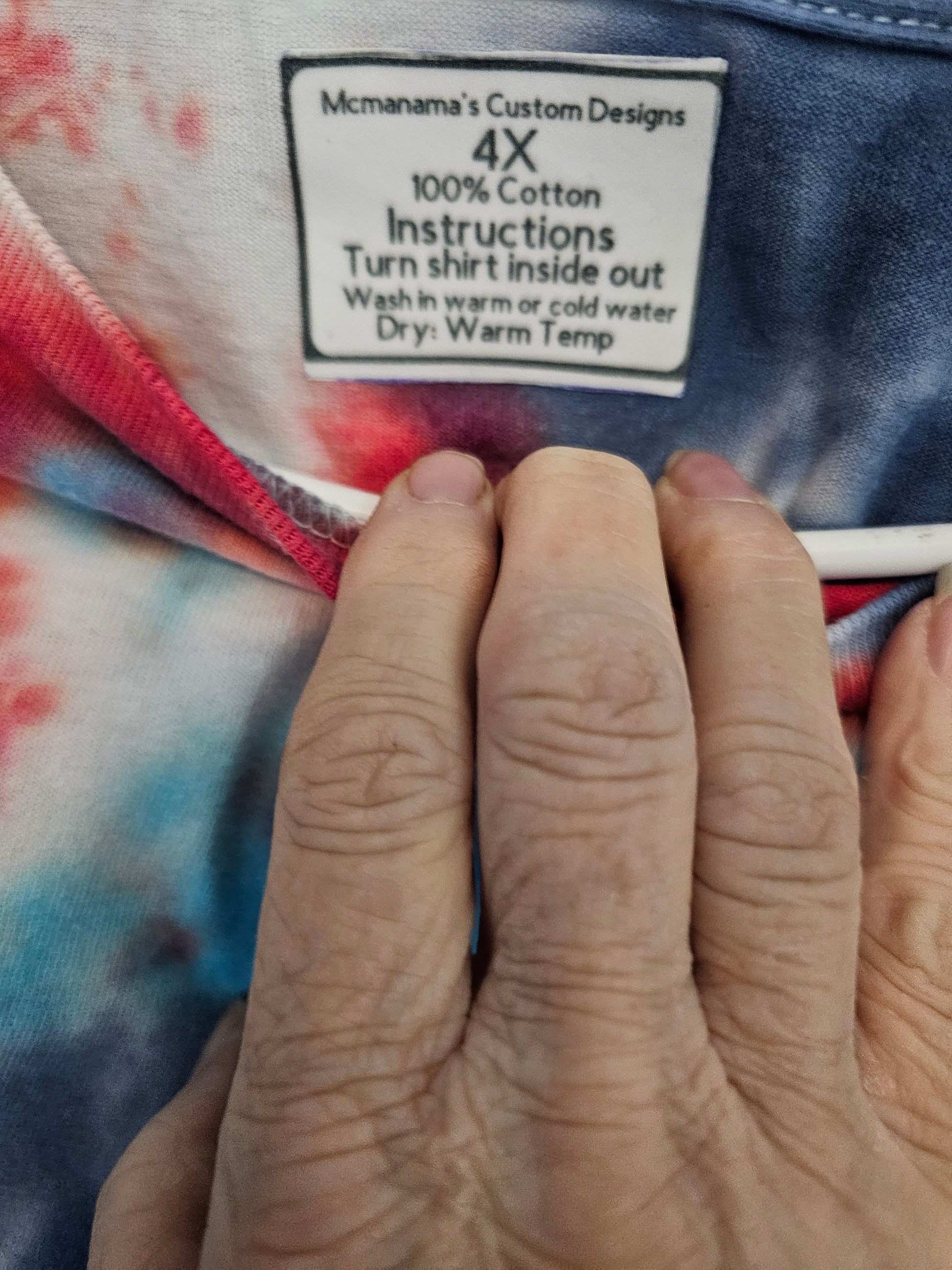 Size 4x 100% cotton red,white and blue tie dye Tshirt. Washing instructions turn Shirt inside out and wash in cold water and dry on low heat or air dry.DO NOT wash in Hot water.Your information is protected. Experience comfort and style in our size 4x 100% cotton red, white, and blue tie dye t-shirt. Made with high-quality material, this shirt is perfect for any occasion. Stay fashionable and comfortable at the same time.