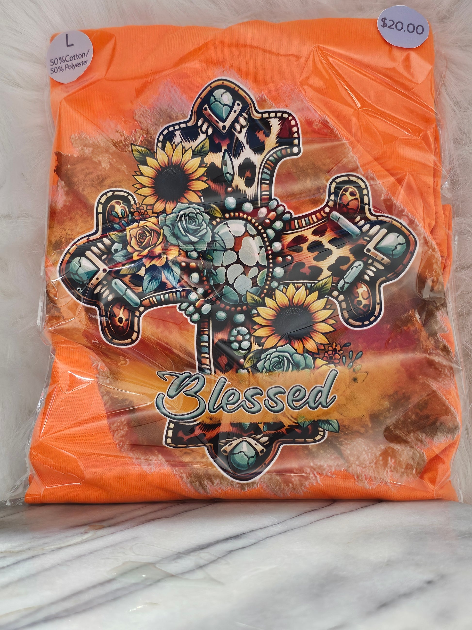 Upgrade your wardrobe with the Size L 100% cotton Orange Blessed cross with sunflowers Tshirt. Made from high-quality cotton, this shirt offers superior comfort and durability. The intricate design of a blessed cross with sunflowers adds a touch of beauty and spirituality to your outfit. Perfect for any occasion.Size L 100% cotton Orange Blessed cross with sunflowers Tshirt. Washing instructions turn Shirt inside out and wash in cold or warm water and dry on low heat or air dry.DO NOT wash in Hot water.Your information is protected.