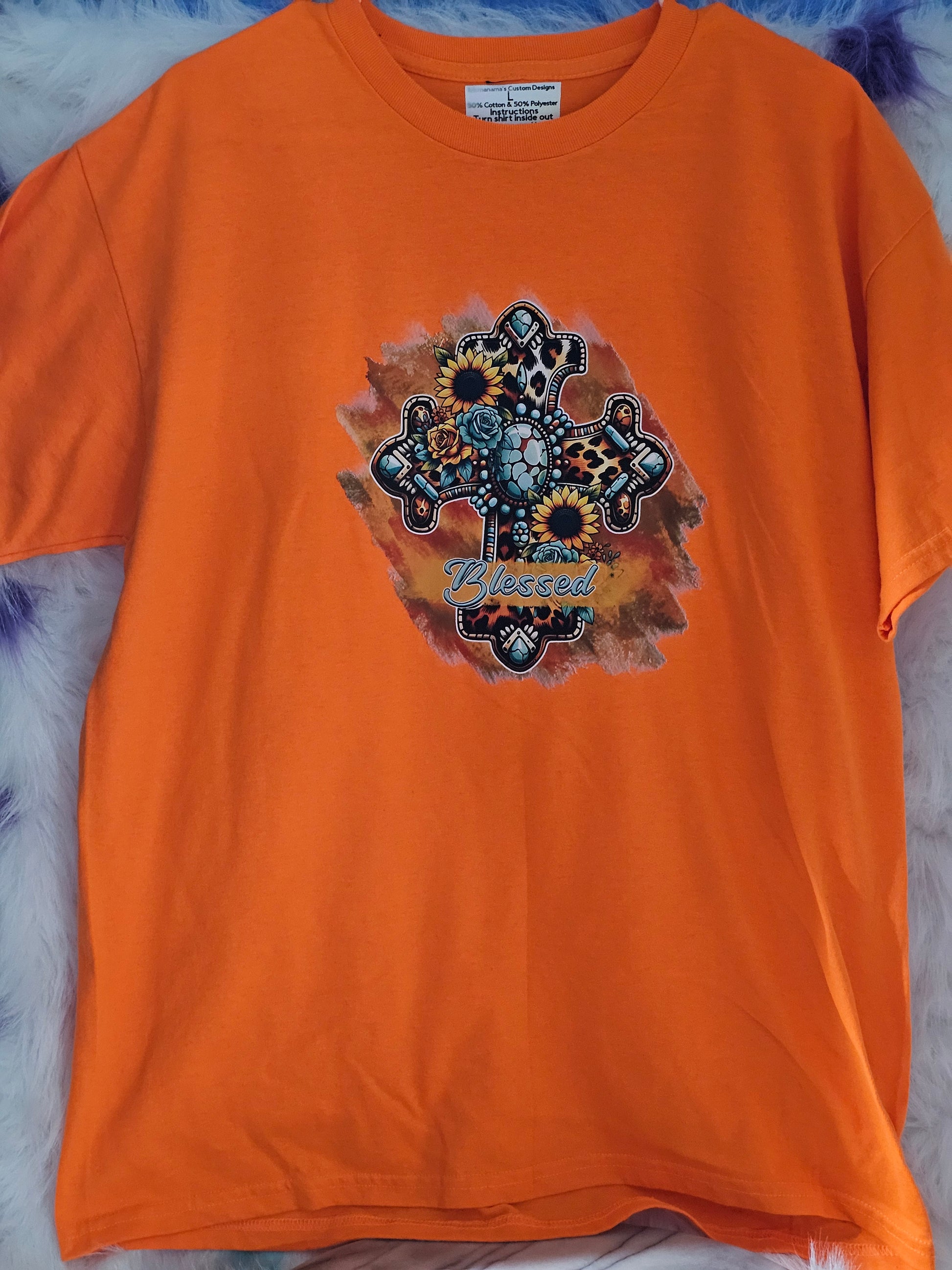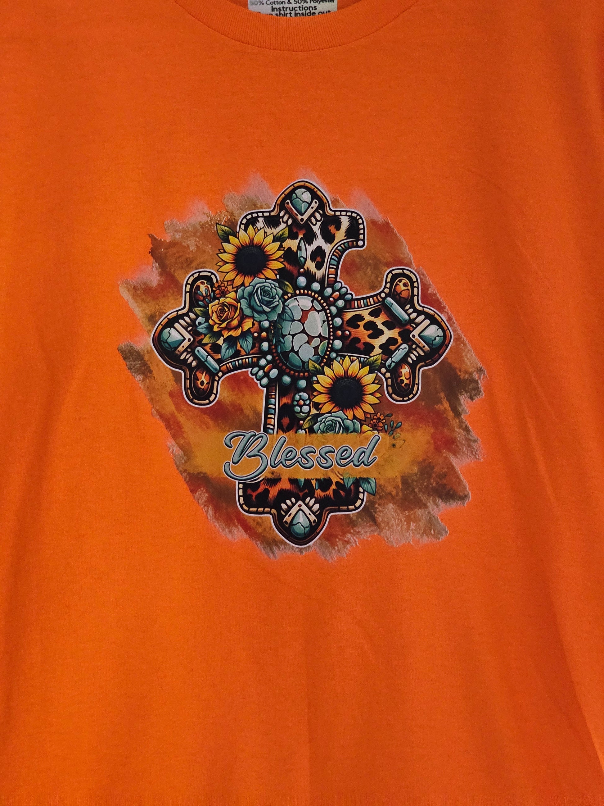 Size L 100% cotton Orange Blessed cross with sunflowers Tshirt