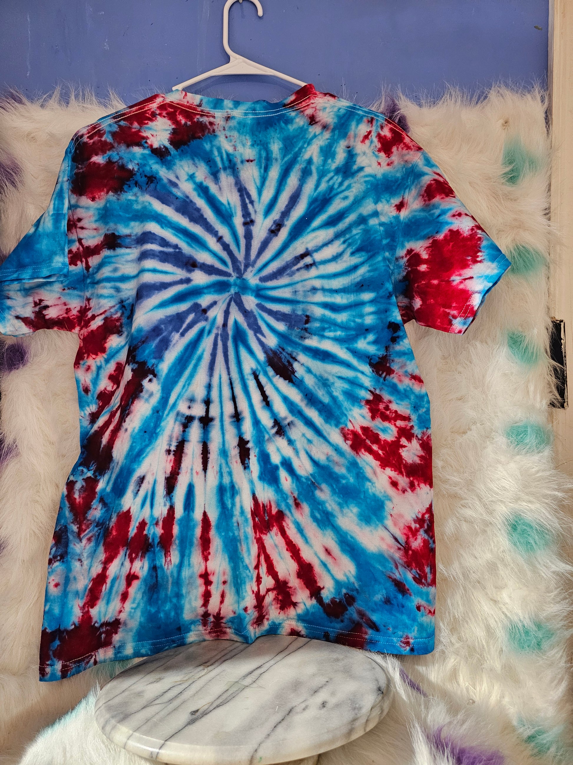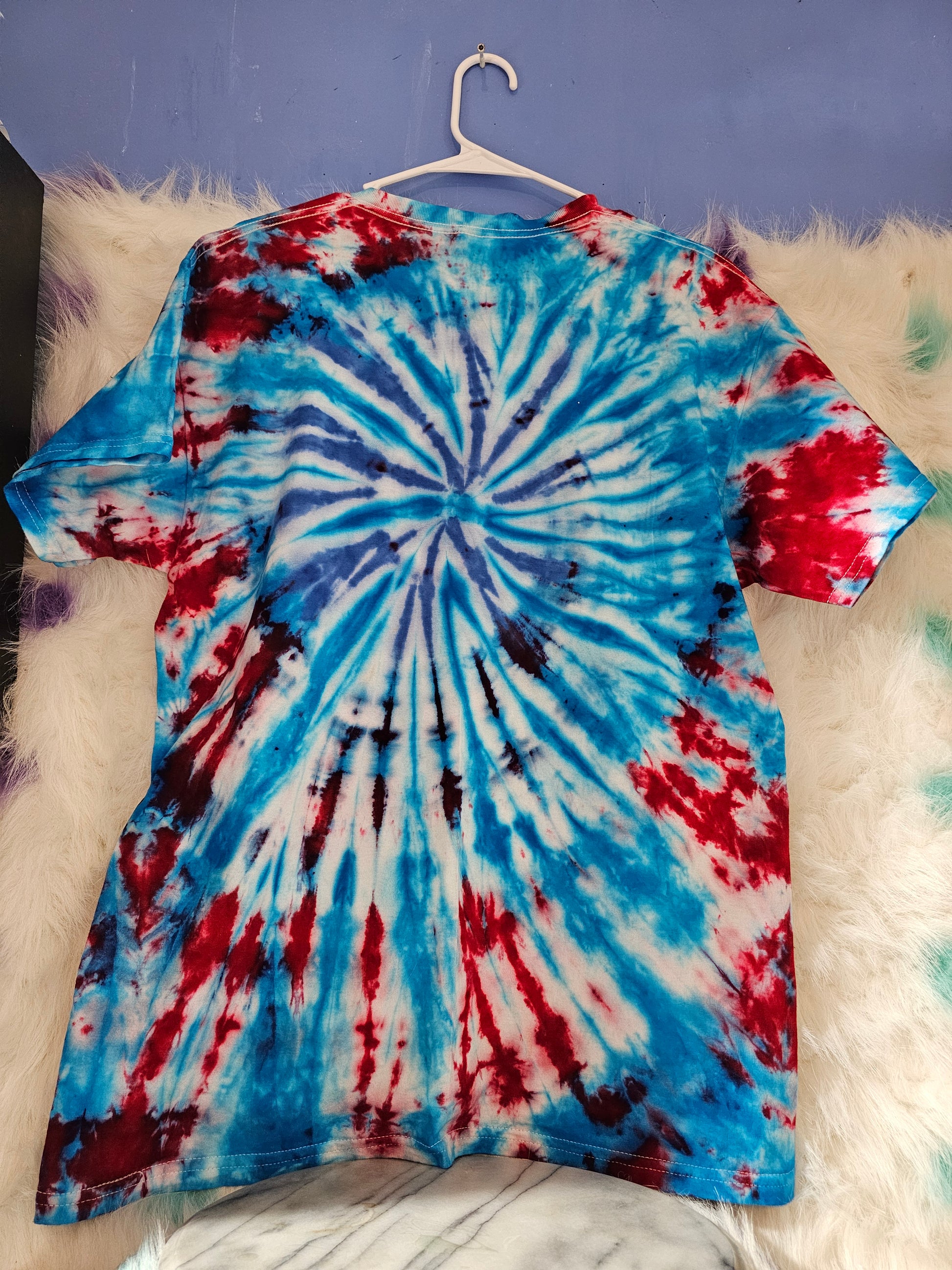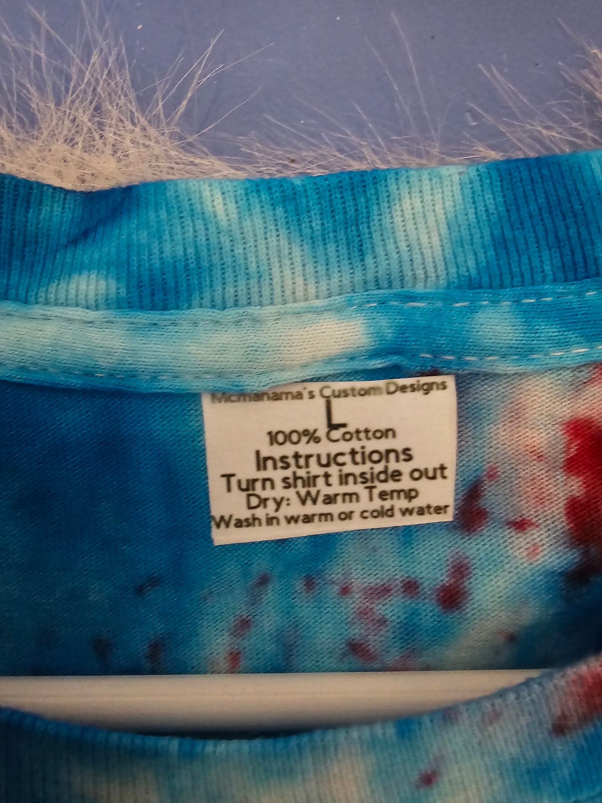 This size L t-shirt is made of 100% cotton and features a beautiful tie dye design with the words Peace, Love, and Freedom. The soft and breathable fabric ensures comfort while making a statement for peace, love, and freedom. Perfect for casual wear or to spread a positive message.Size L 100% cotton tye dye Peace, Love and freedom Tshirt. Washing instructions turn Shirt inside out and wash in cold or warm water and dry on low heat or air dry.DO NOT wash in Hot water.Your information is protected.