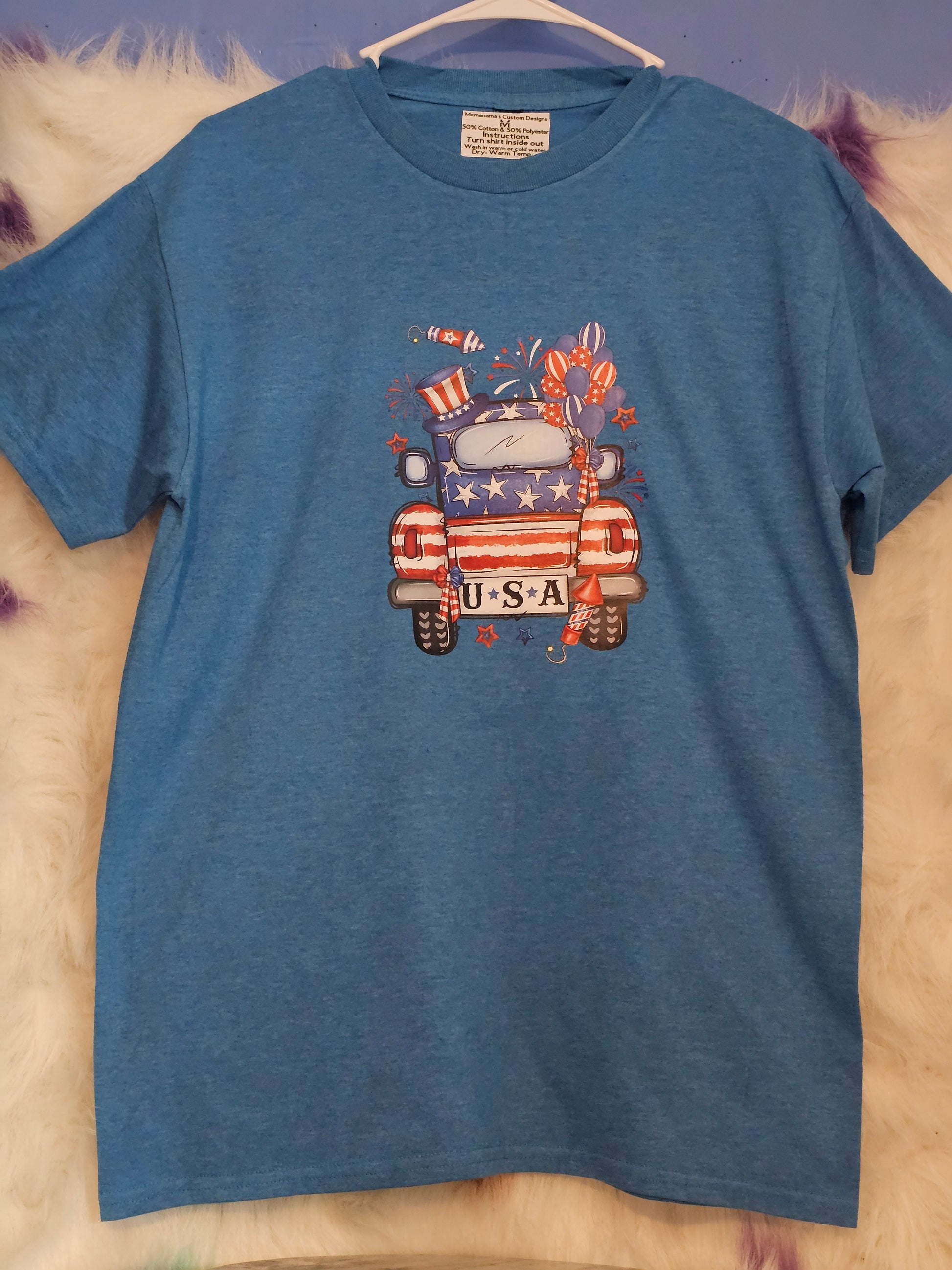 Experience comfort and style with our Size M Tshirt, made from a blend of 50% cotton and 50% polyester for a soft and durable feel. Show your pride and patriotism with the blue independence truck design. Perfect for any casual occasion. Get yours today!Size M 50%cotton 50%polyester blue independence truck Tshirt. Washing instructions turn Shirt inside out and wash in cold or warm water and dry on low heat or air dry. DO NOT wash in Hot water.Your information is protected.