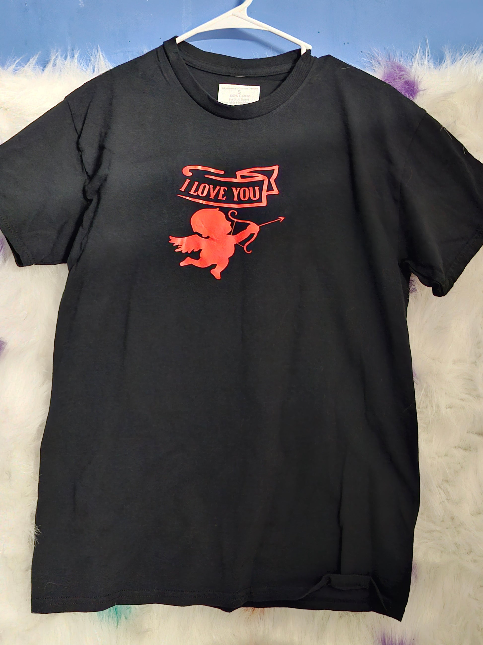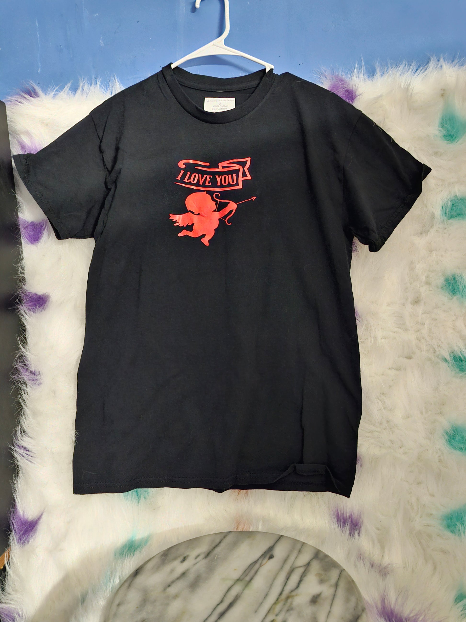 Size S 100% cotton black I love you cupid arrow tshirt. Washing instructions: Wash in cold water and turn Shirt inside out.Dry on low heat or air dry.DO NOT wash in Hot water.Your information is protected. I make different colors, sizes and designs. Text me at 678-209-6711 and let me know what color, size, and design you would like.