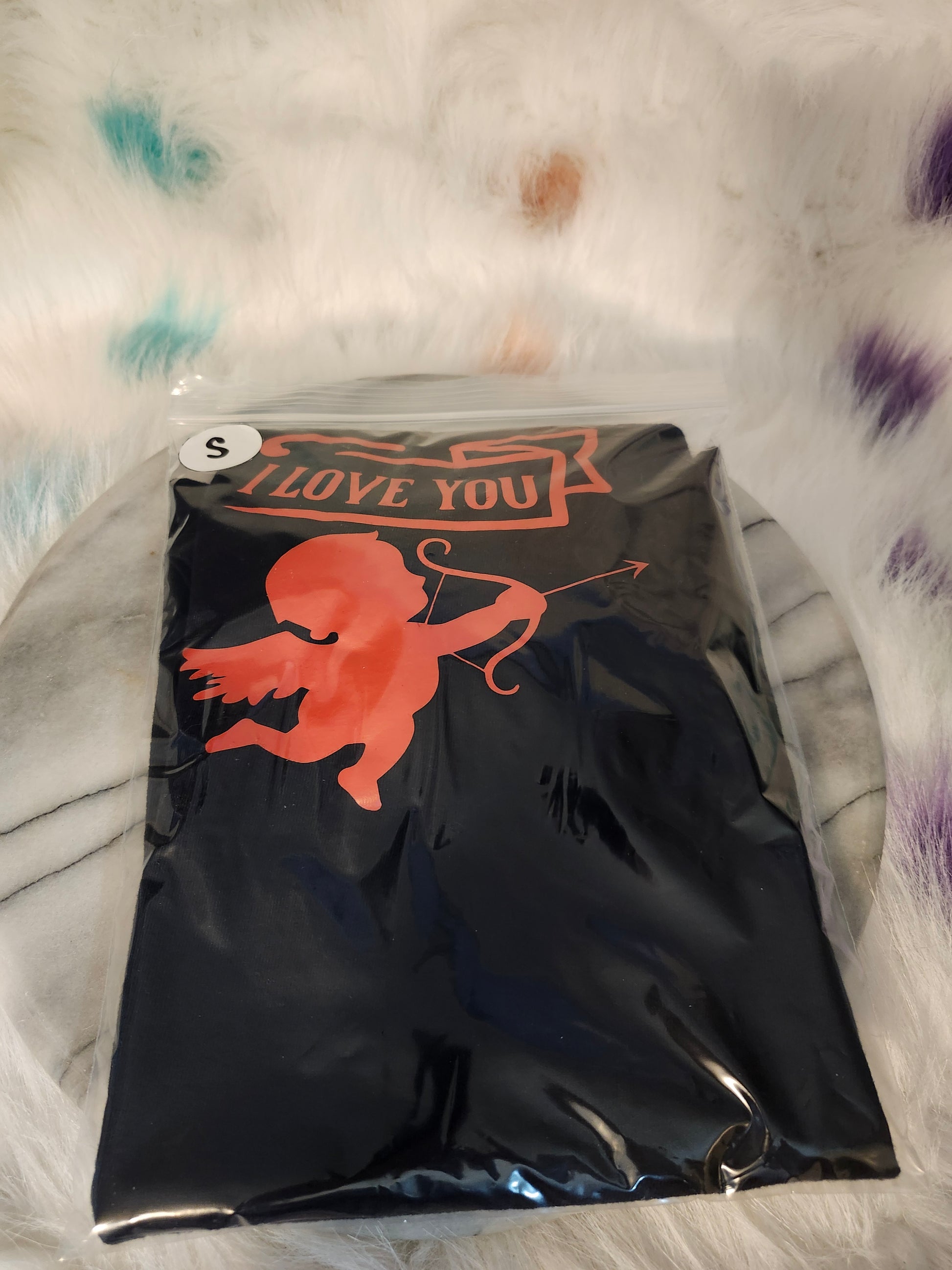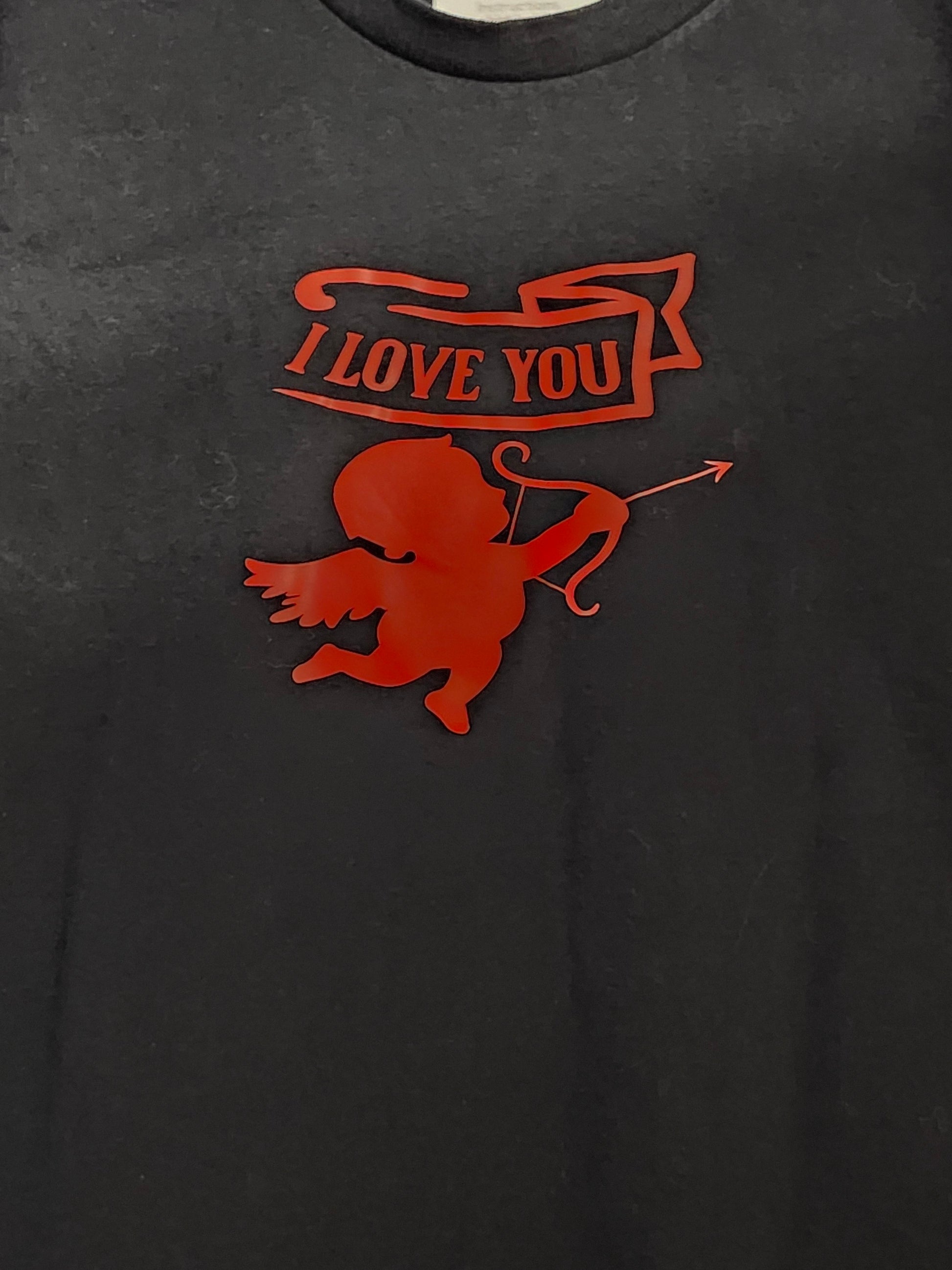 This size S 100% cotton black tshirt features an adorable cupid arrow design with the bold declaration of "I love you". Crafted with quality materials, this tshirt provides both comfort and style. Perfect for those looking to express their love in a fun and fashionable way.