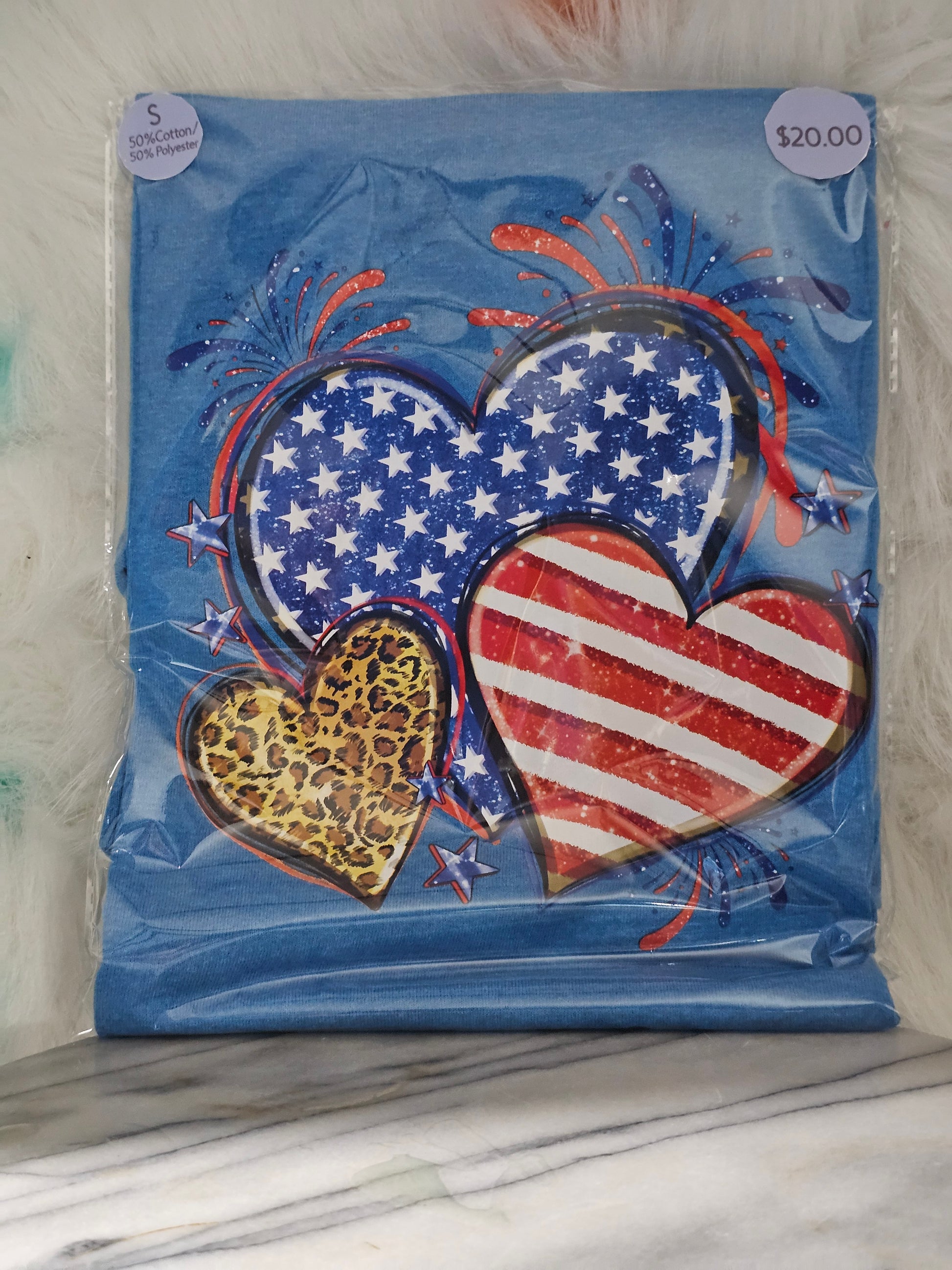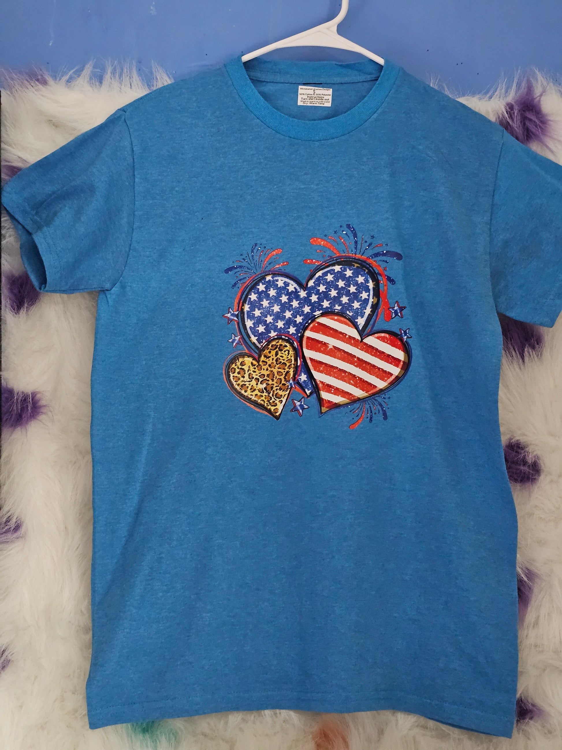 Size S 50% cotton 50%polyester Blue shirt with hearts