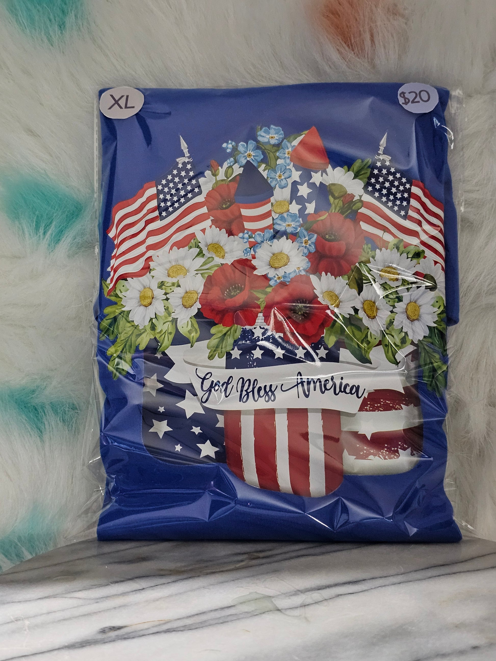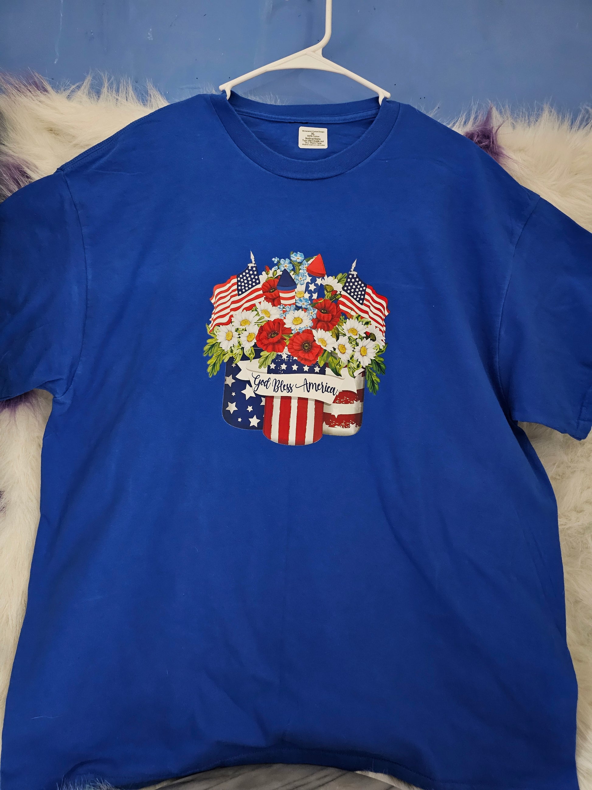 This blue God bless America Tshirt is made with 100% high-quality cotton, ensuring comfort and durability. Its size XL fits most people, offering a relaxed and comfortable fit. Show off your patriotism and fashion sense with this stylish and comfortable Tshirt.Size XL 100% cotton Blue God bless America Tshirt. Washing instructions turn Shirt inside out and wash in cold or warm water and dry on low heat or air dry.Your information is protected.